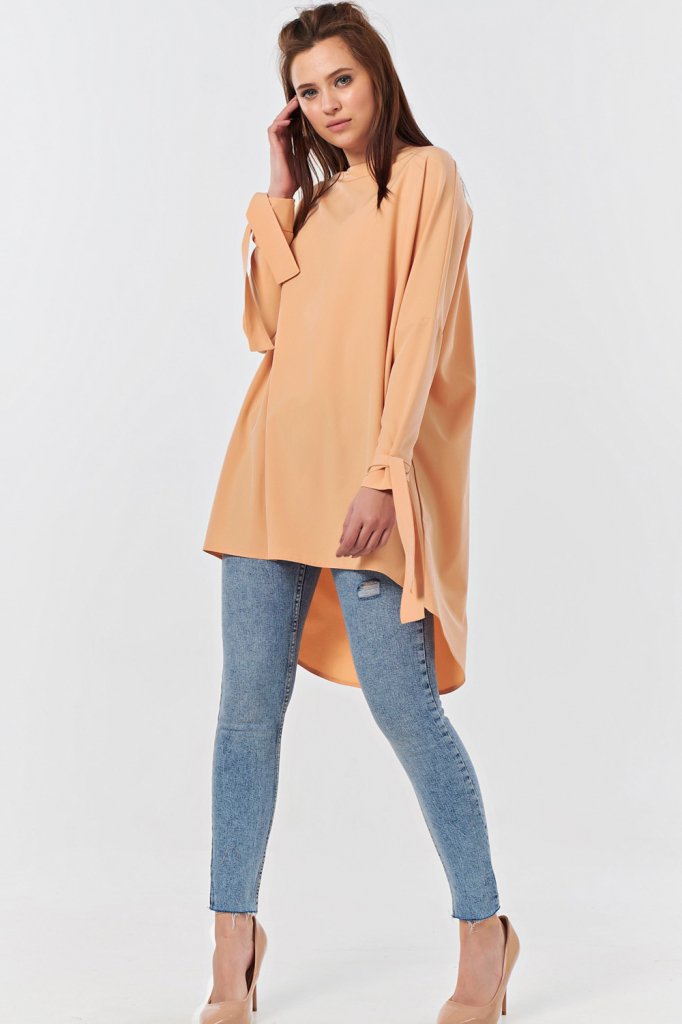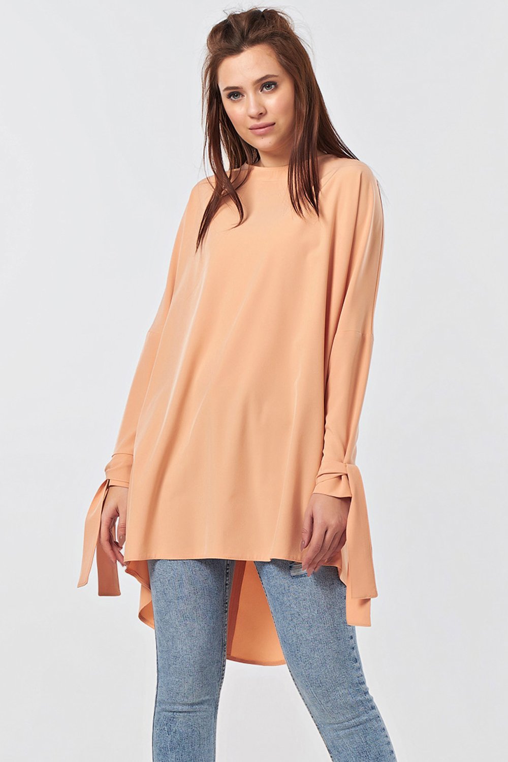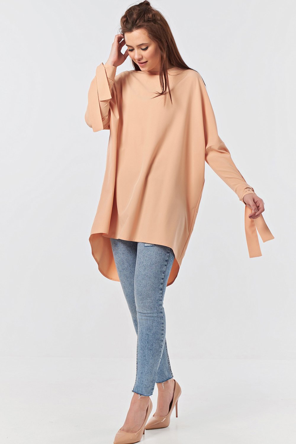 • Особенности: Блуза из тонкой блузочной ткани. Модель удлиненная свободного силуэта. Детали: сильно спущенная линия плеча рукава с притачной манжетой на манжетах декоративные завязки спинка удлинённая. Застежка на молнию в среднем шве спинки.