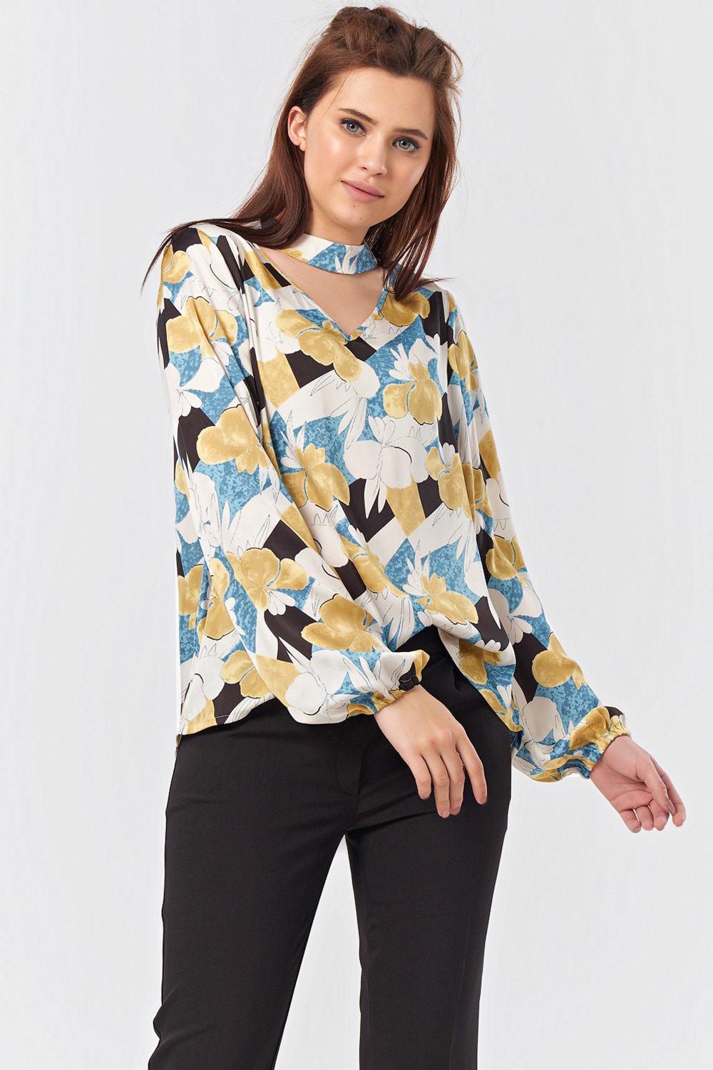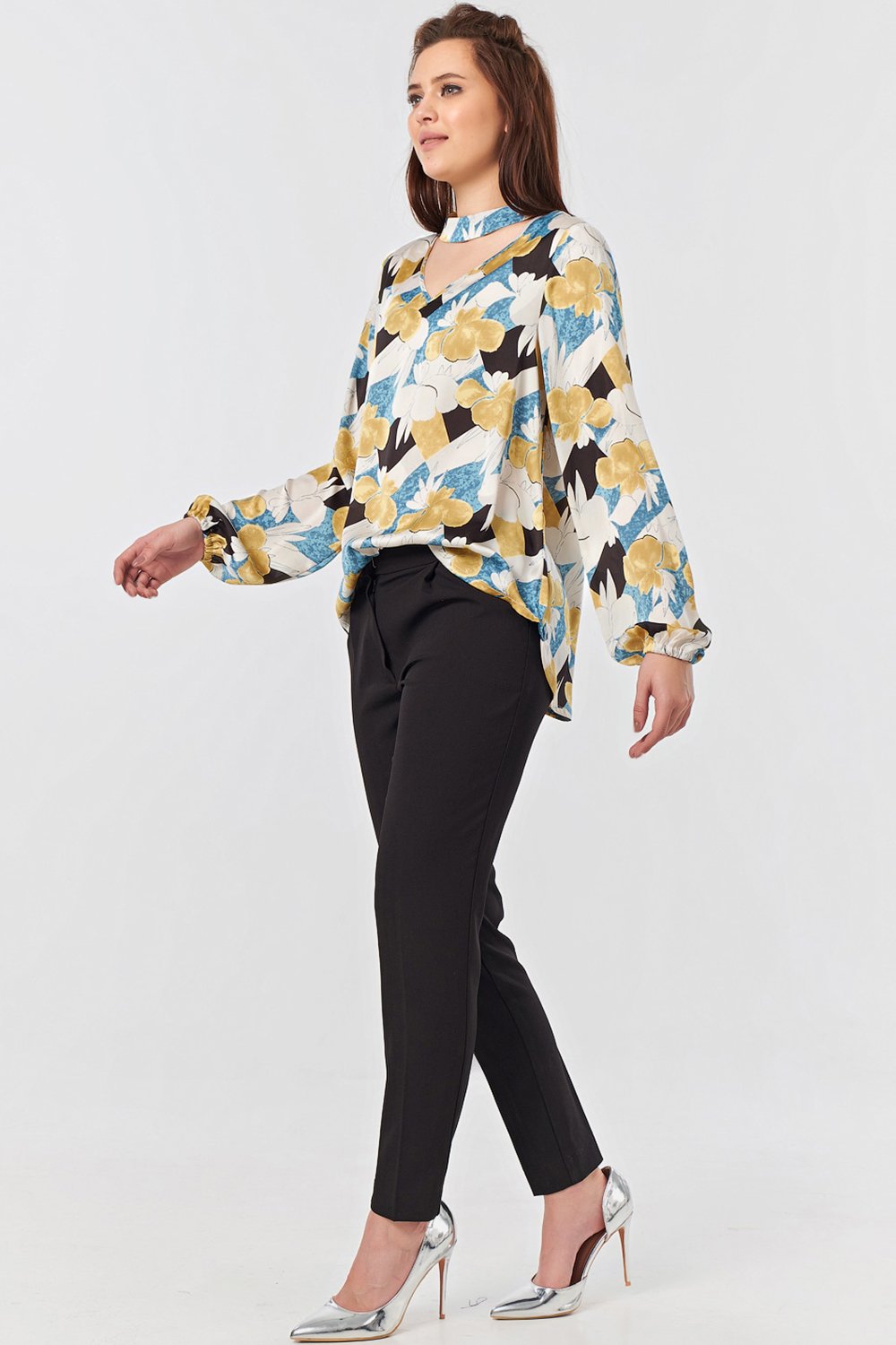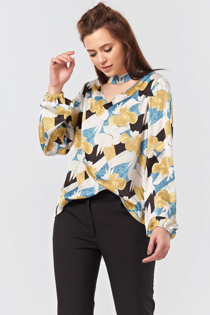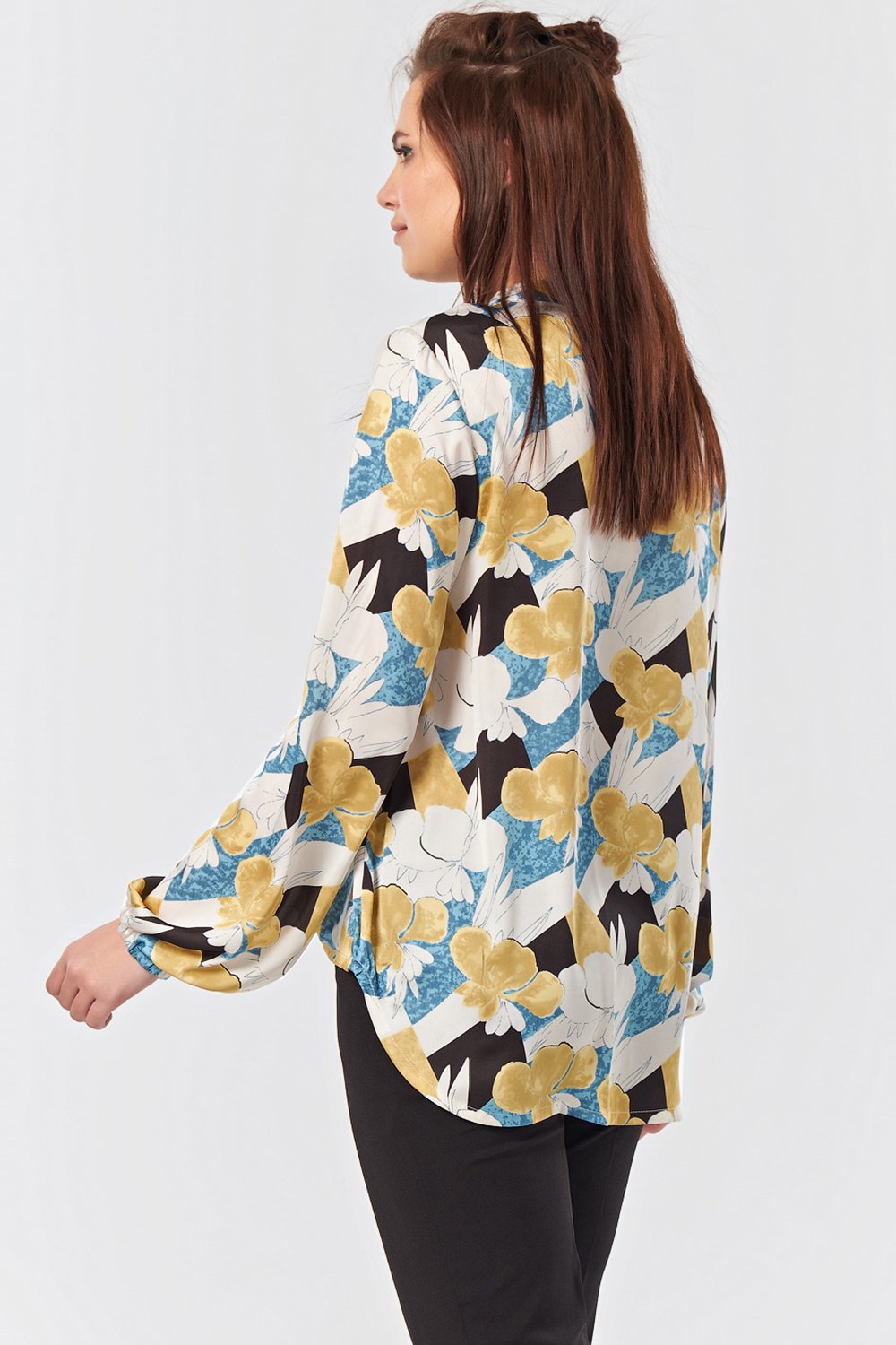 • Особенности: Блузка прямого силуэта из плотной шелковой ткани. Детали: спущенная линия плеча широкий рукав со сборкой на резину по низу горловина V-образной формы со стойкой типа чокер разный уровень переда и спинки. Застежка по спинке на петлю-пуговицу.