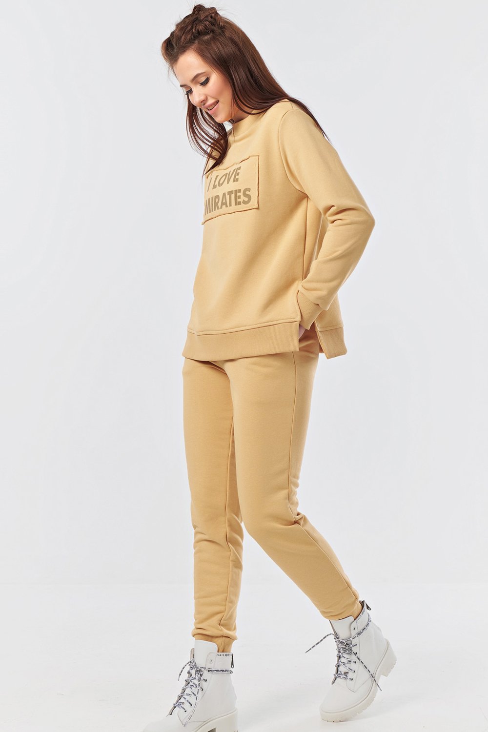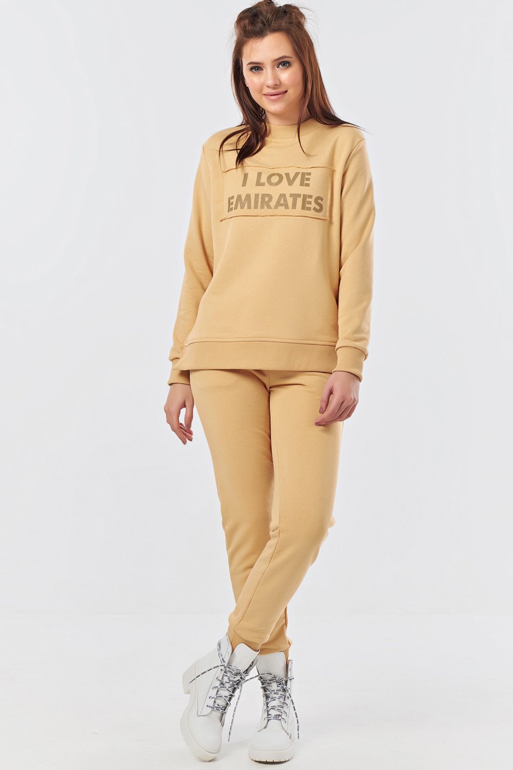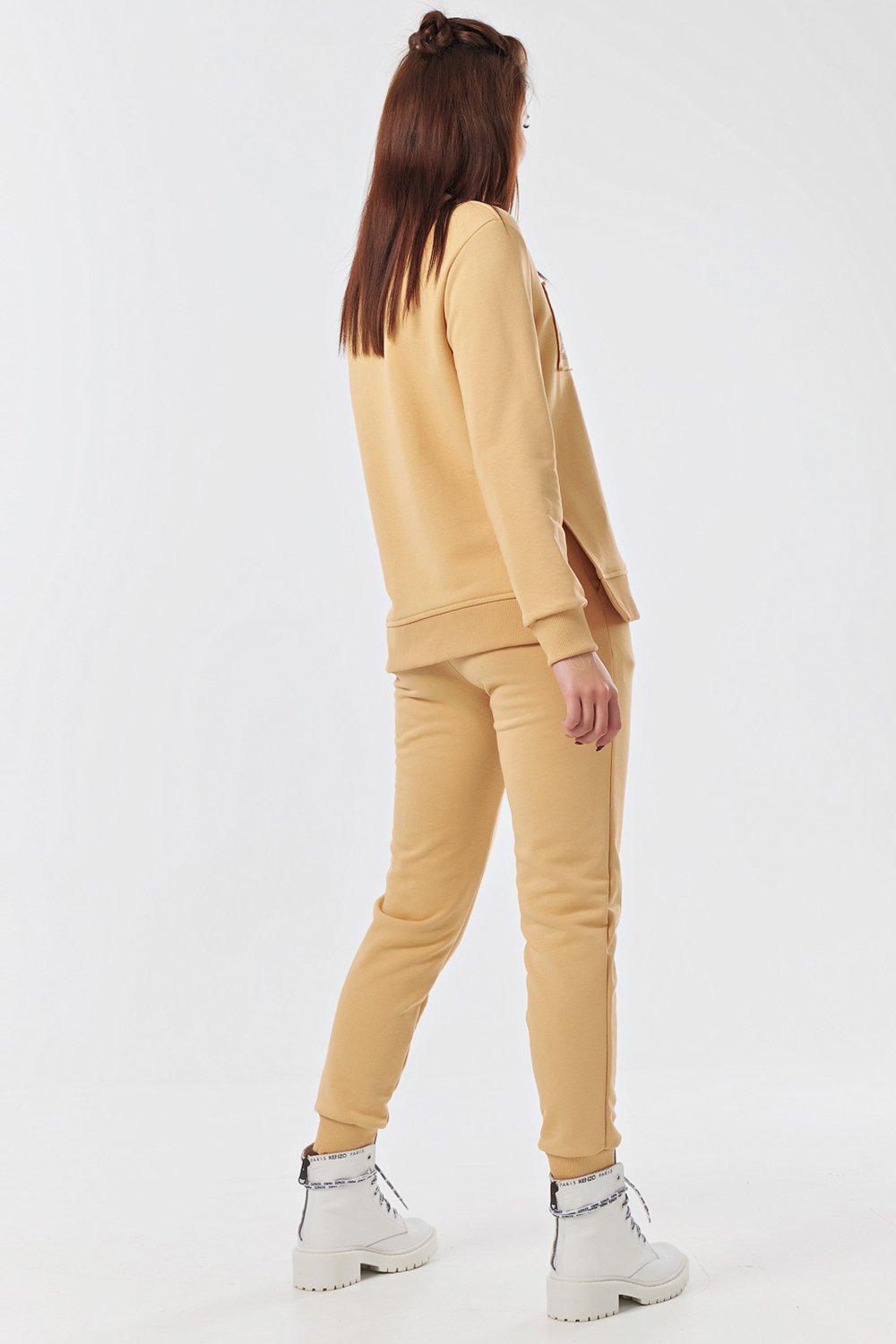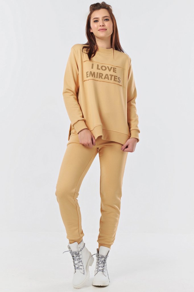 • Особенности: Костюм состоит из свитшота и брюк. Свитшот свободного силуэта. Детали: горловина обработана бейкой втачные рукава на манжете разрезы в боковых швах по переду выполнен принт. Брюки: полуприлегающего силуэта с брючными карманами притачным поясом и манжетами по низу.