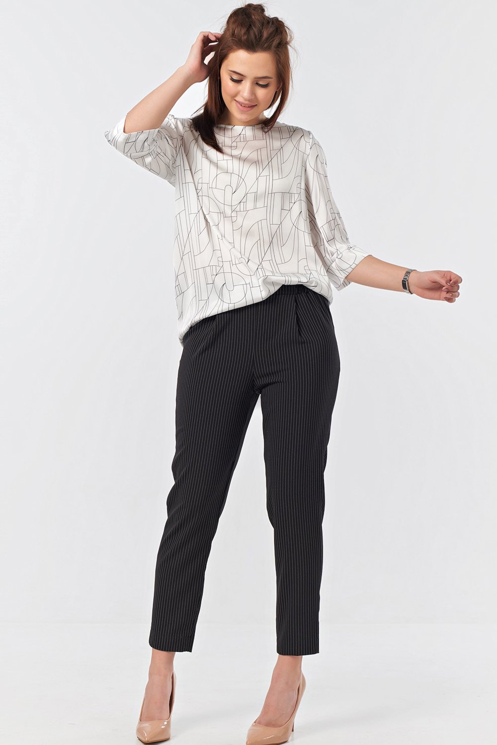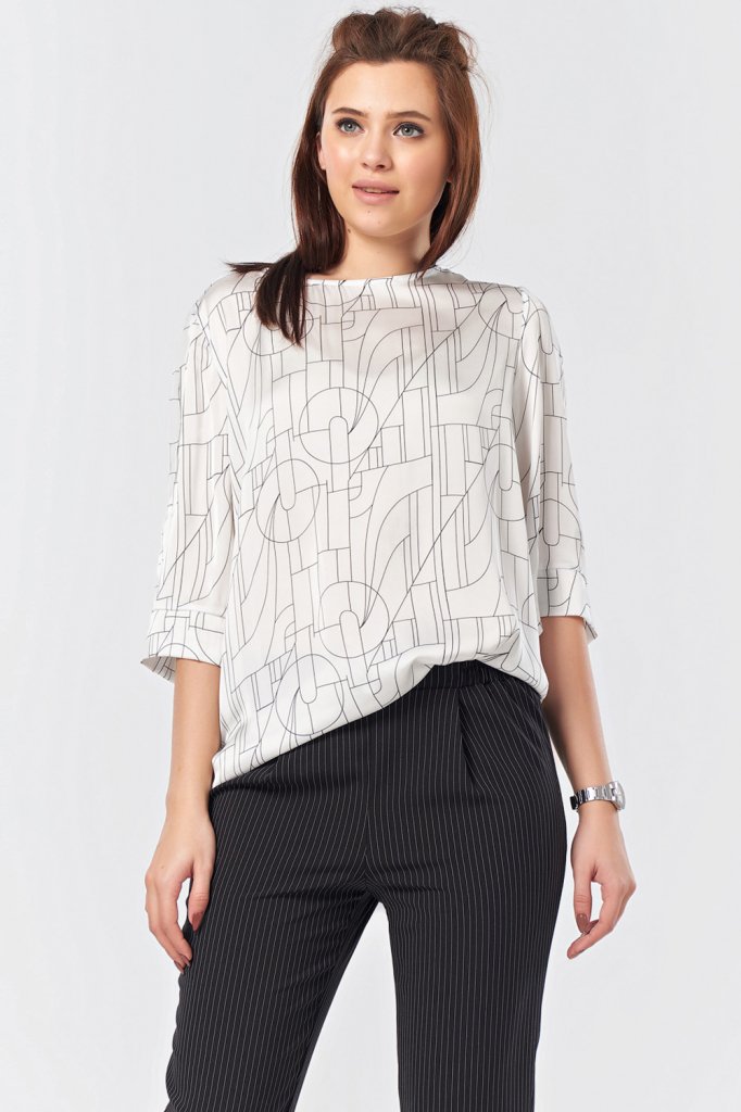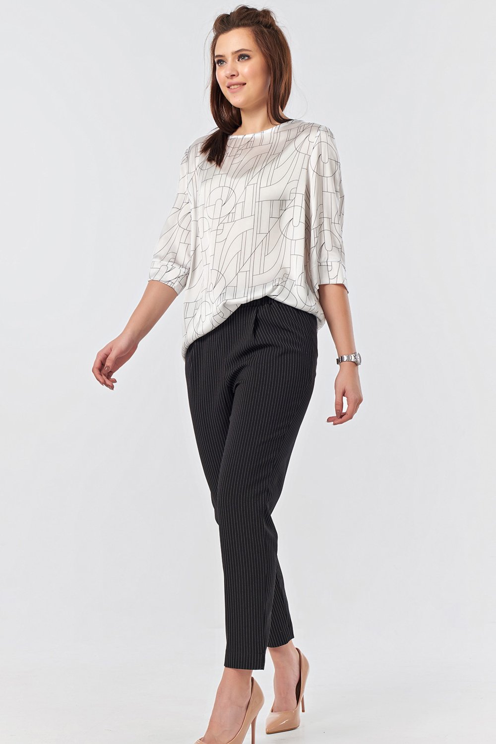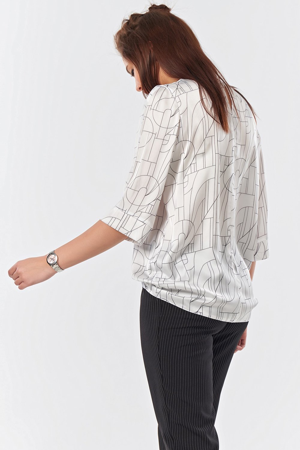 • Особенности: Блуза прямого силуэта из легкой блузочной ткани. Детали: горловина обработана косой бейкой широкий прямой рукав с притачной манжетой. Застежка на петлю пуговицу в среднем шве спинки.