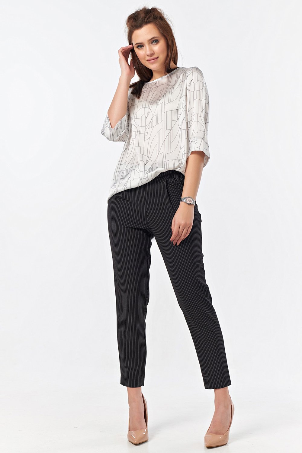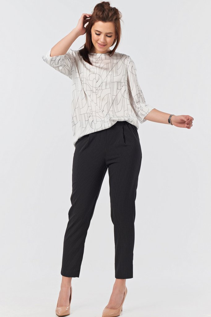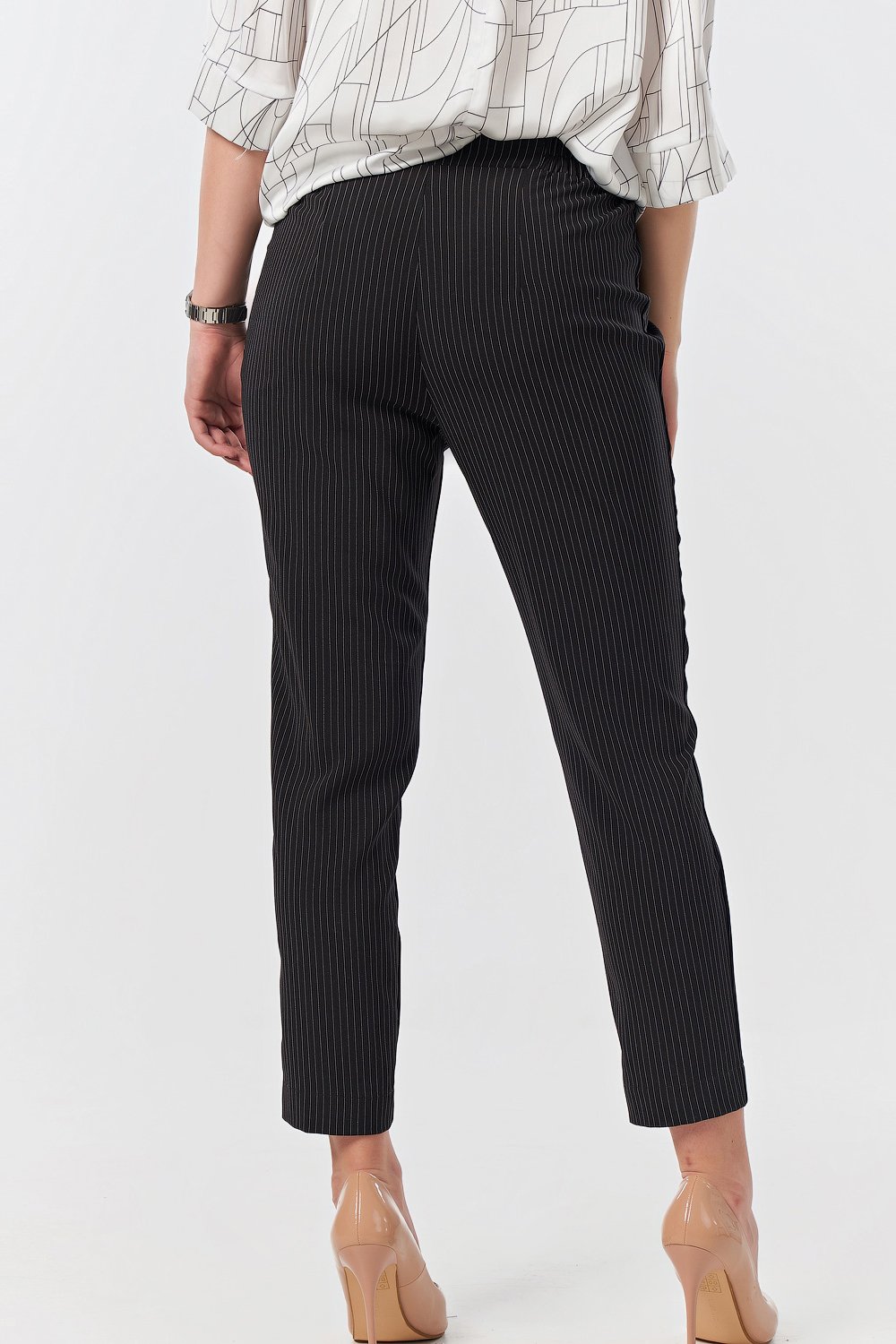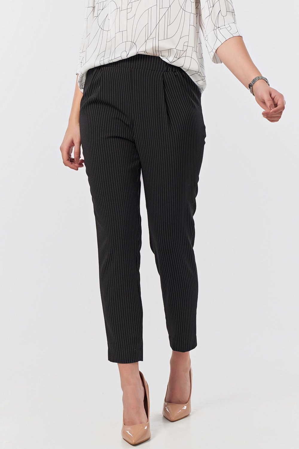 • Особенности: Брюки полуприлегающего силуэта из костюмной ткани в полоску. Детали: притачной пояс с резинкой в боковых вставках защипы зауженный книзу силуэт.