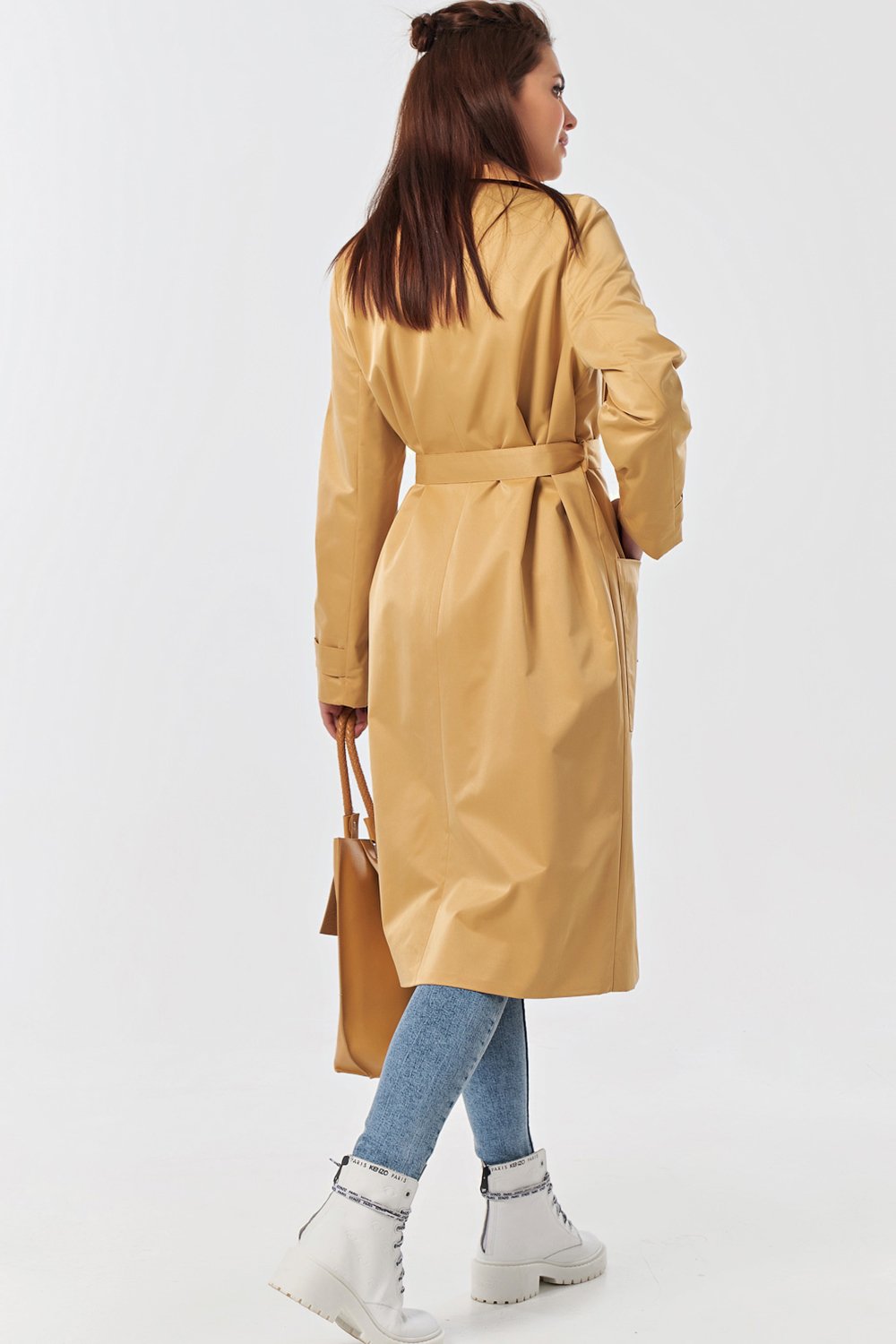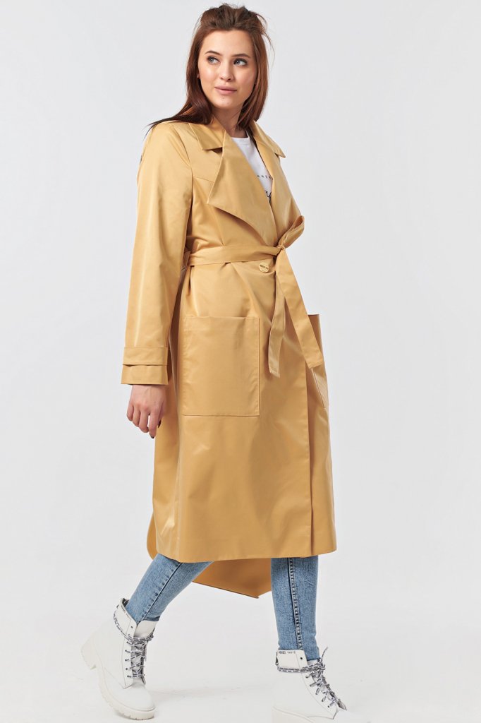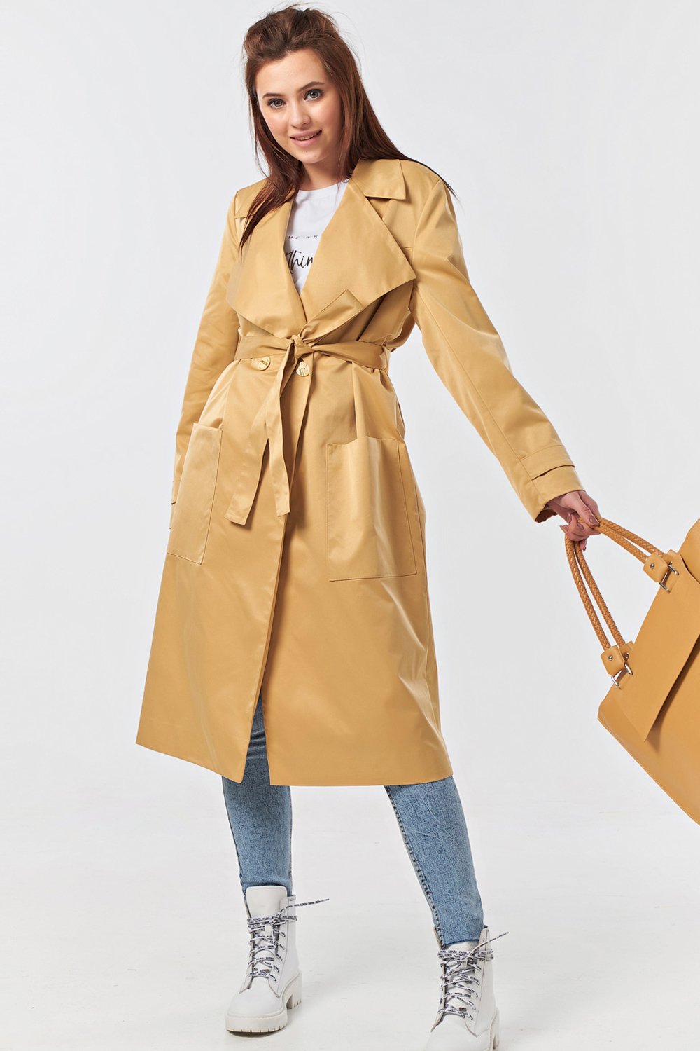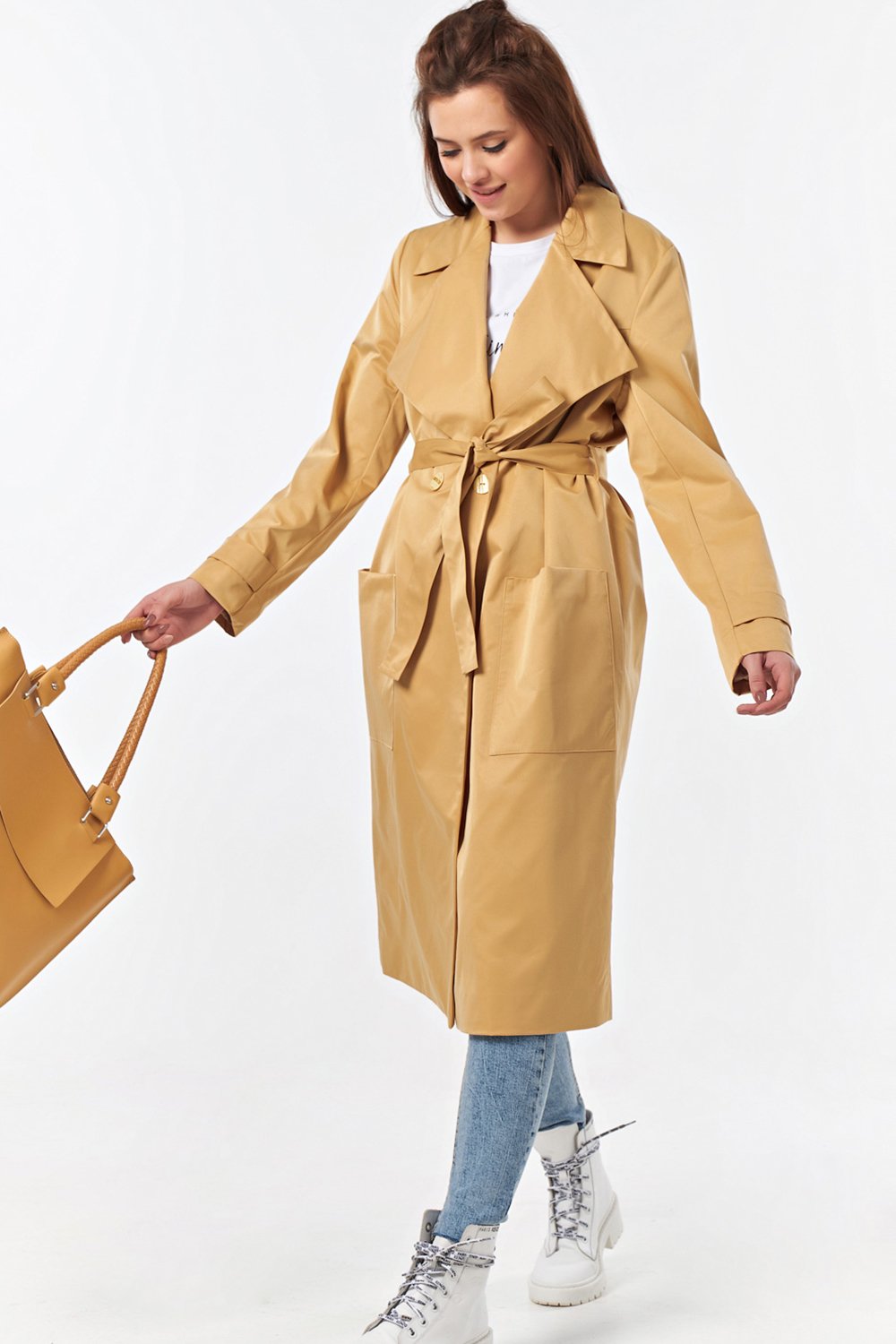 • Особенности: Плащ из плотной плащевой ткани. Детали: отложной воротник с фигурными лацканами. Втачной рукав с хлястиком по низу. Накладные карманы застежка на петли-пуговицы пояс в комплекте.