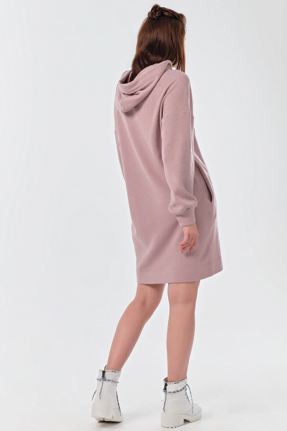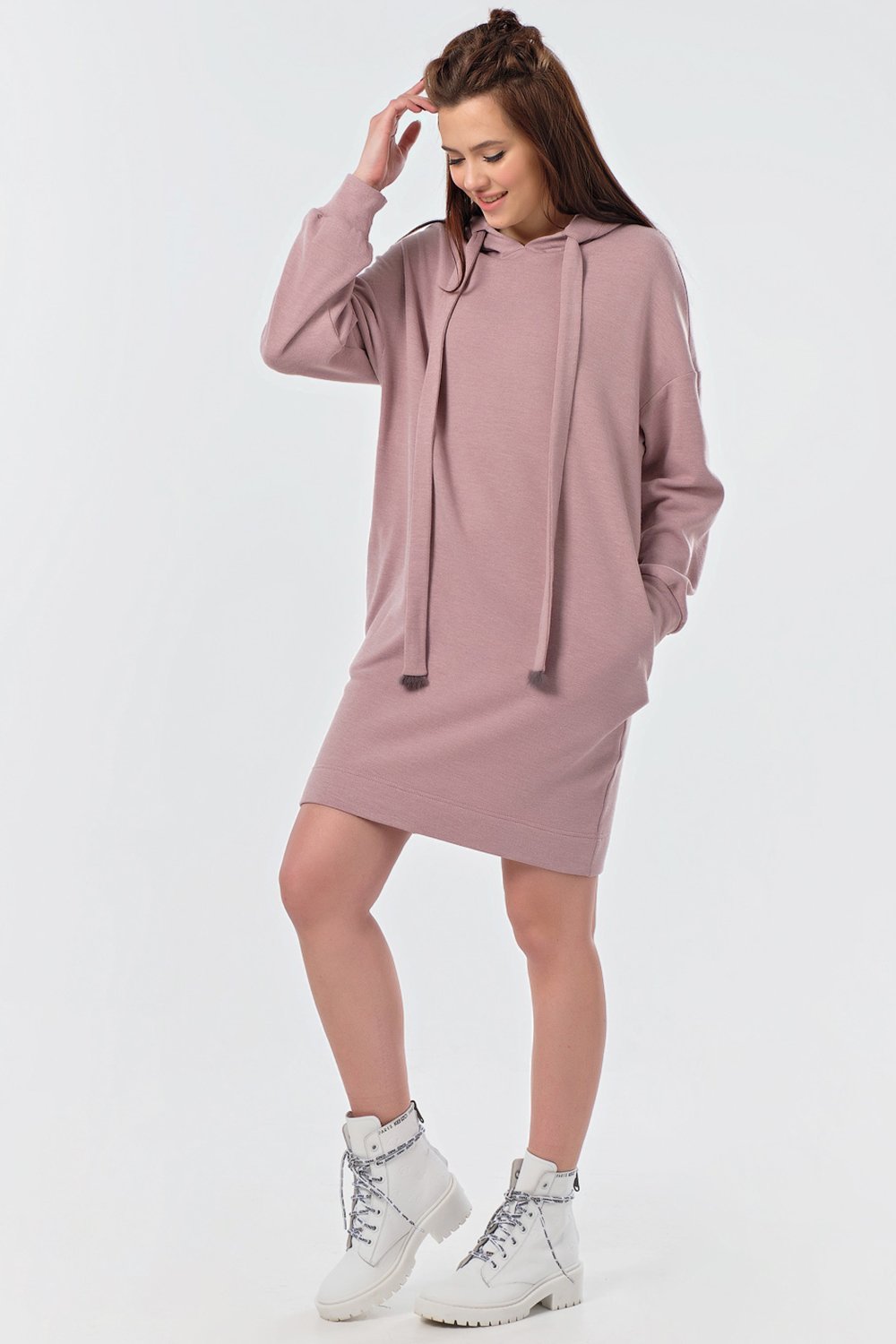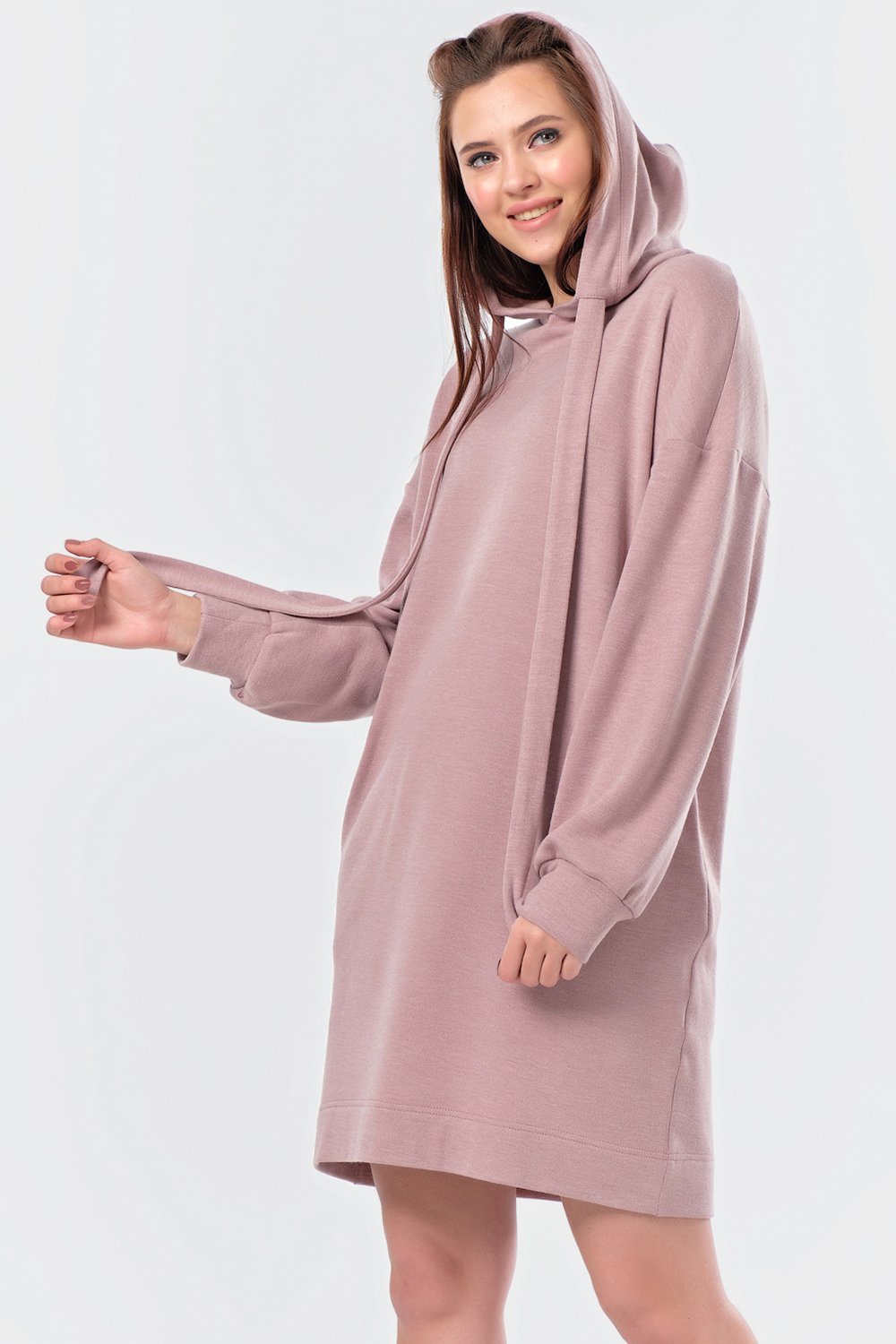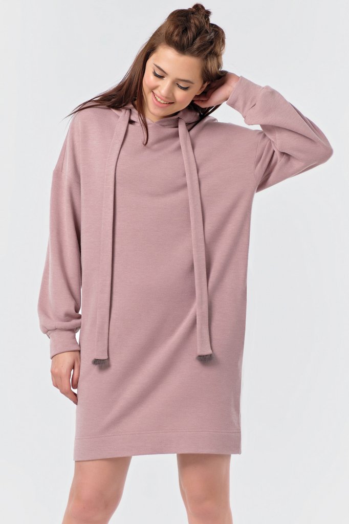 • Особенности: Платье из мягкого теплого трикотажа. Детали: капюшон с широкими завязками декорированными мехом; спущенный рукав на манжете карманы в боковых швах.