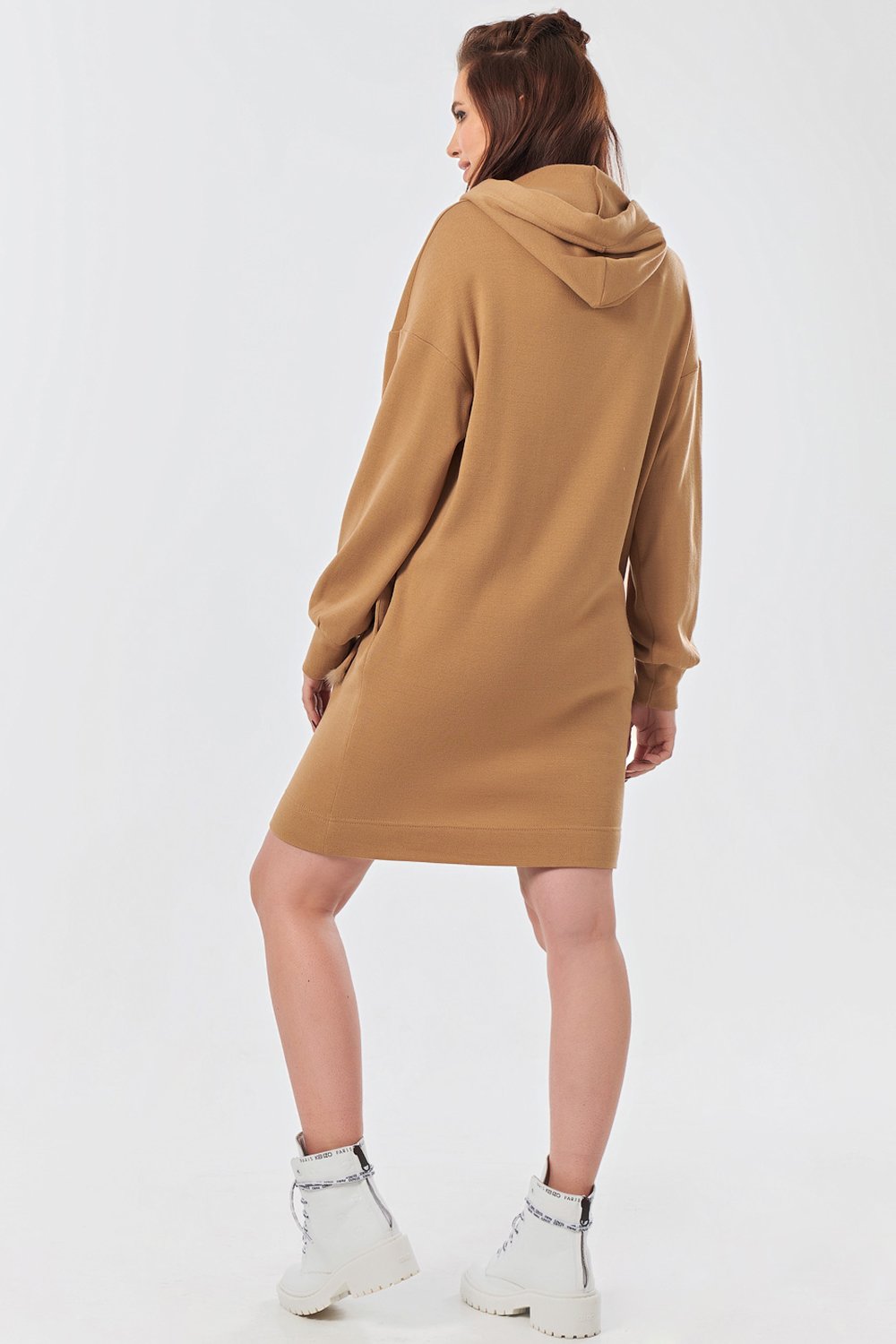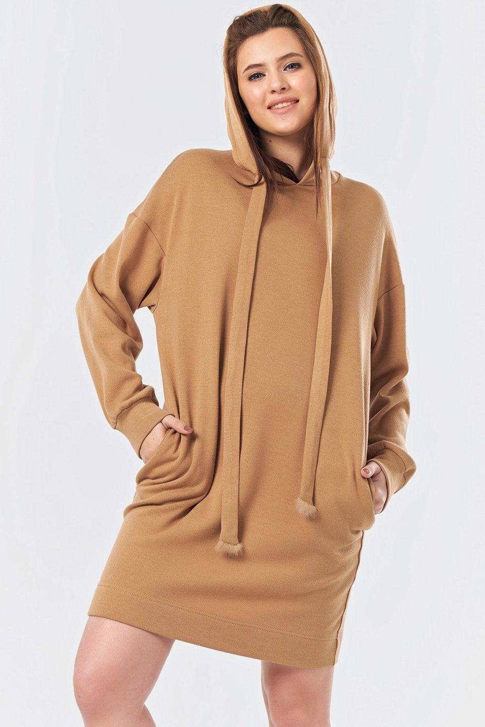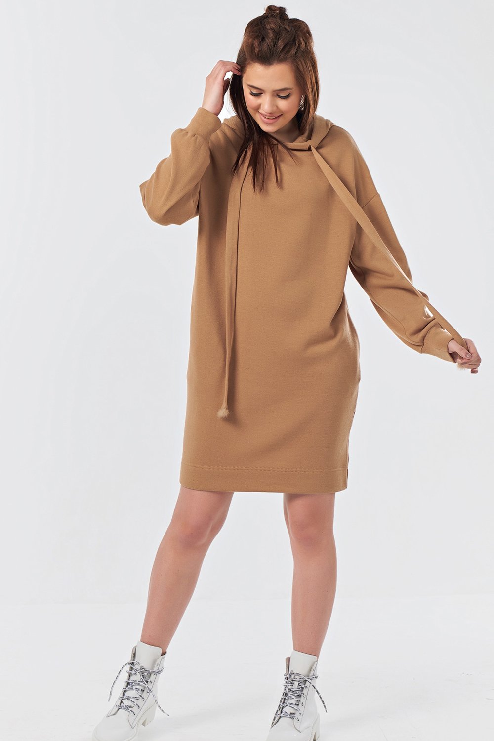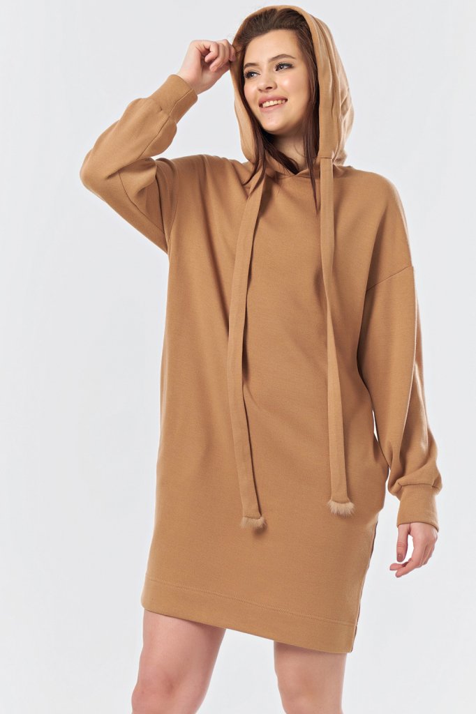 • Особенности: Платье из мягкого теплого трикотажа. Детали: капюшон с широкими завязками декорированными мехом; спущенный рукав на манжете карманы в боковых швах.