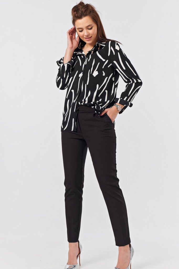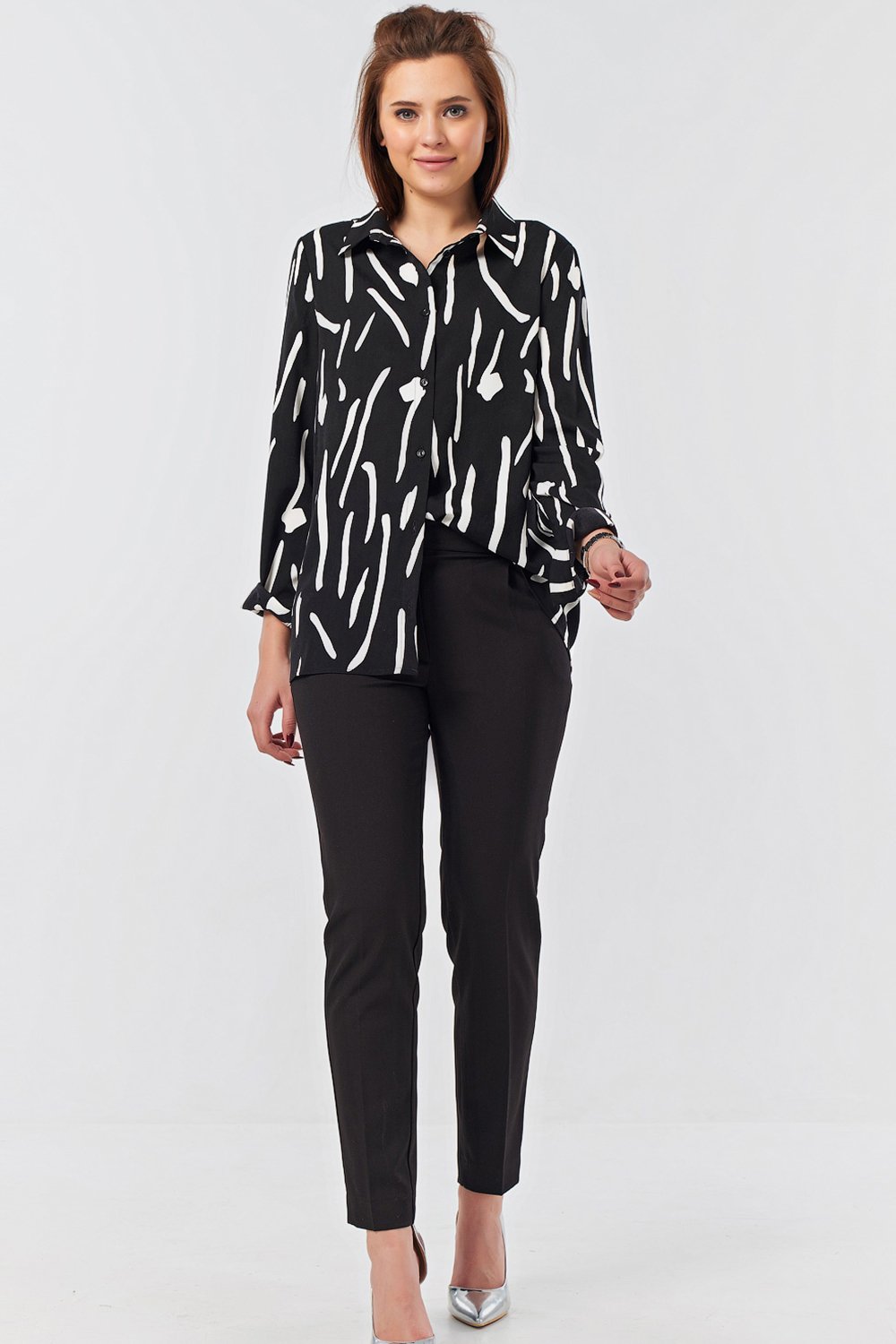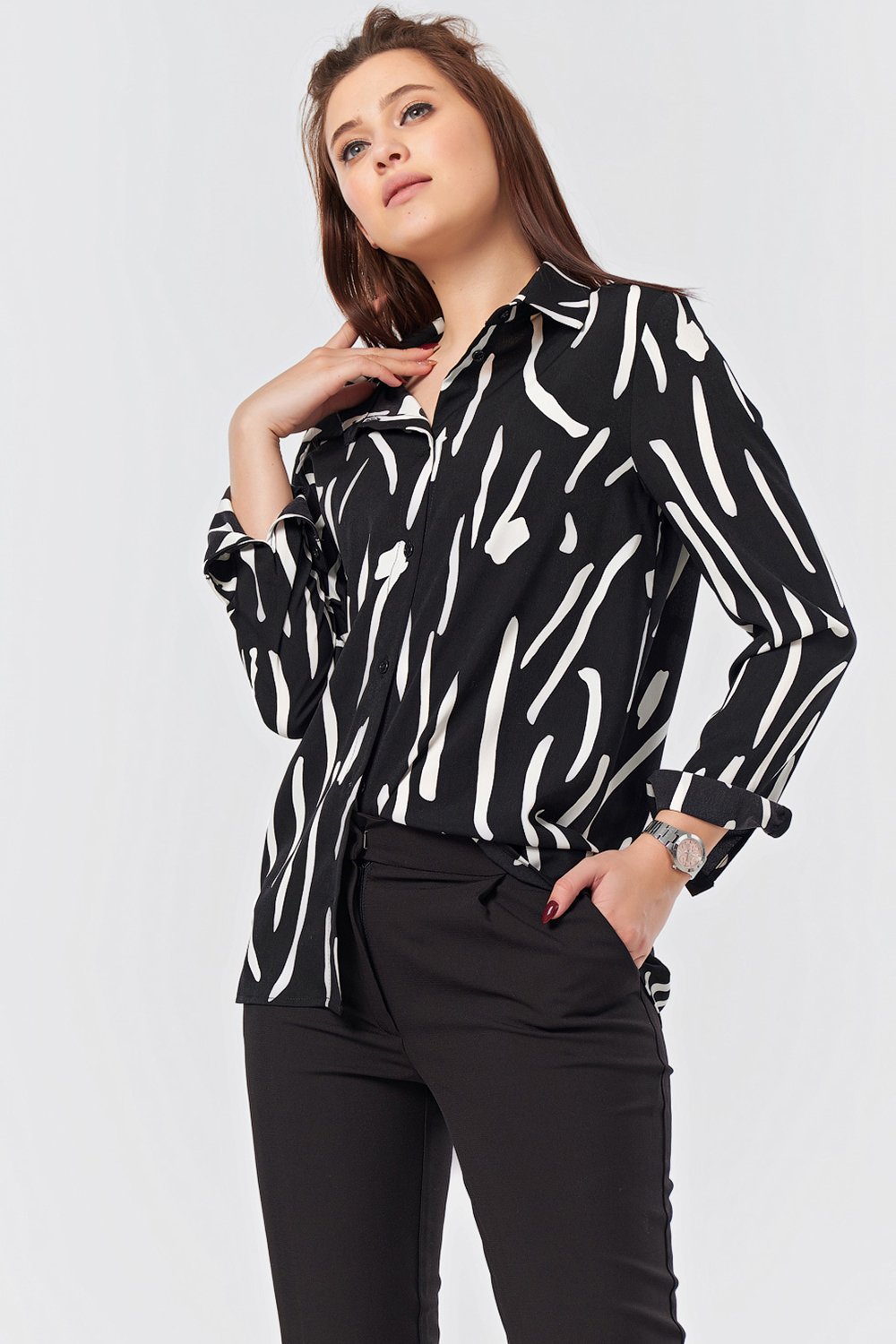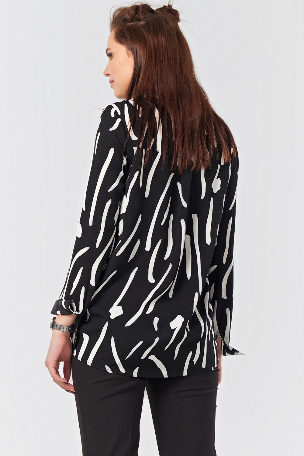 • Особенности: Блуза-рубашка из креповой блузочной ткани с принтом. Отложной воротник планка с застежкой на петли и пуговицы втачной рукав на манжете по спинке - кокетка.