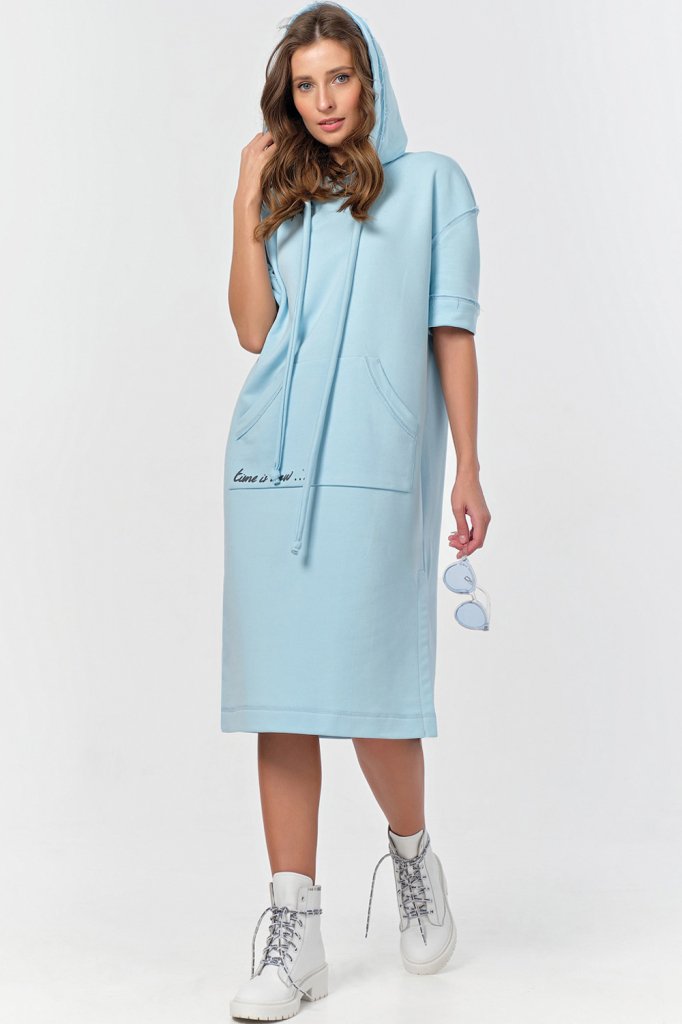 • Особенности: Платье из трикотажа-футера с капюшоном. Детали: капюшон с длинными завязками накладной карман с принтом разрез в боковом шве. Швы по карману и рукаву выполнены с открытым срезом.