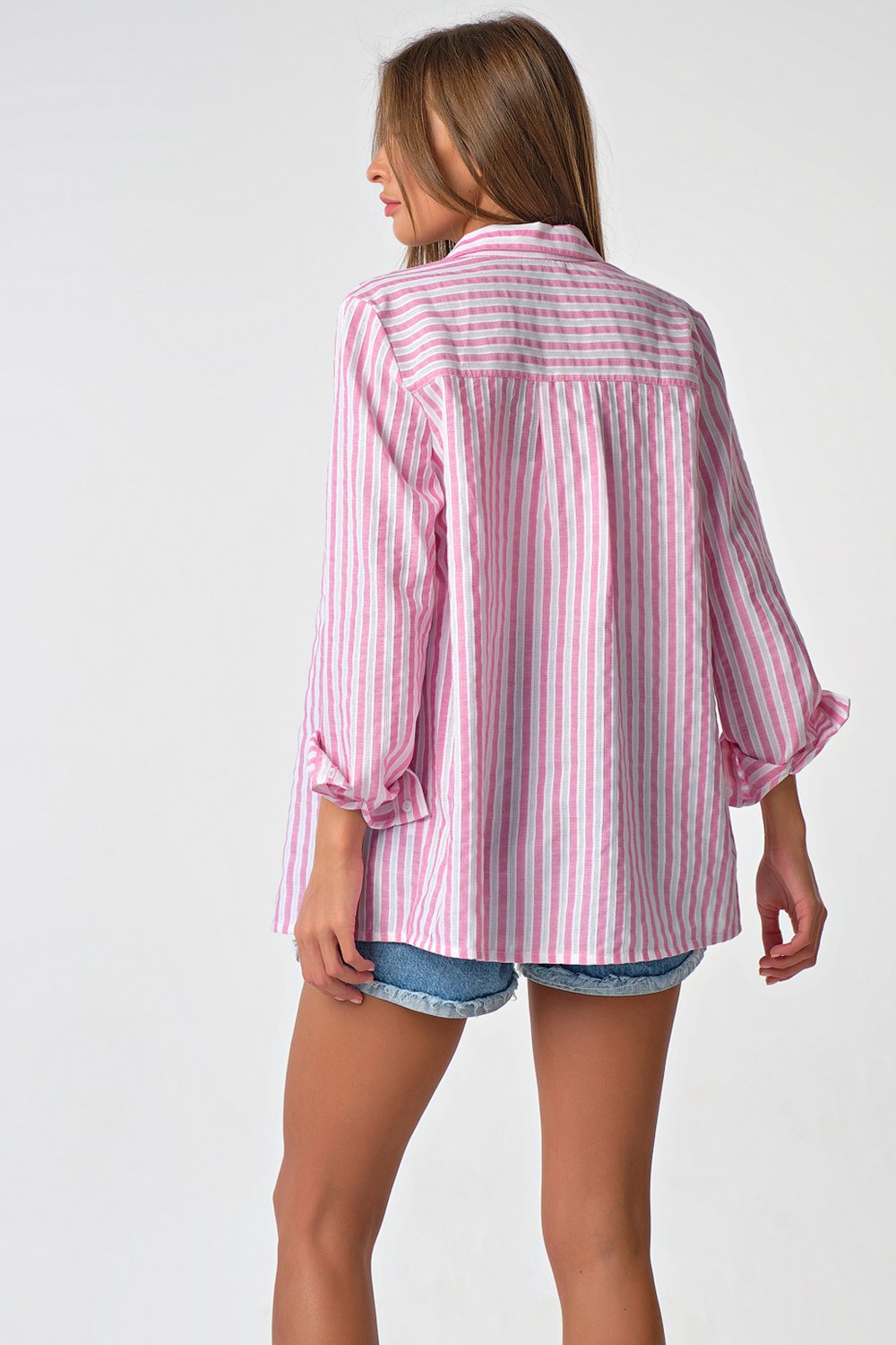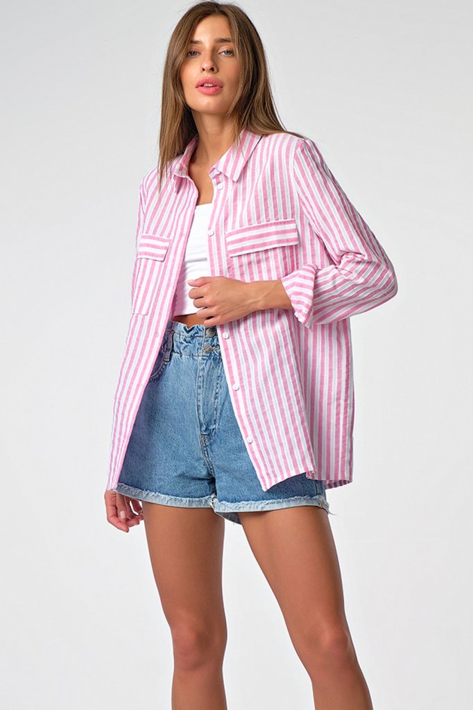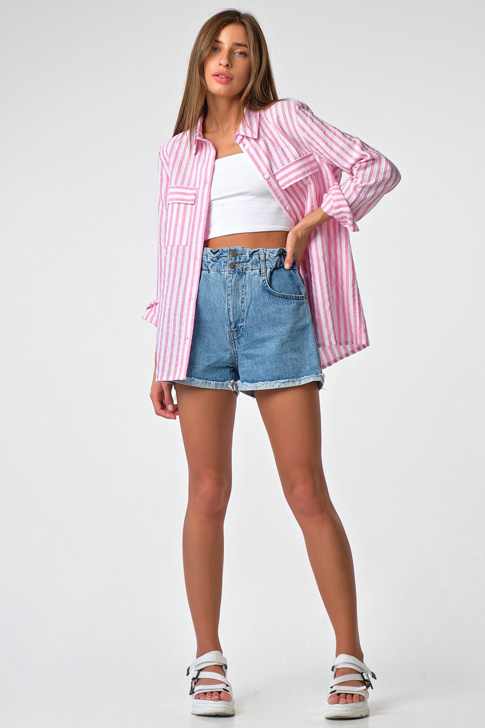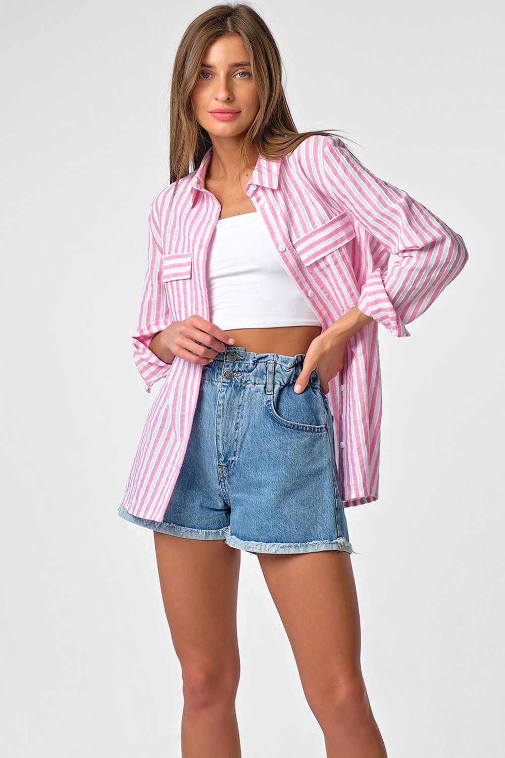 • Особенности: Рубашка из хлопковой фактурной ткани в полоску (мережка). Детали: отложной воротник на стойке планка с застежкой на петли и пуговицы накладные карманы с клапанами. Втачной рукав с рубашечной проймой на манжете.