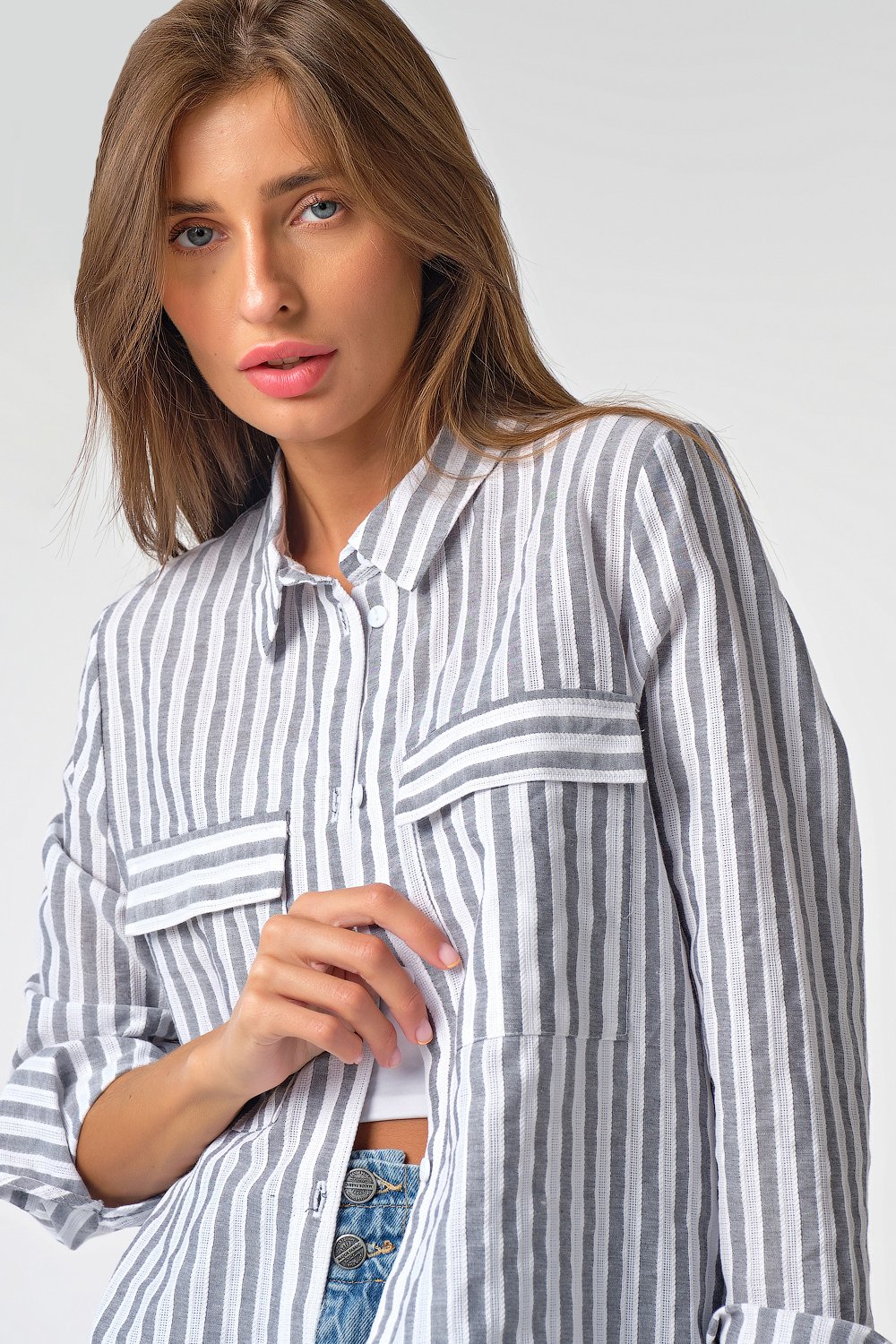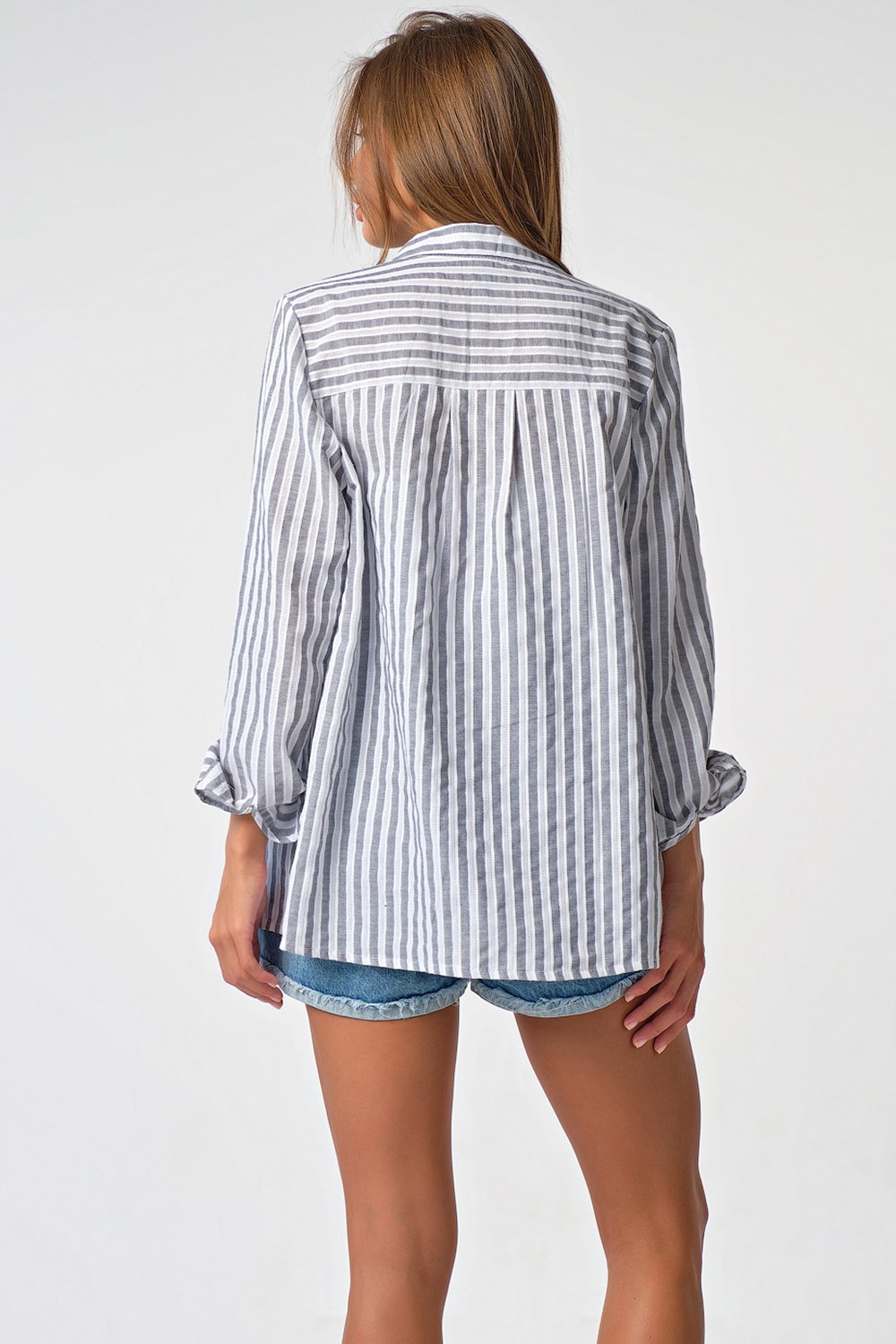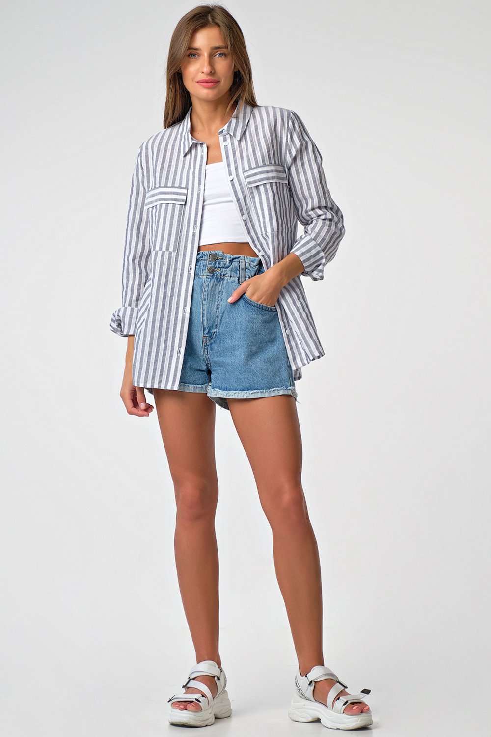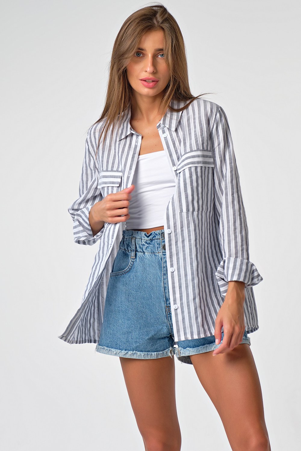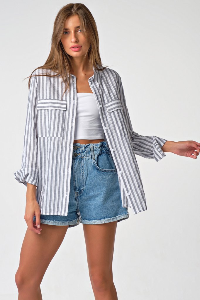 • Особенности: Рубашка из хлопковой фактурной ткани в полоску (мережка). Детали: отложной воротник на стойке планка с застежкой на петли и пуговицы накладные карманы с клапанами. Втачной рукав с рубашечной проймой на манжете.