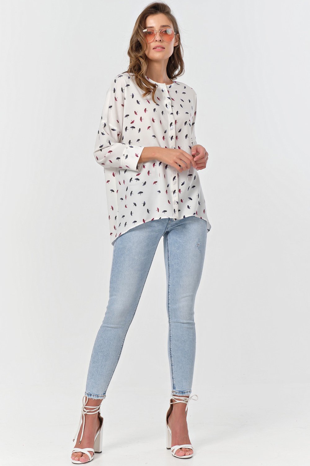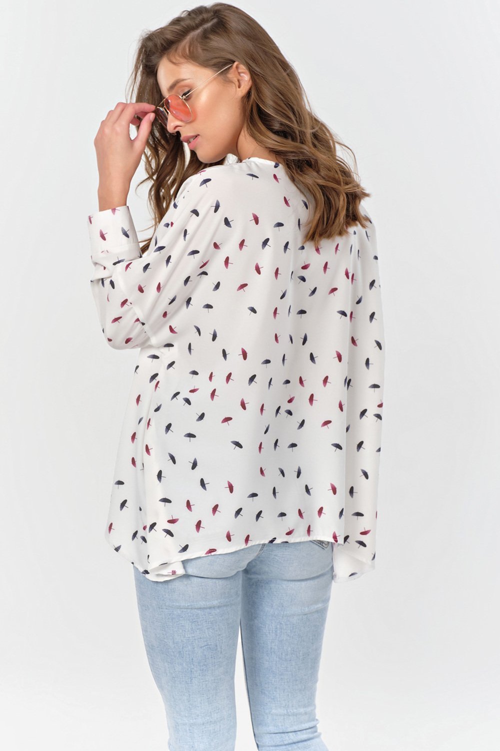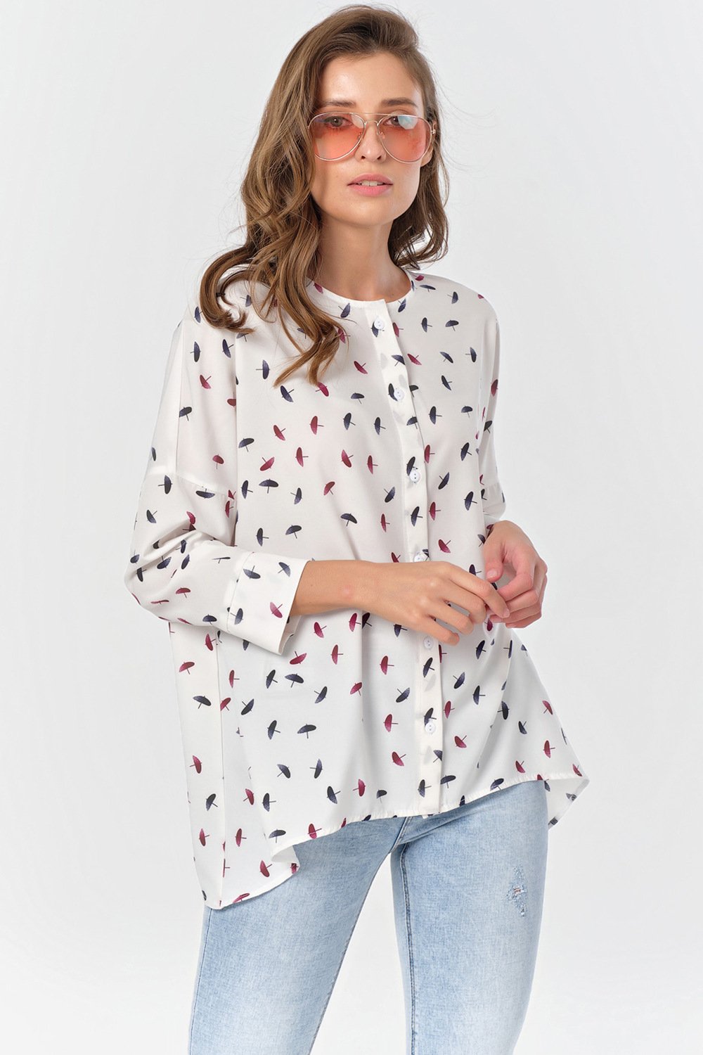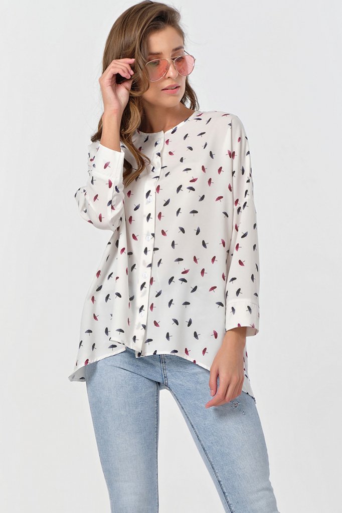 • Особенности: Блуза свободного А-образного силуэта из блузочной ткани. Детали: горловина обработана бейкой спущенная линия плеча втачной рукав с притачной манжетой фигурная линия низа. Застежка по переду на петли-пуговицы.