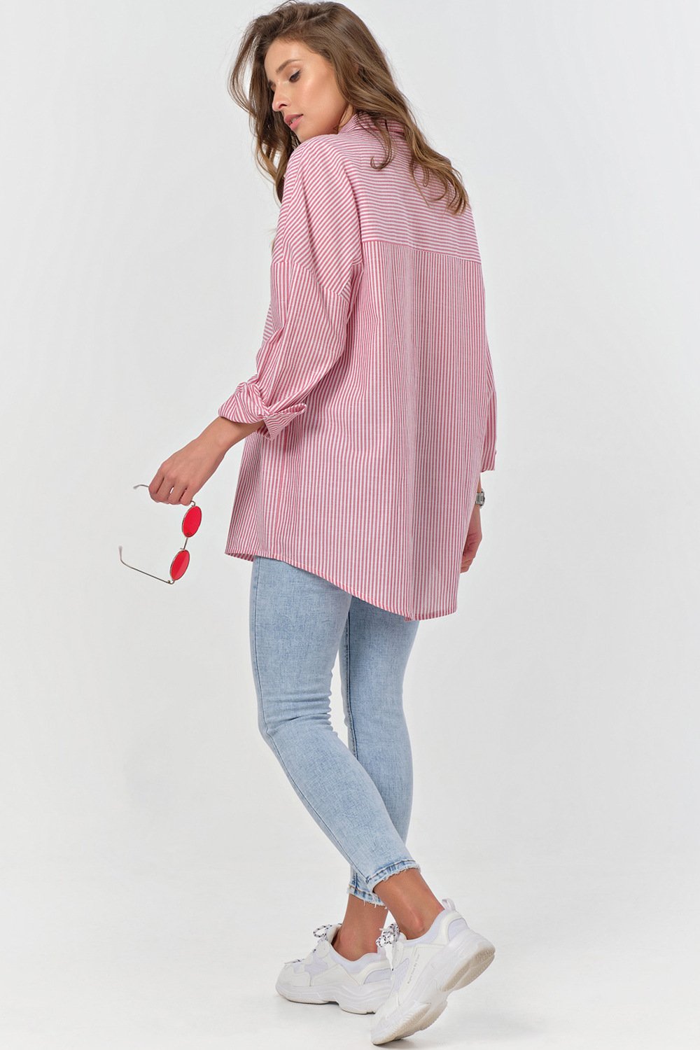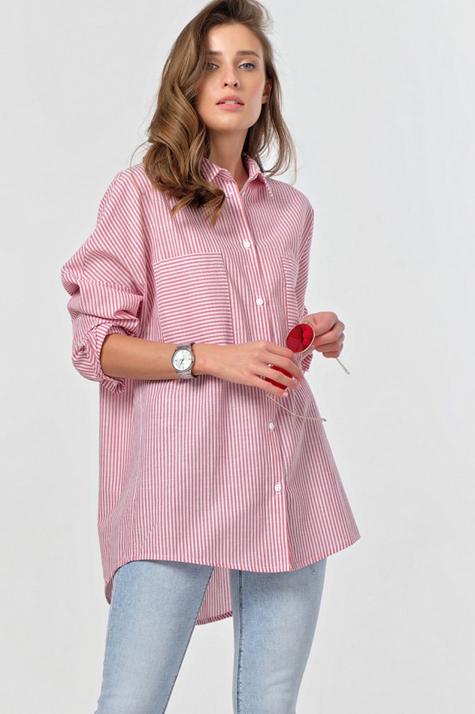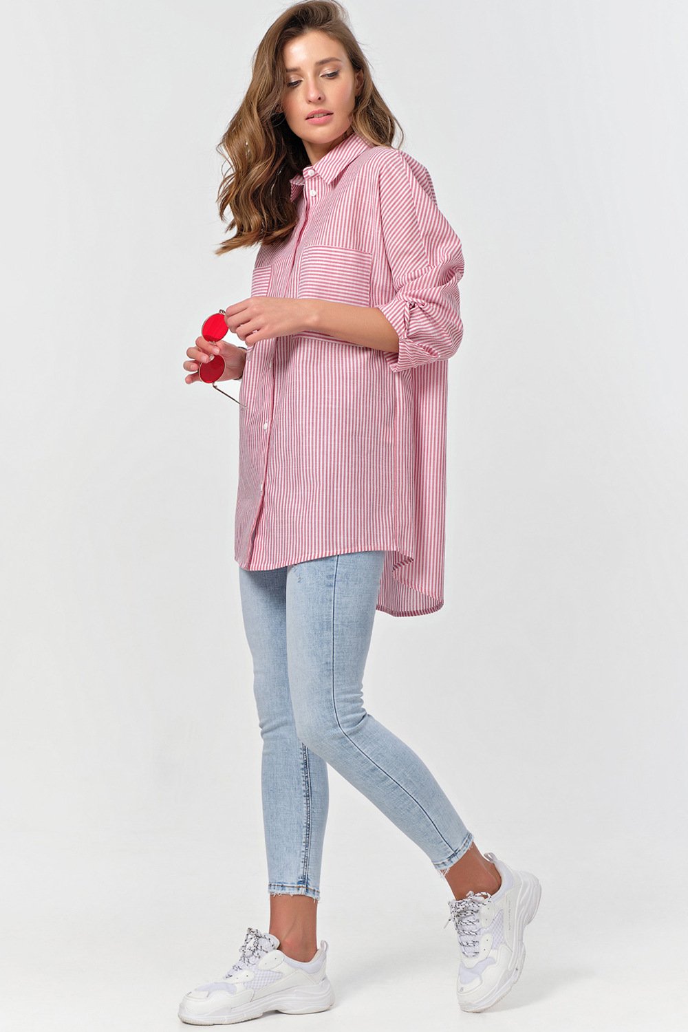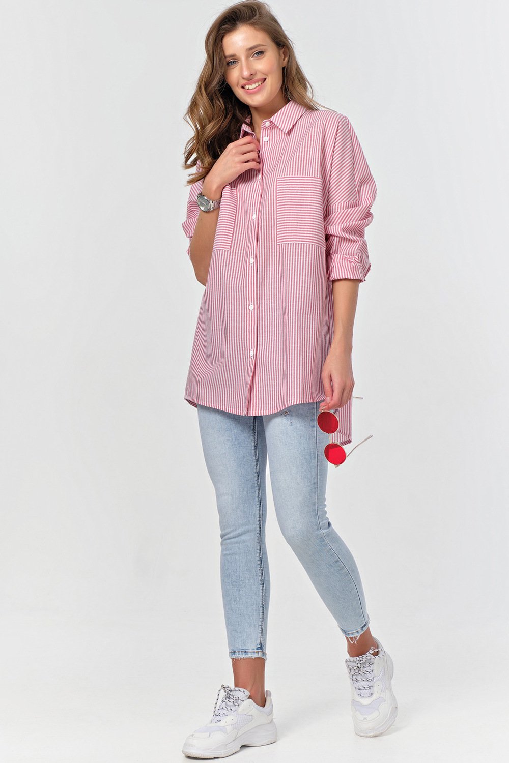 • Особенности: Рубашка из хлопковой ткани в полоску. Детали: отложной воротник на стойке планка с застежкой на петли и пуговицы накладные карманы. Втачной рукав с рубашечной проймой на манжете. Низ изделия криволинейный.