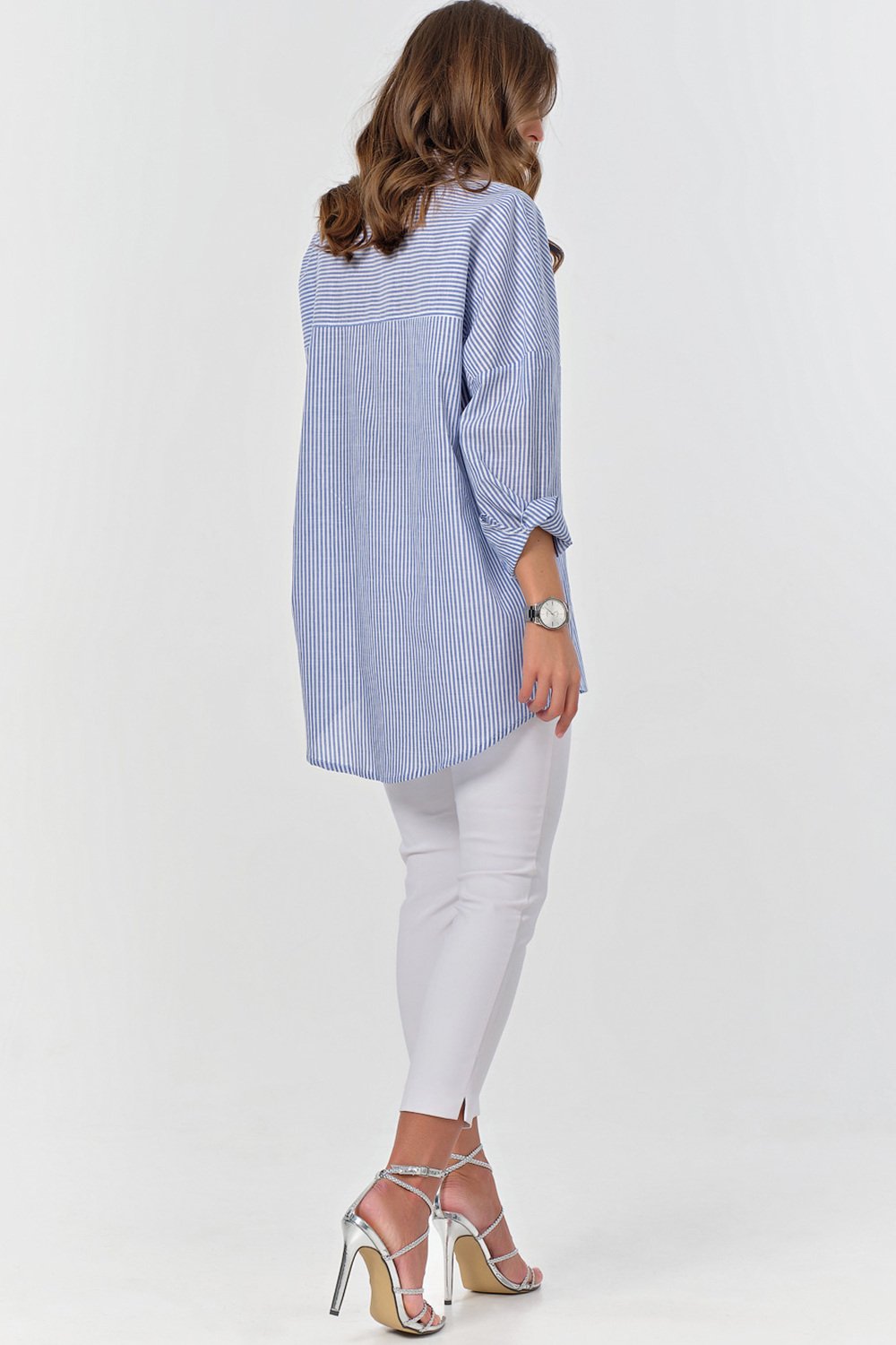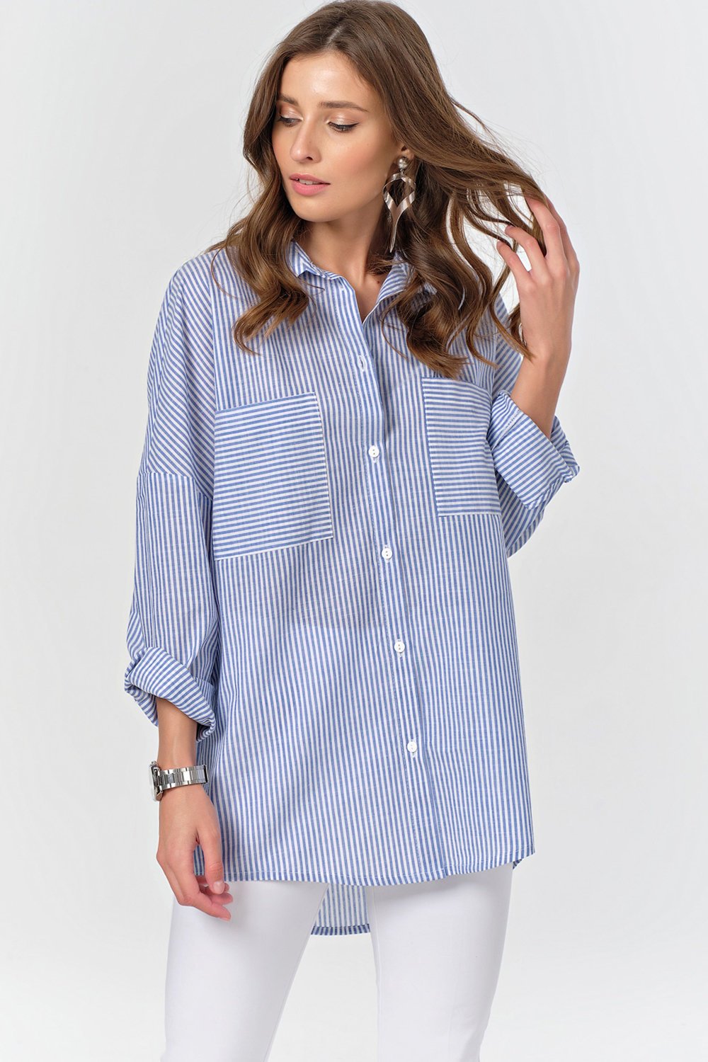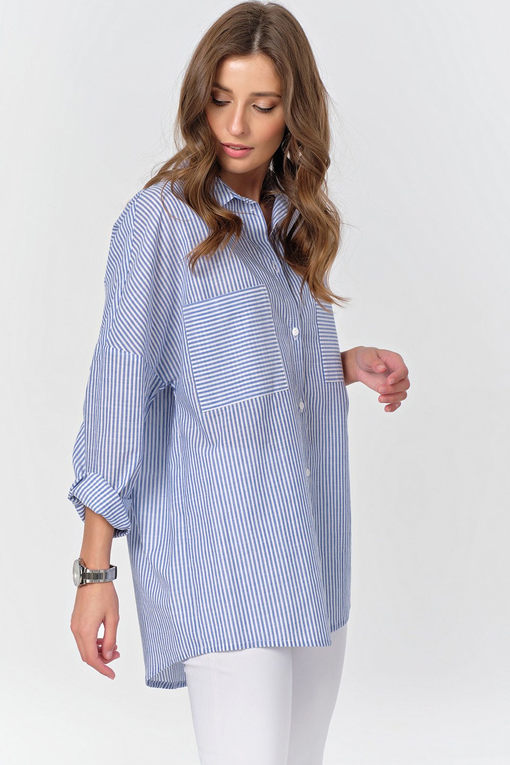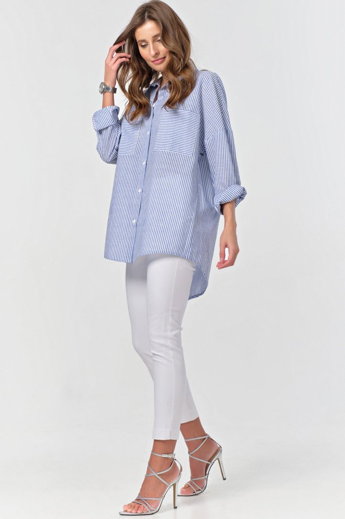 • Особенности: Рубашка из хлопковой ткани в полоску. Детали: отложной воротник на стойке планка с застежкой на петли и пуговицы накладные карманы. Втачной рукав с рубашечной проймой на манжете. Низ изделия криволинейный.