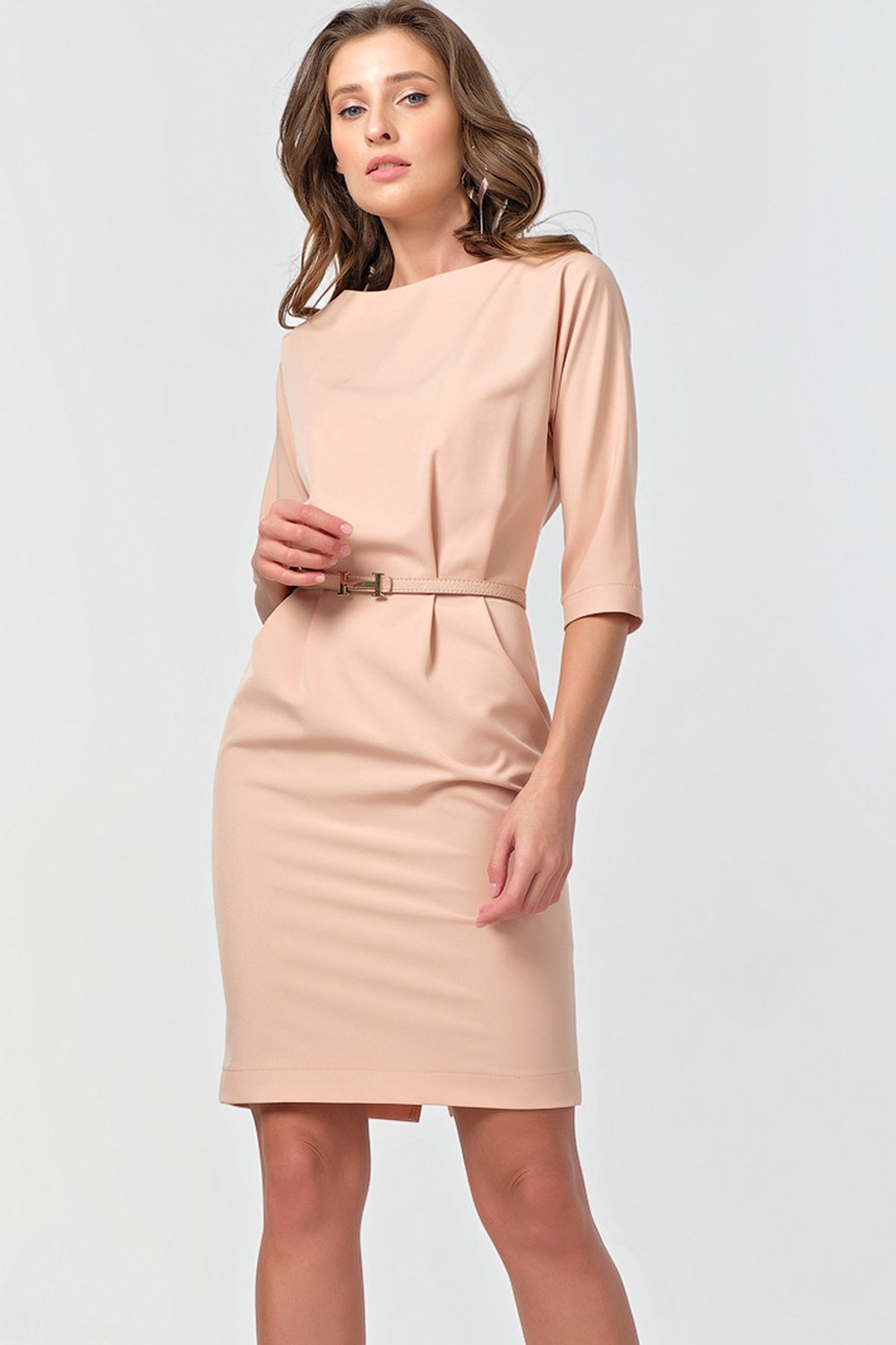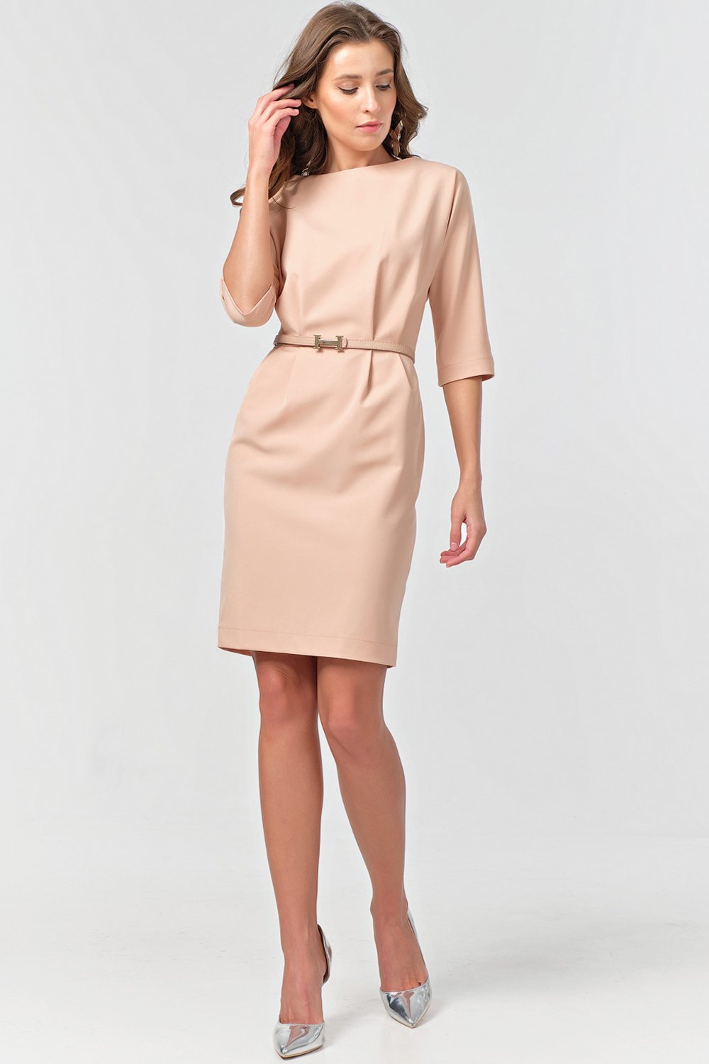• Особенности: Платье прилегающего силуэта из костюмной ткани. Отрезное по талии с защипами на лиф и юбку. Потайная застежка-молния в среднем шве спинки. Рукав втачной прилегающий длиной 3/4.