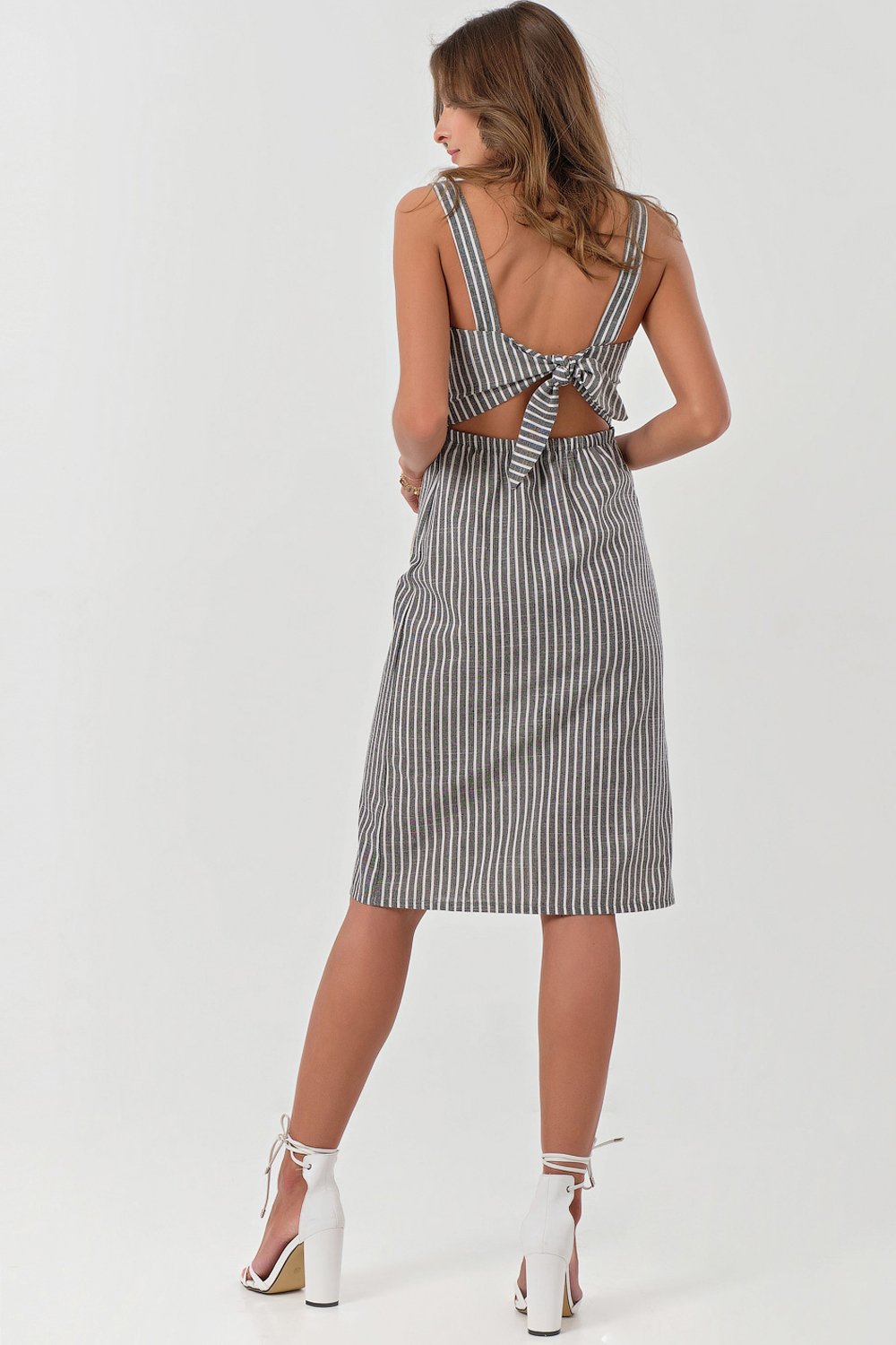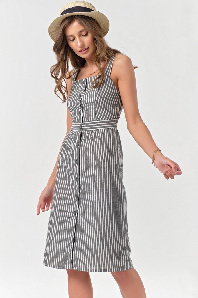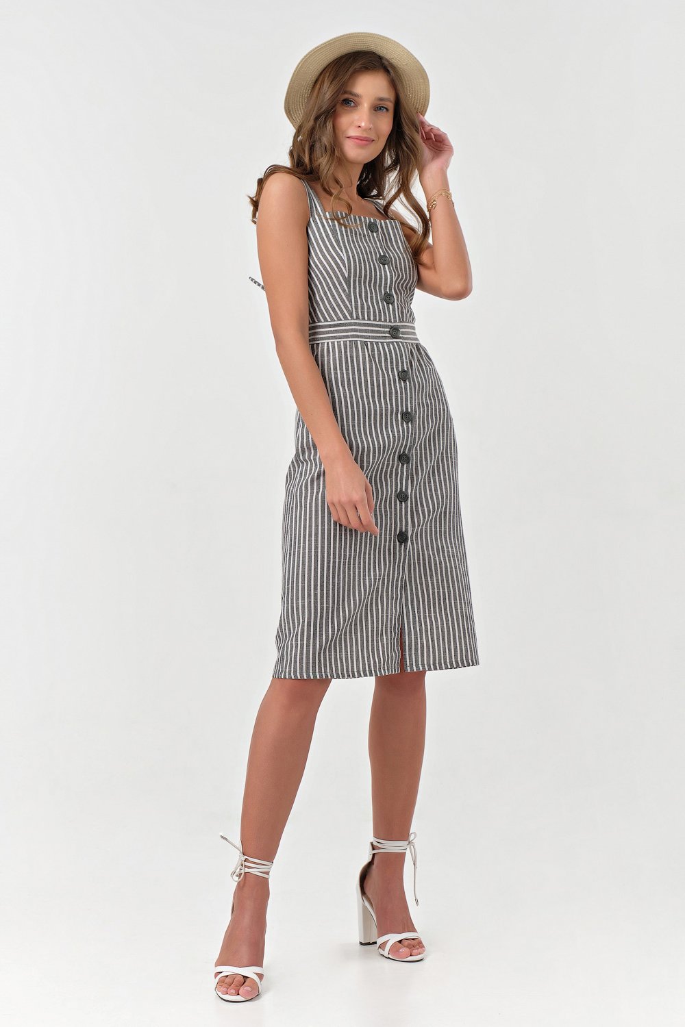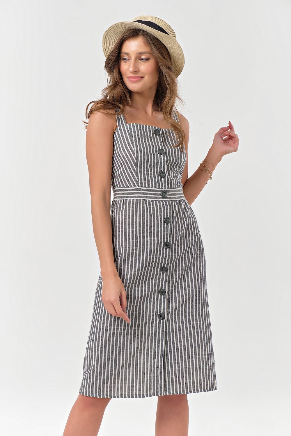 • Длина изделия: 106 см Особенности: Платье-сарафан с завязкой по спинке. Детали: широкие бретели рельефы пояс притачной планка с застежкой на петли-пуговицы сборка на резинку по спинке на талии.