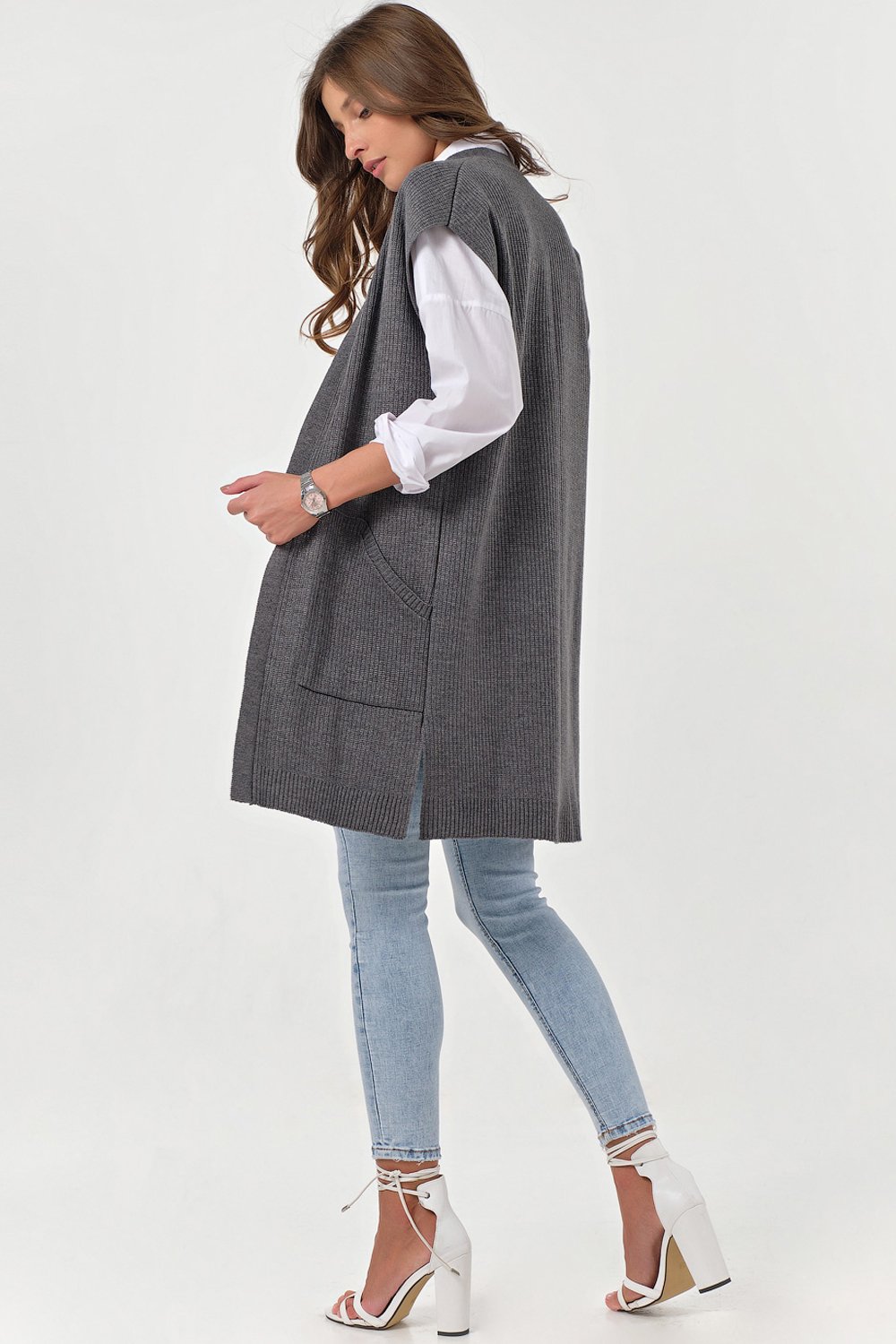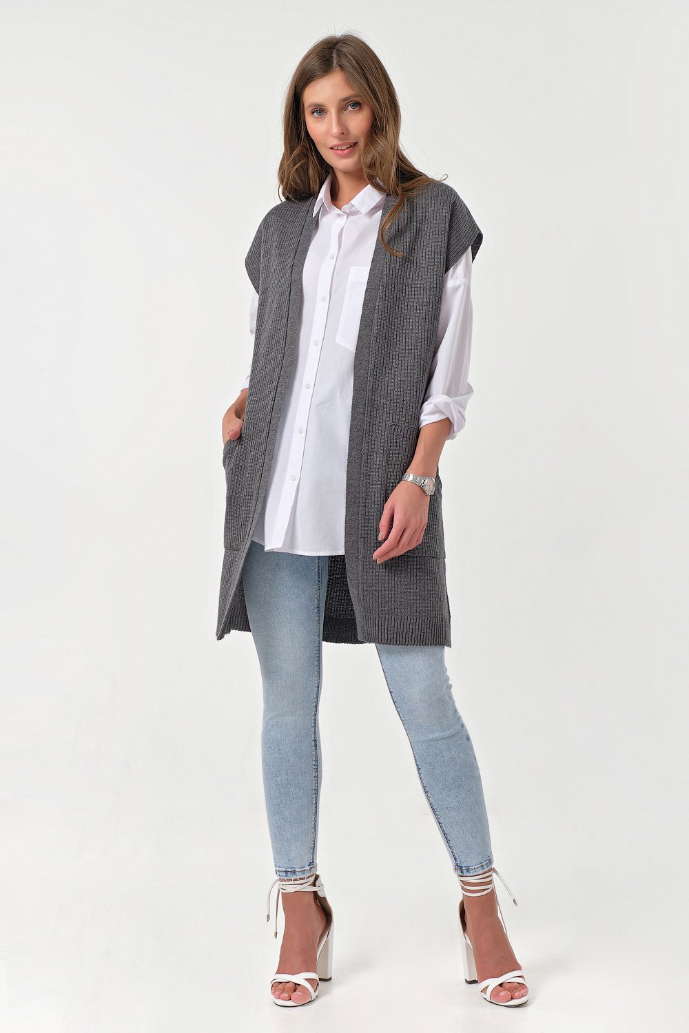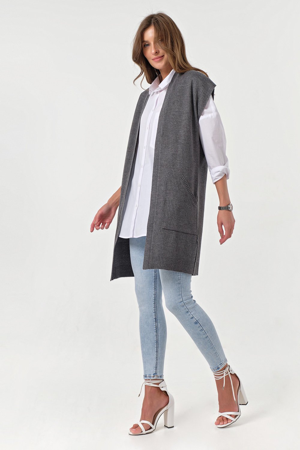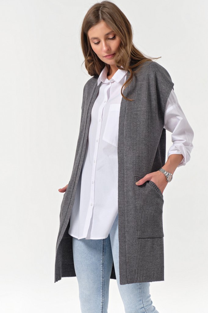 • Карманы: накладные с фигурным входом Особенности: Вязаный жилет выполнен из смесовой полушерстяной пряжи. По переду накладные карманы. Низ жилета оформлен резинкой в рубчик.