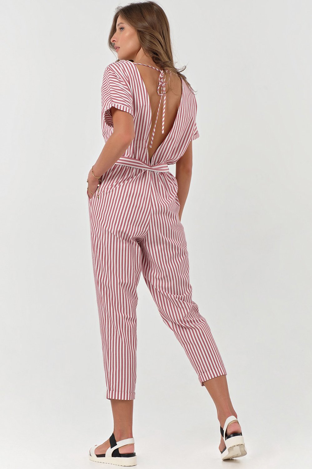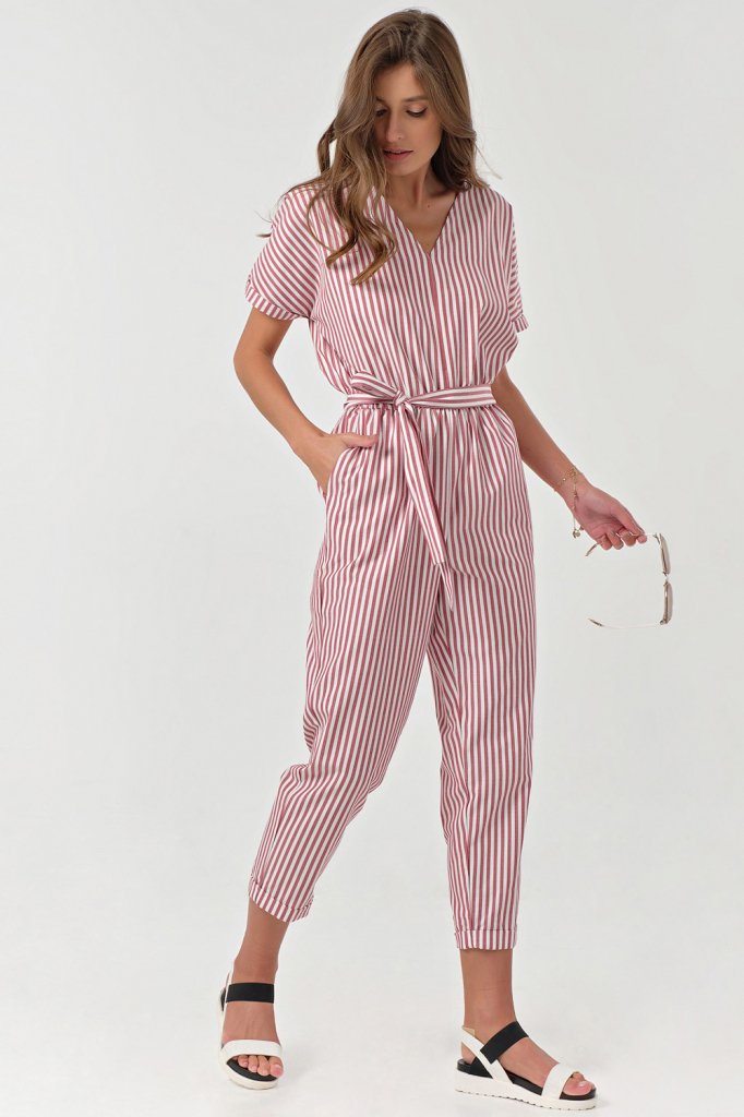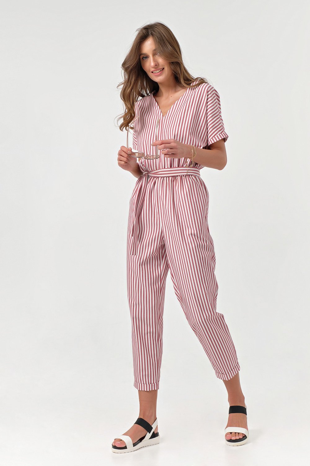 • Особенности: Комбинезон полуприлегающего силуэта из плательной ткани. Детали: цельновыкроенный рукав с притачной манжетой V-образный вырез горловины переда глубокий вырез по спинке скреплен завязками брючные карманы отвороты по низу брюк. Пояс в комплекте. Без застежки.
