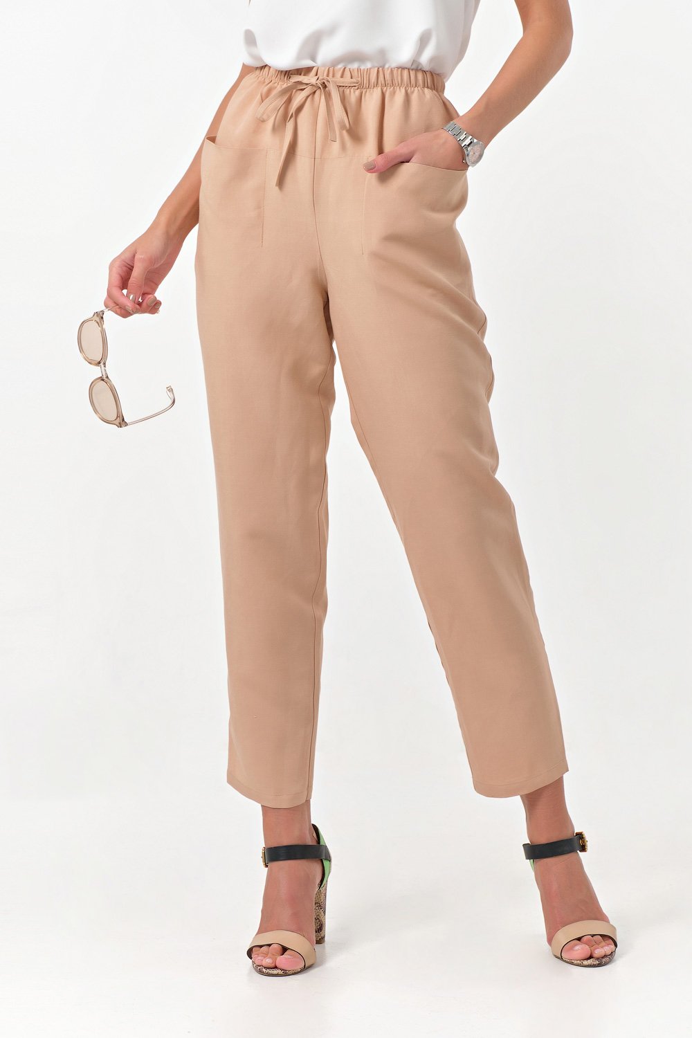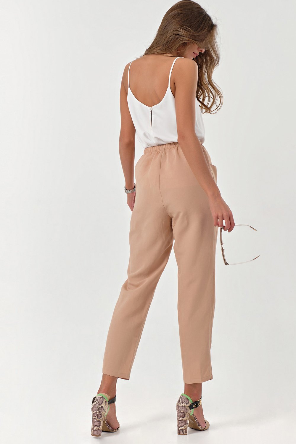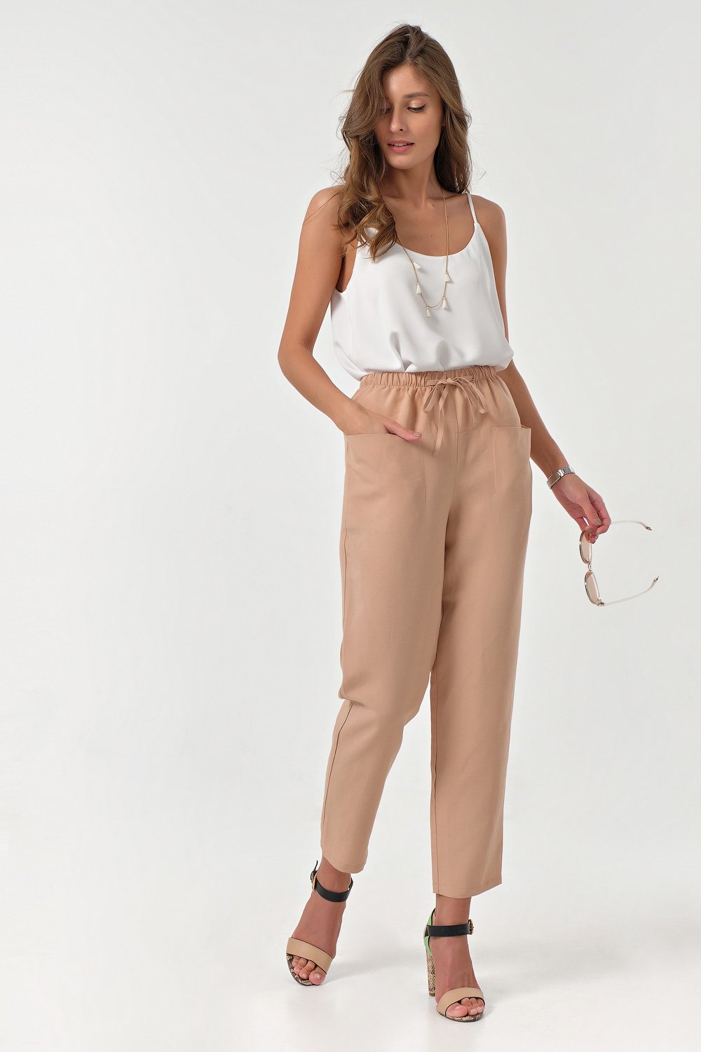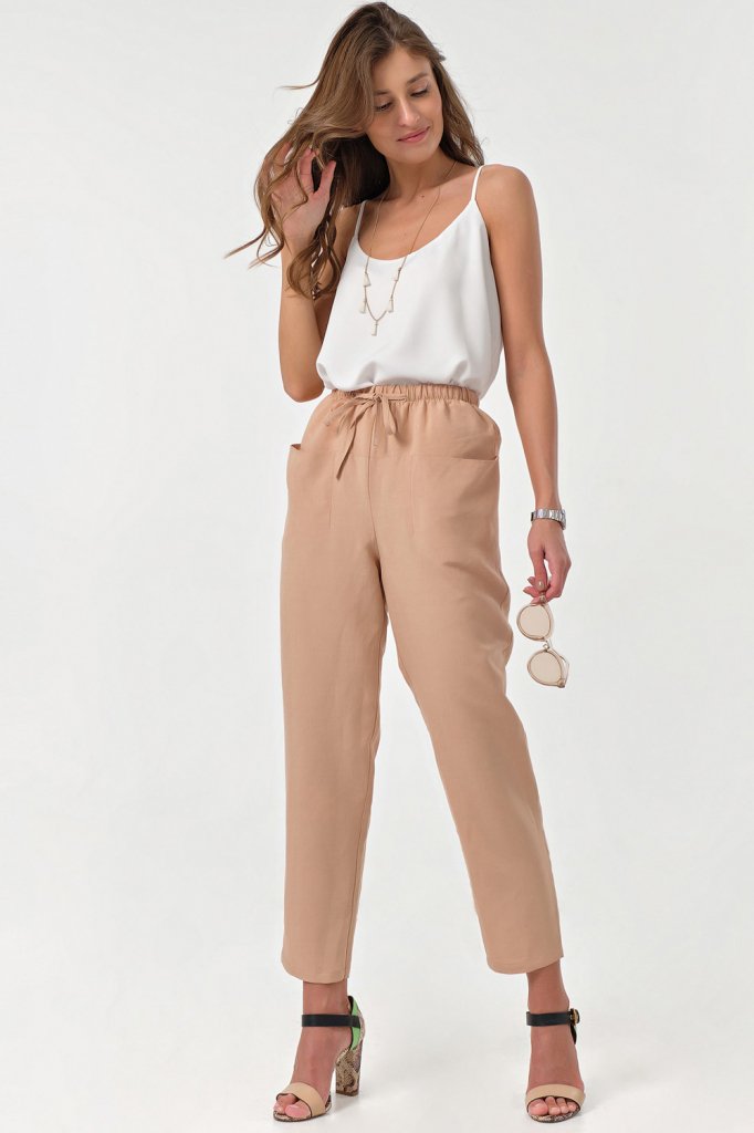 • Особенности: Брюки прямого силуэта из плательной ткани. Детали: пояс со сборкой на резину в пояс вставлен шнурок из основной ткани объемные карманы по переду. Без застежки.
