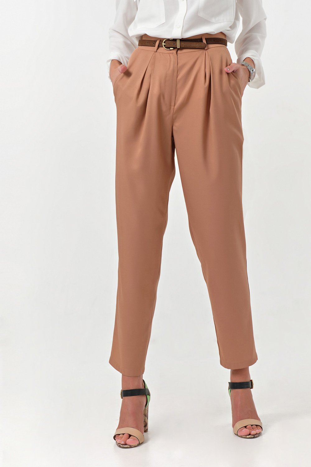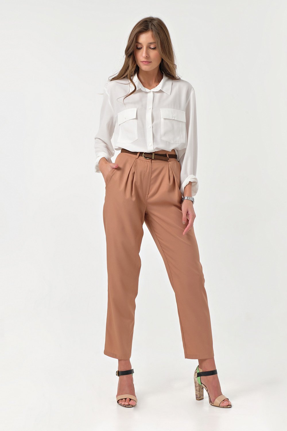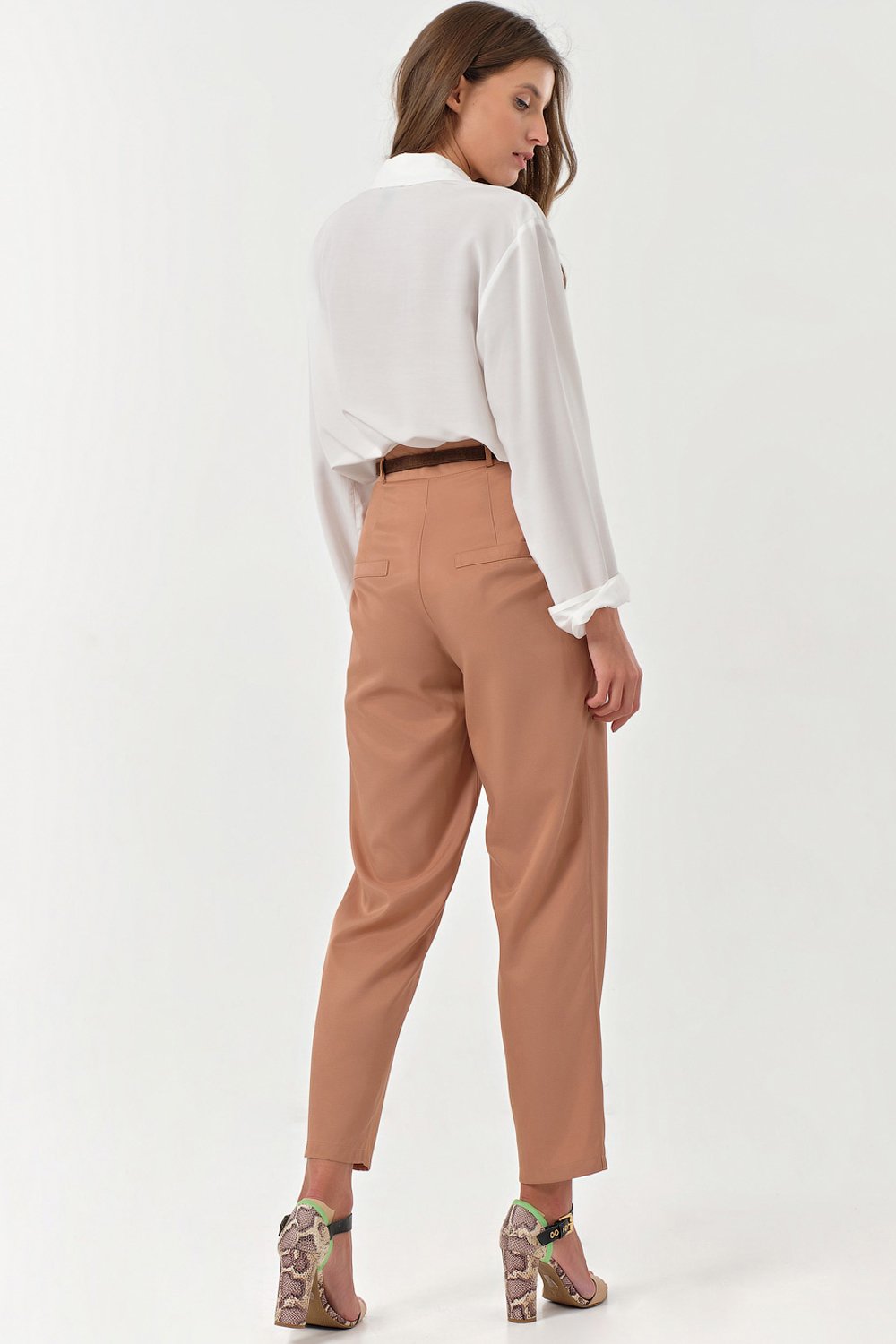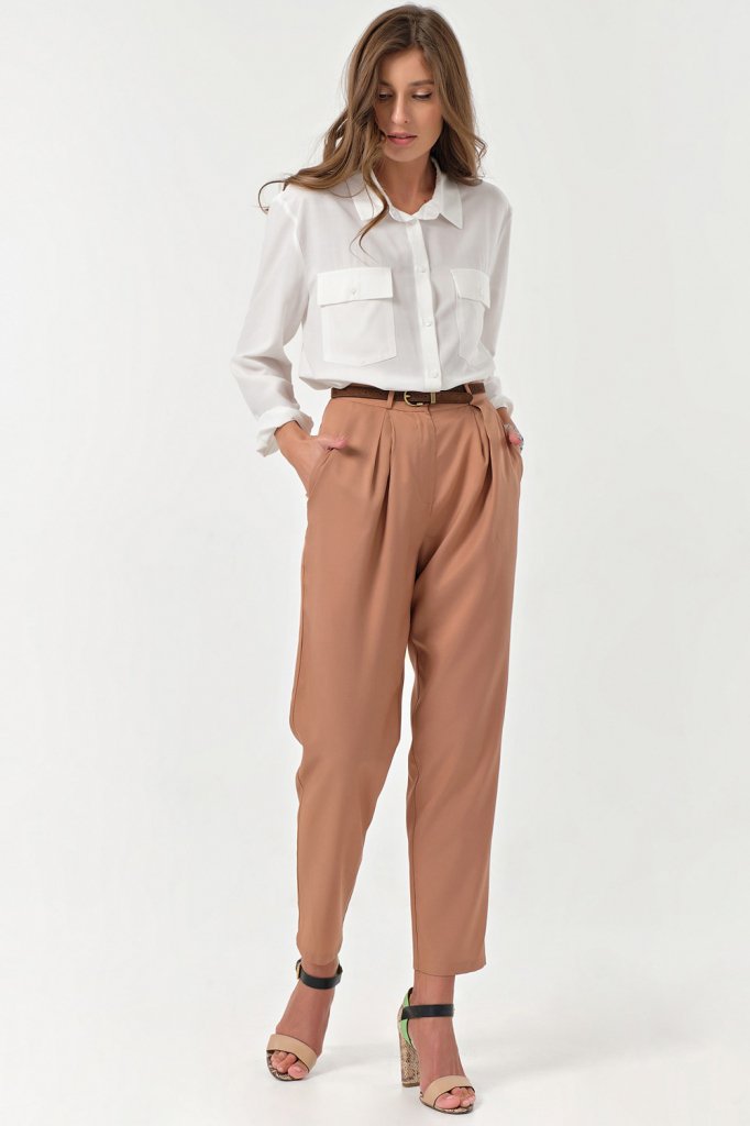 • Особенности: Брюки свободного силуэта зауженные к низу. Детали: притачной пояс со шлевками по переду защипы и боковые карманы декоративные листочки на спинке. Застежка на молнию и крючок.