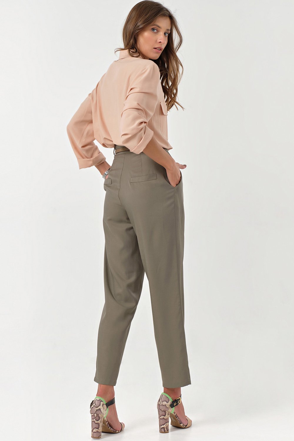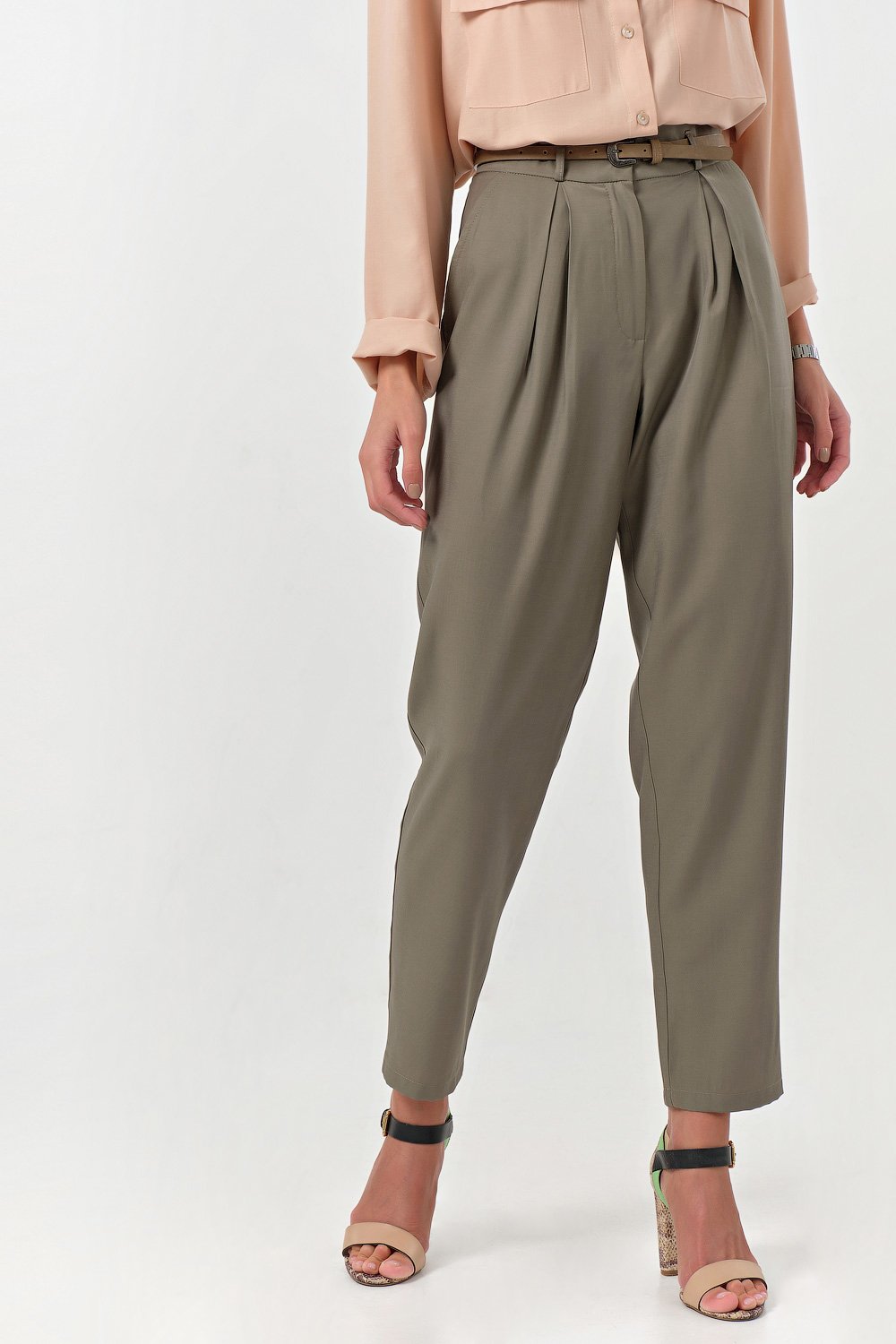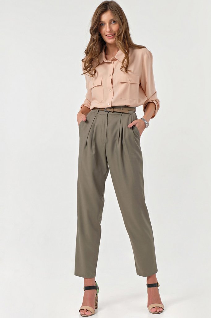 • Особенности: Брюки свободного силуэта зауженные к низу. Детали: притачной пояс со шлевками по переду защипы и боковые карманы декоративные листочки на спинке. Застежка на молнию и крючок.