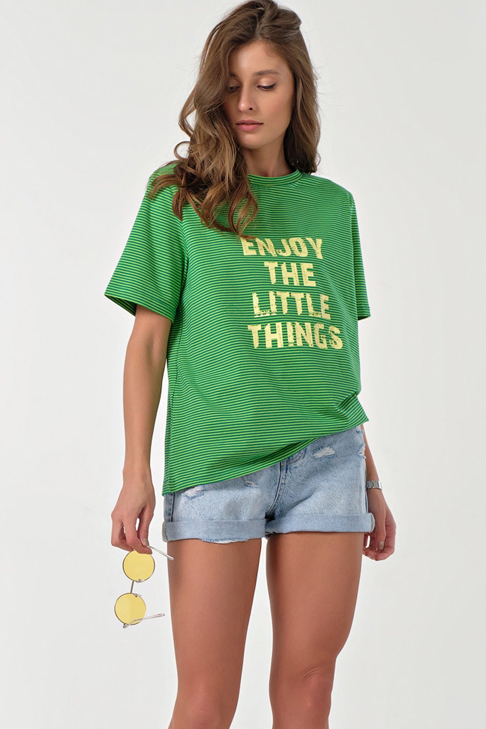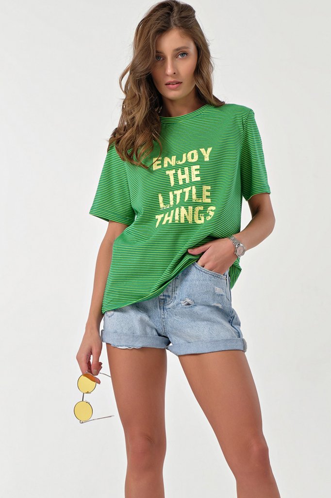 • Особенности: Футболка прямого силуэта среднего объема из трикотажа. Детали: горловина обработана бейкой по переду нанесен принт.