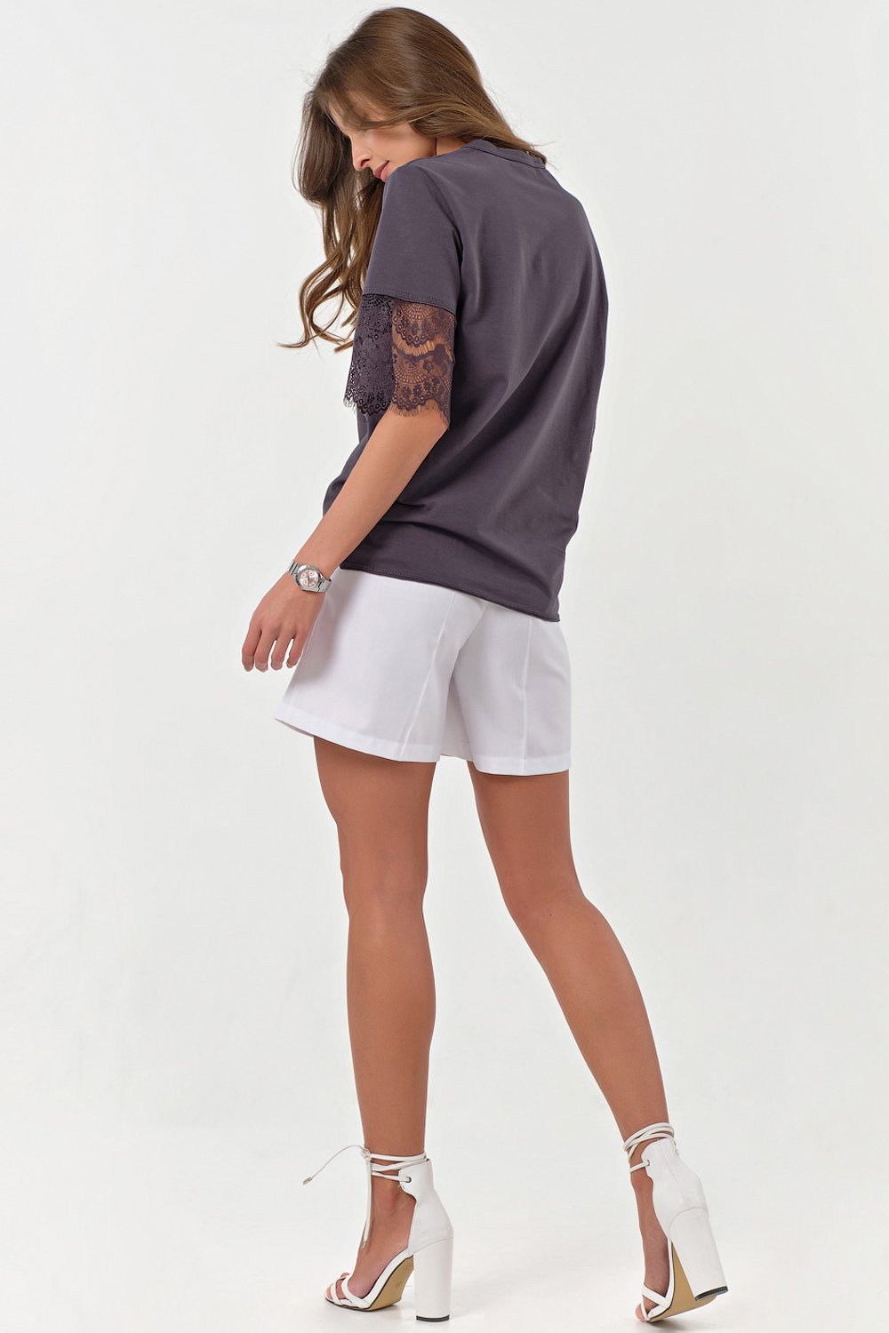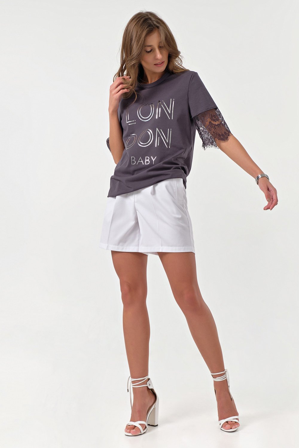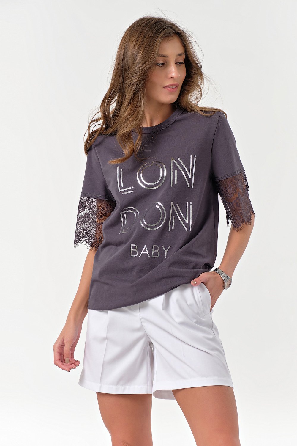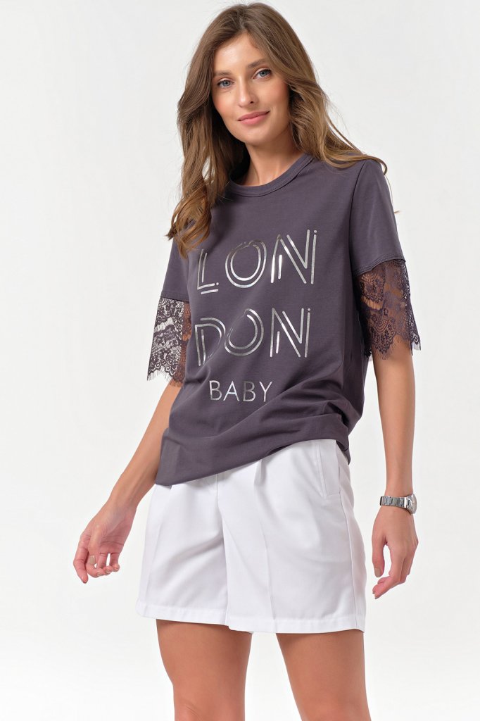 • Особенности: Футболка прямого силуэта из трикотажа. Детали: горловина обработана широкой окантовкой по низу рукавов притачано кружево по переду нанесен принт.