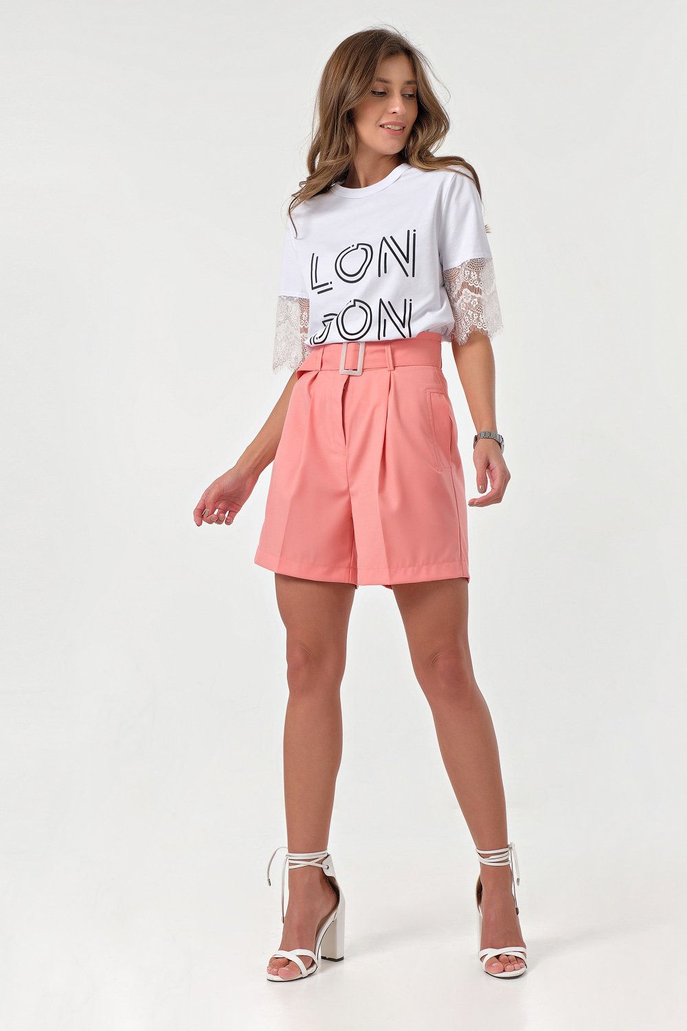• Особенности: Шорты прямого силуэта из костюмной ткани. Детали: широкий притачной пояс со шлевками защипы по переду боковые карманы с листочками ремень из основной ткани с пряжкой. Застежка на молнию и крючок.