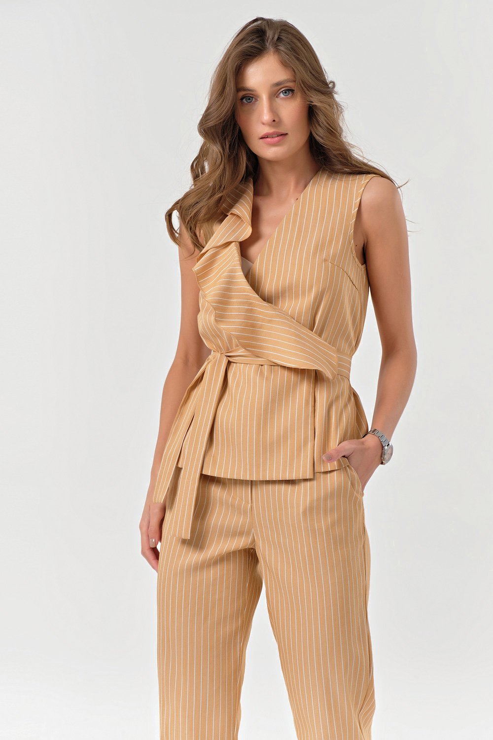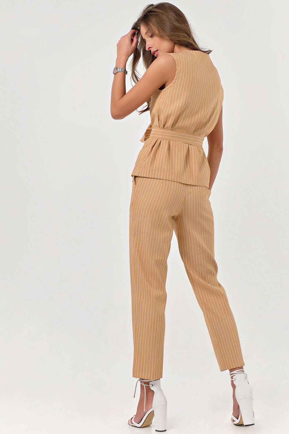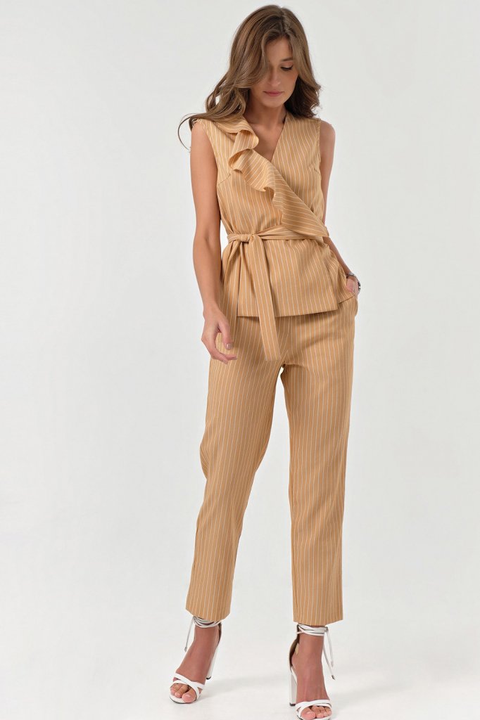 • Особенности: Костюм состоит из блузы прямого силуэта и укороченных брюк прилегающего силуэта. Детали блузы: на правой полочке волан застежка на потайную кнопку длинный пояс. Детали брюк: брючные карманы притачной пояс с застежкой на две пуговицы.