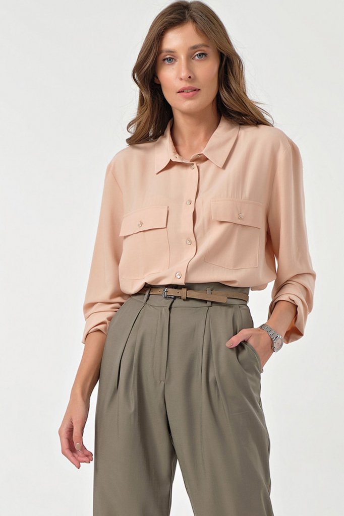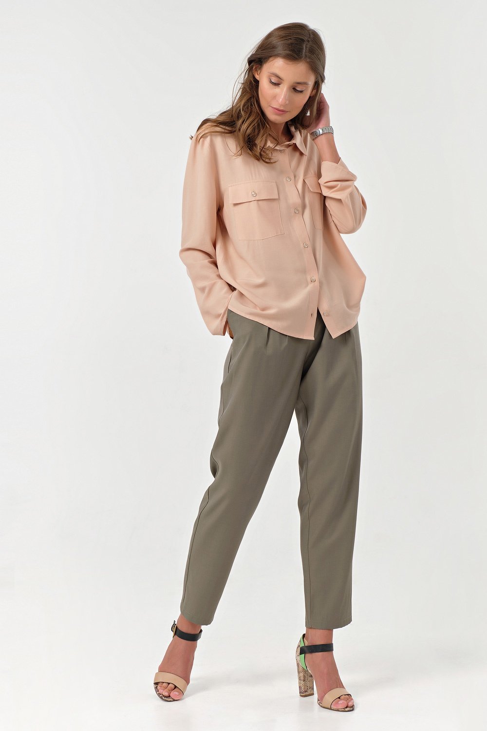 • Особенности: Рубашка прямого силуэта из блузочной ткани. Детали: отложной воротник на стойке накладные карманы с клапанами по переду клапаны застегиваются на петлю-пуговицу широкие рукава. Застежка на петли-пуговицы по переду.