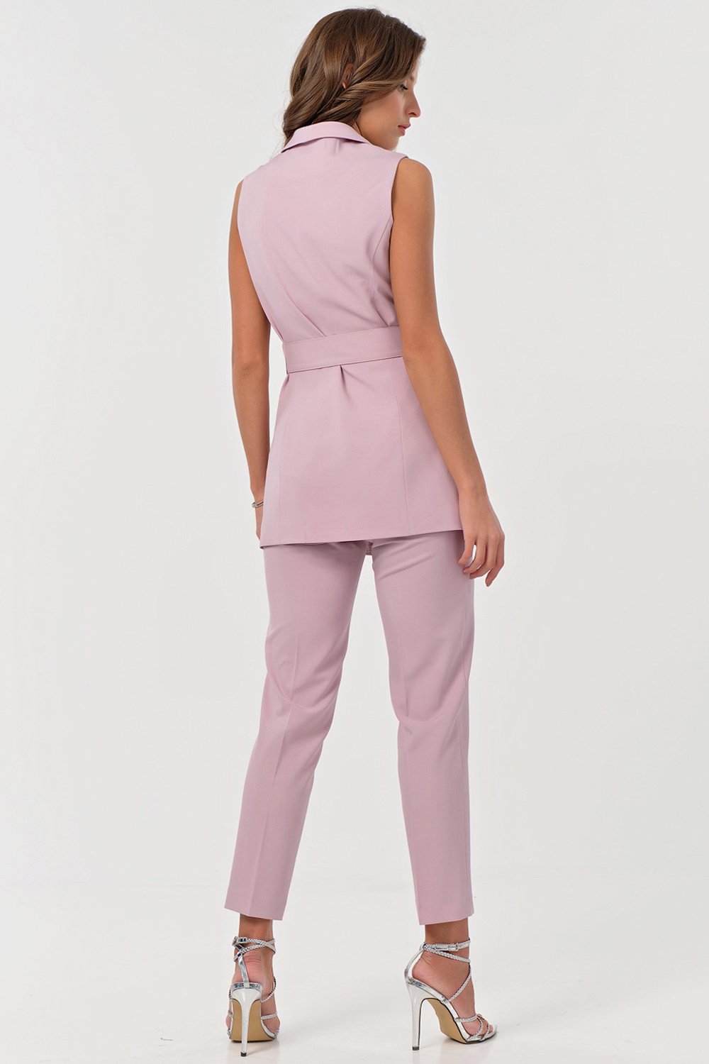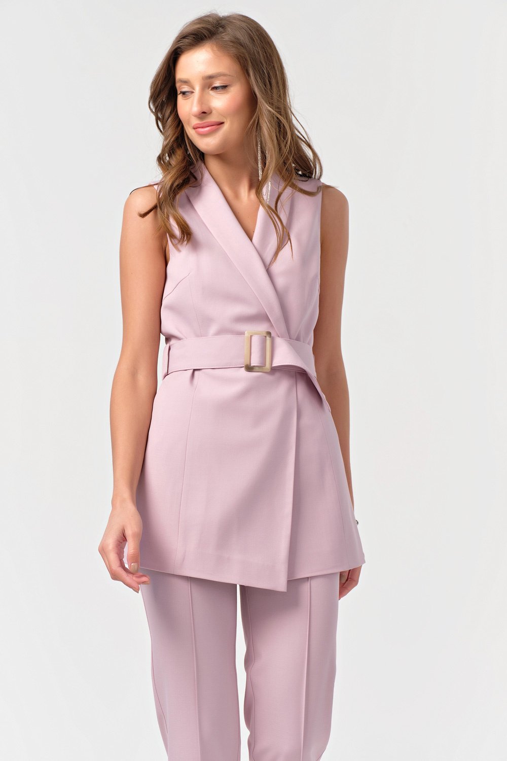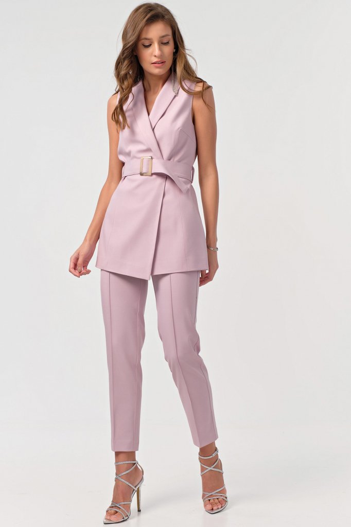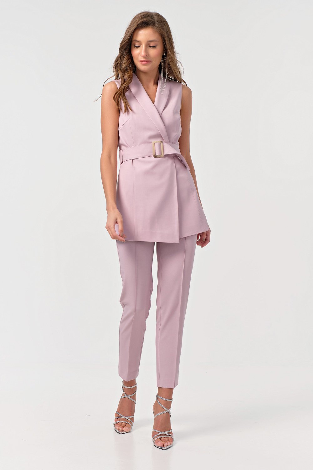 • Особенности: Комплект из костюмной ткани состоящий из жилета полуприлегающего силуэта на подкладке и зауженных брюк. Детали жилета: шалевый воротник пояс из основной ткани с пряжкой в комплекте шлевки в боковых швах правый борт с провисанием застежка на потайные кнопки. Детали брюк: широкий притачной пояс со шлевками застроченные стрелки по переду боковые карманы застежка на молнию и крючок.