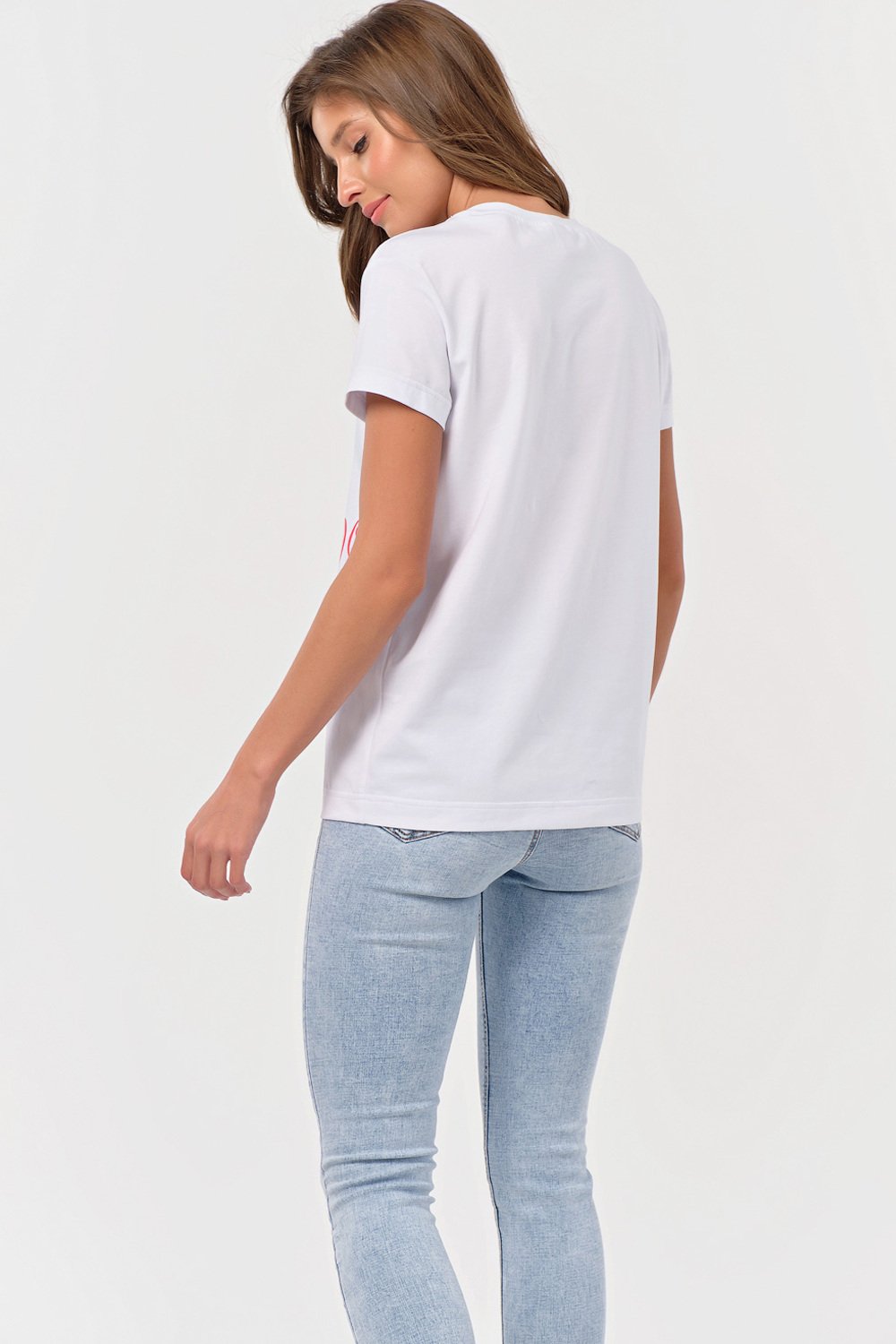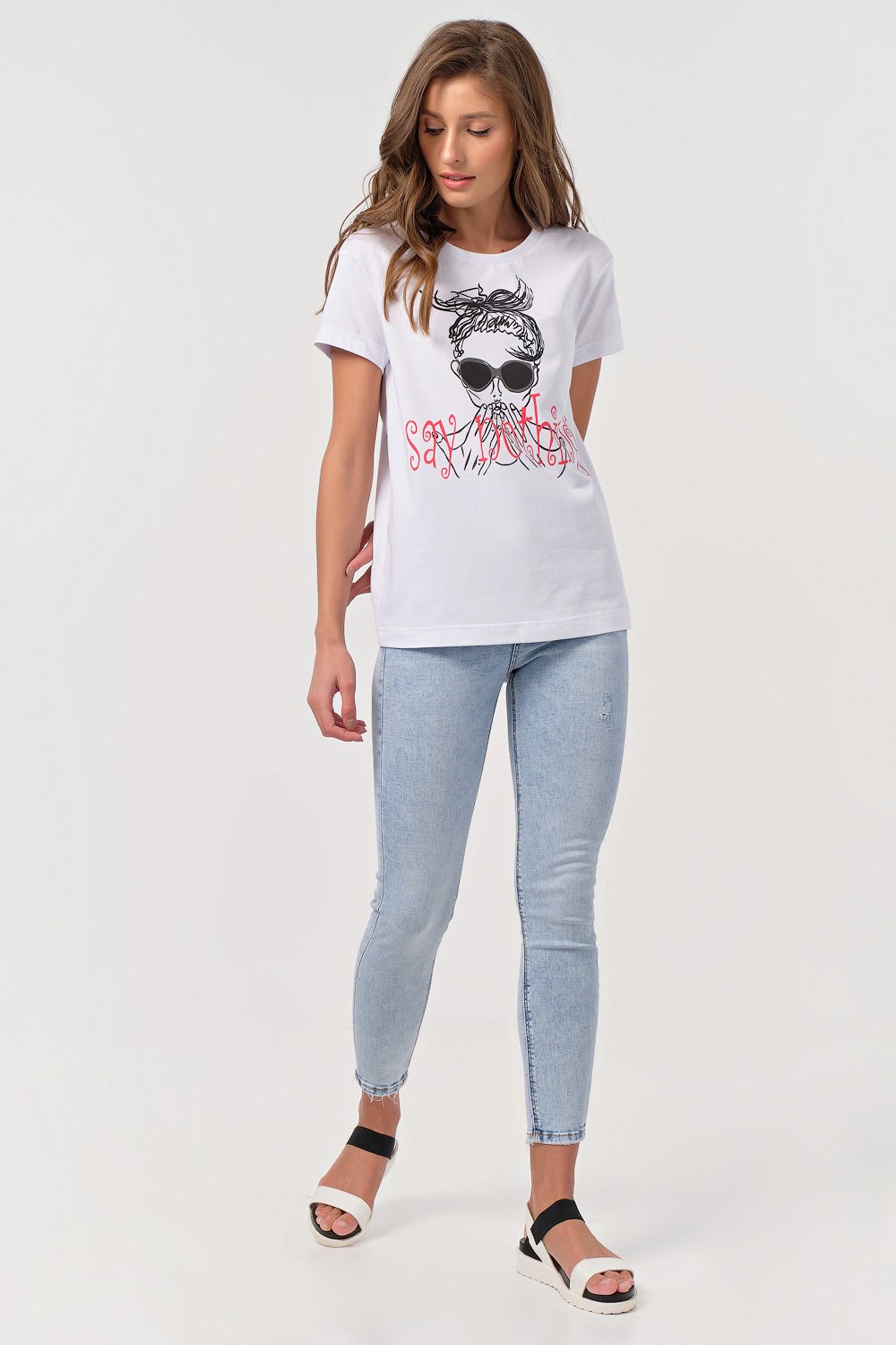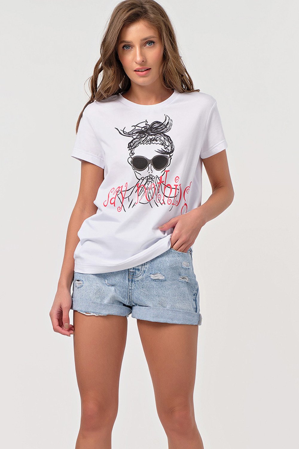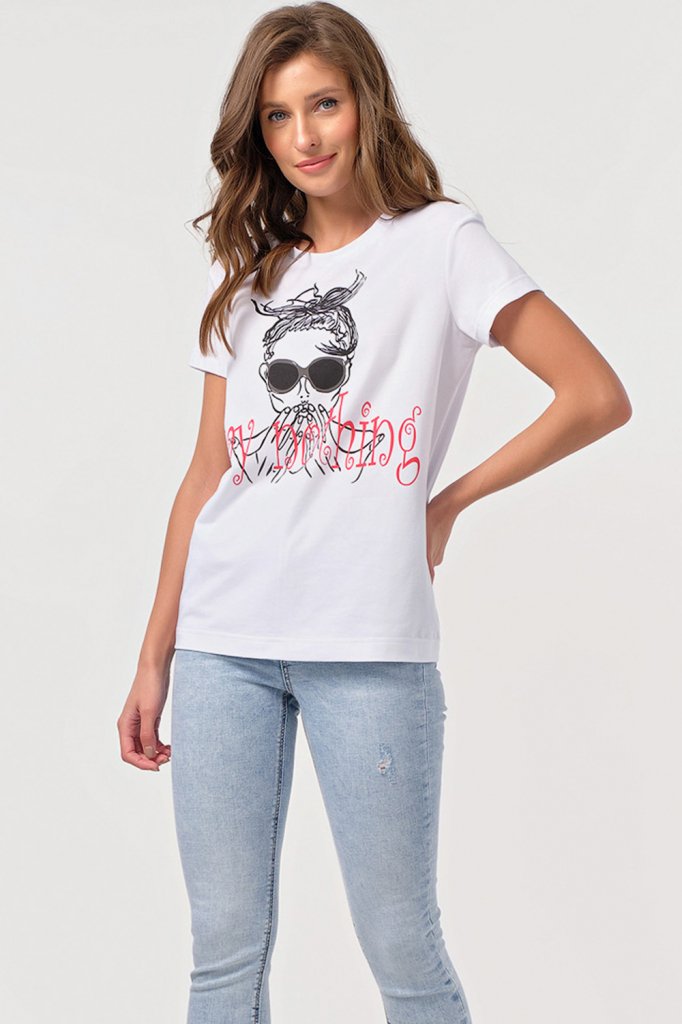 • Особенности: Футболка прямого силуэта имеет свободную посадку без прилегания! Выполнена из хлопкового трикотажа. Детали: горловина обработана бейкой по переду нанесен принт.