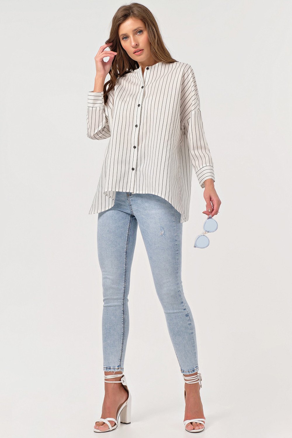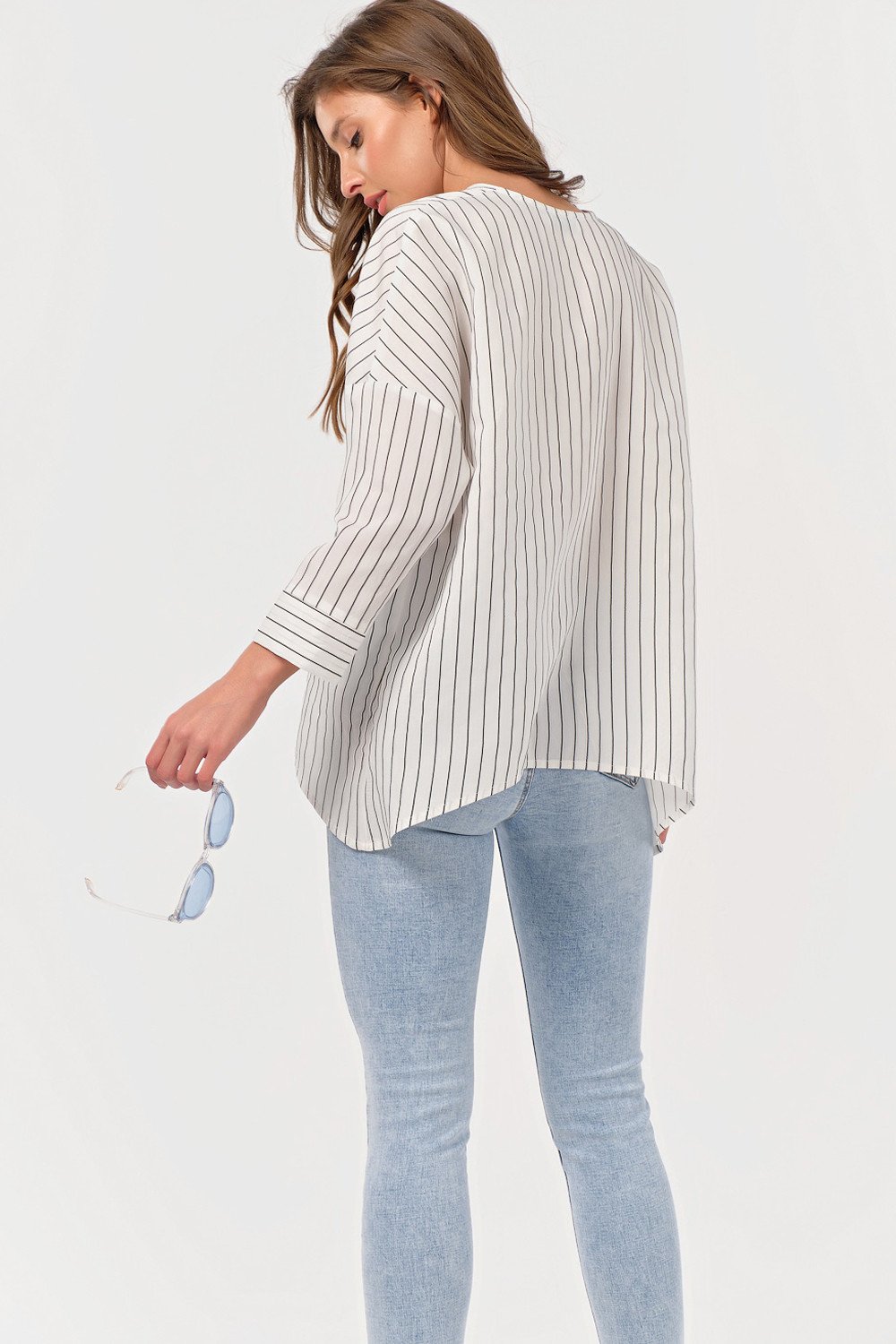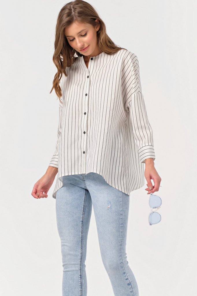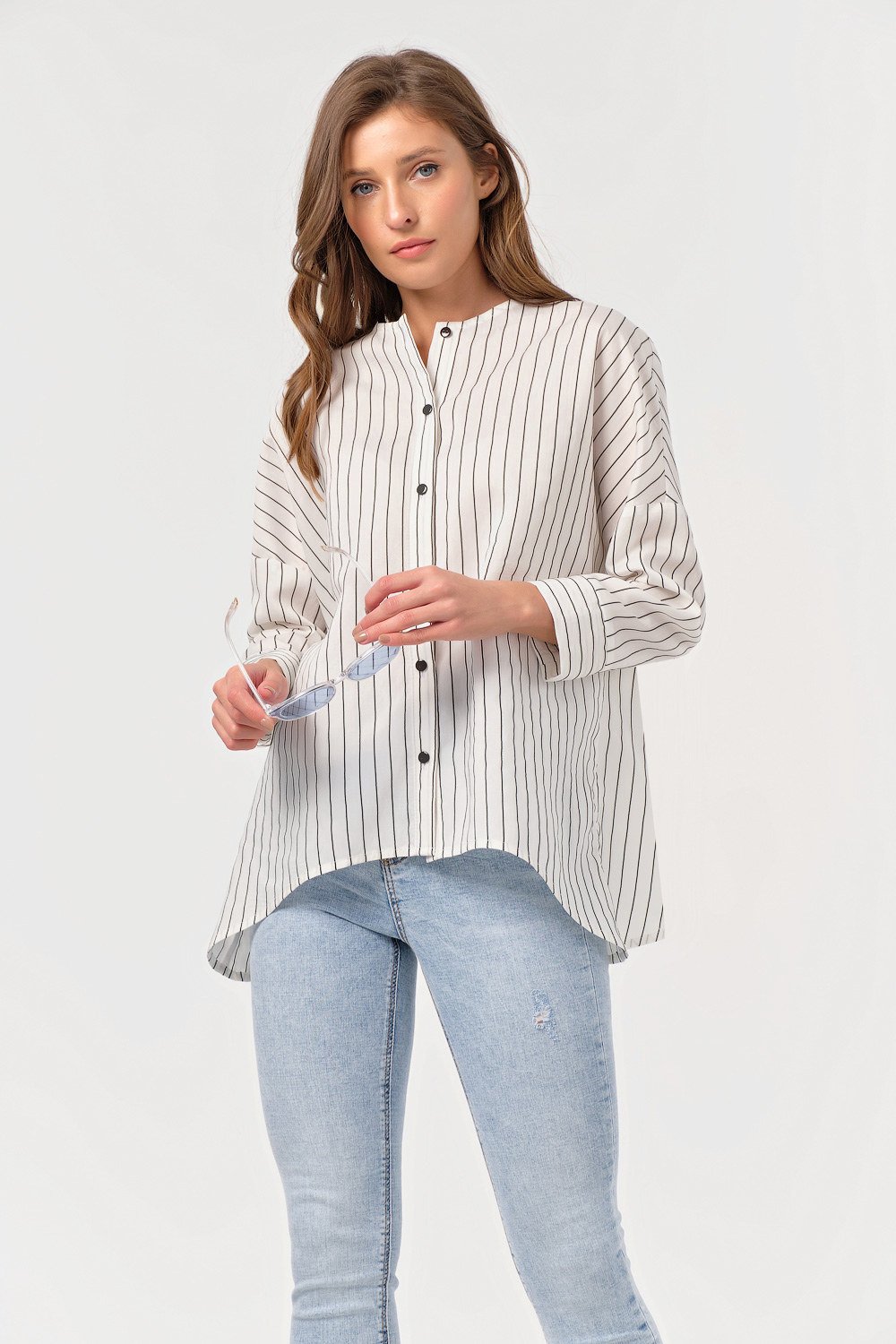 • Длина: 62 см Особенности: Блуза свободного А-образного силуэта из блузочной ткани. Детали: горловина обработана бейкой спущенная линия плеча втачной рукав с притачной манжетой фигурная линия низа. Застежка по переду на петли-пуговицы.