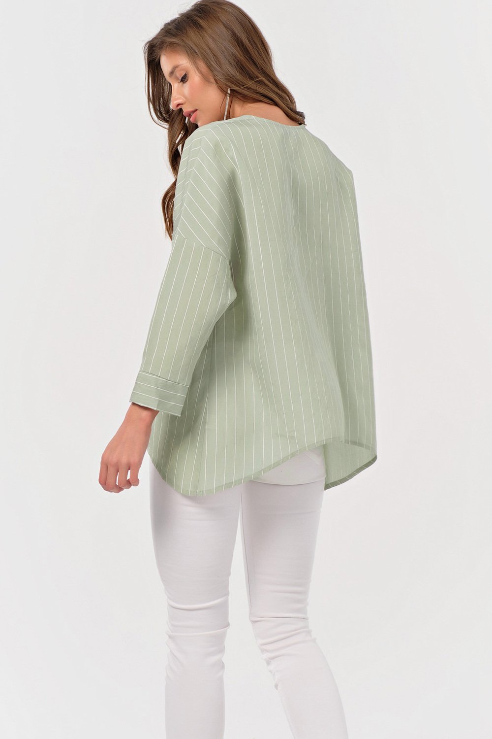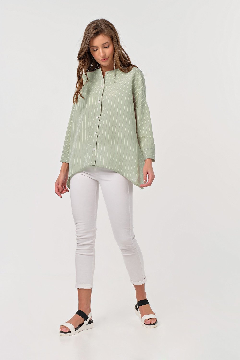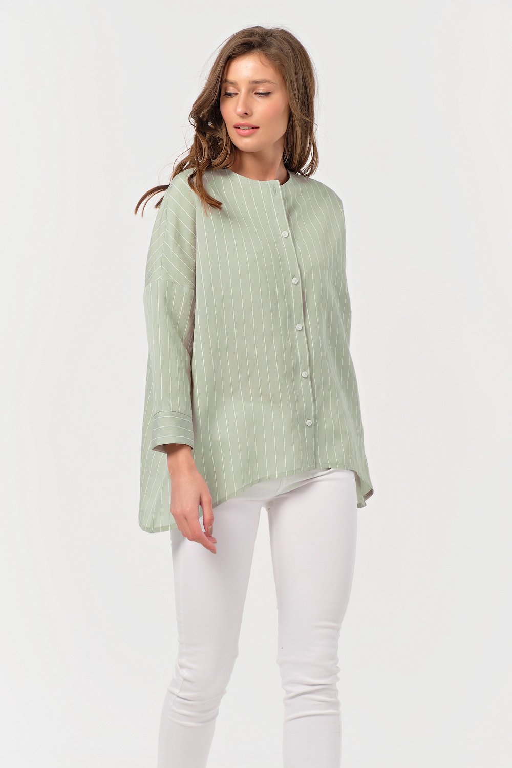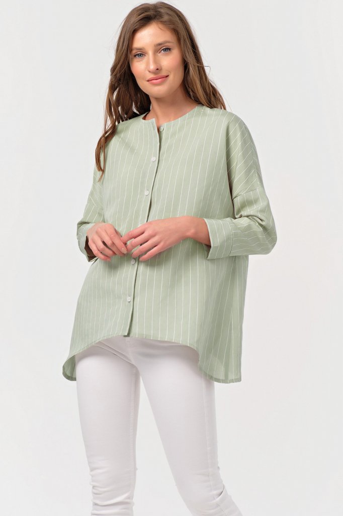 • Длина: 62 см Особенности: Блуза свободного А-образного силуэта из блузочной ткани. Детали: горловина обработана бейкой спущенная линия плеча втачной рукав с притачной манжетой фигурная линия низа. Застежка по переду на петли-пуговицы.