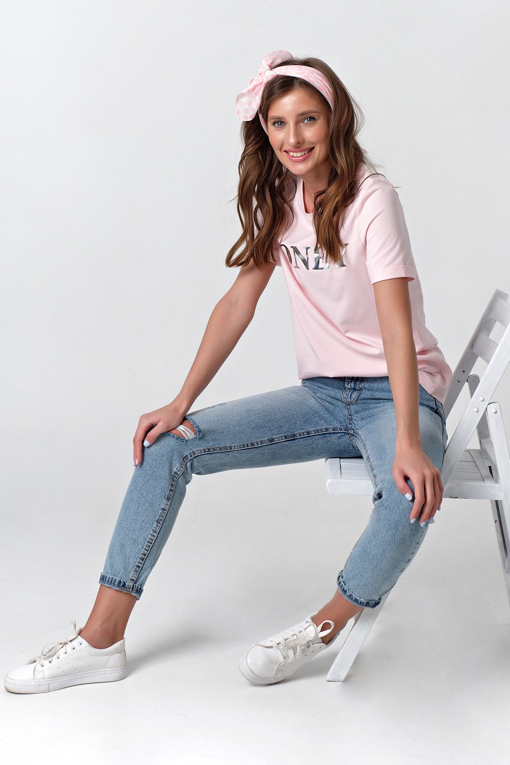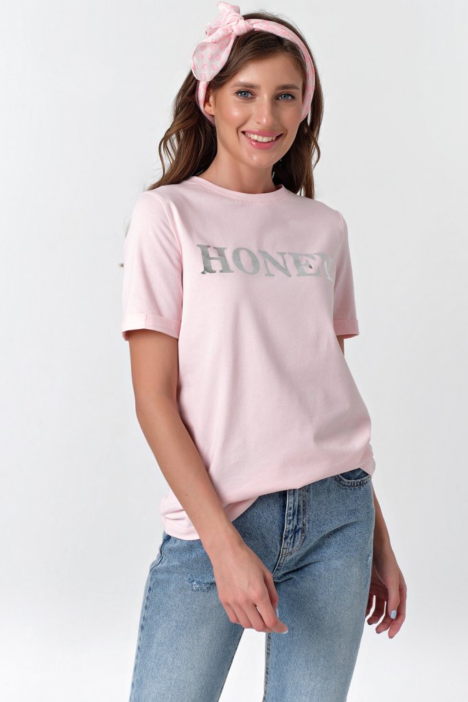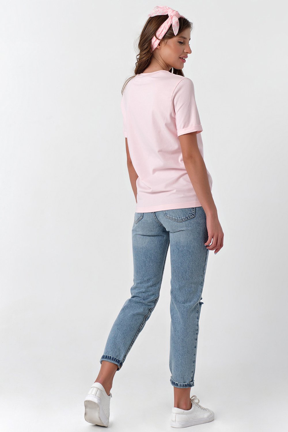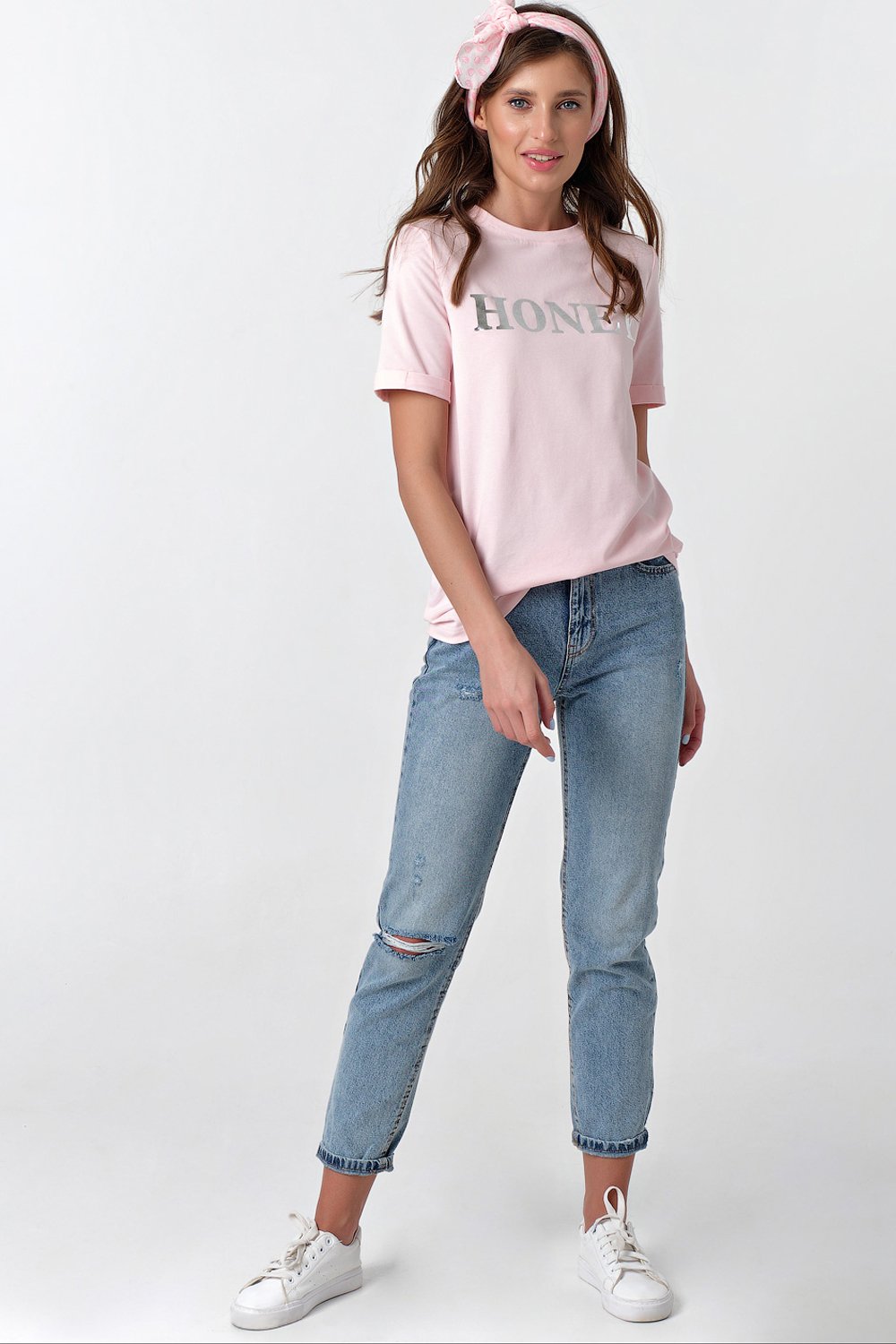 • Особенности: Футболка прямого силуэта имеет свободную посадку без прилегания. Выполнена из плотного хлопкового трикотажа. Детали: горловина обработана бейкой по переду нанесен принт.