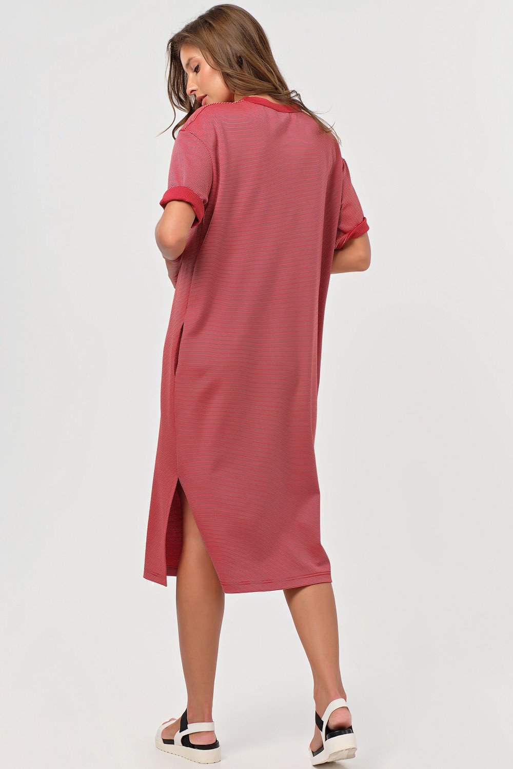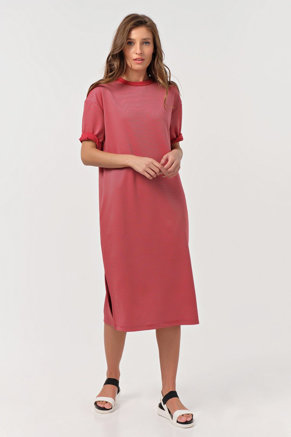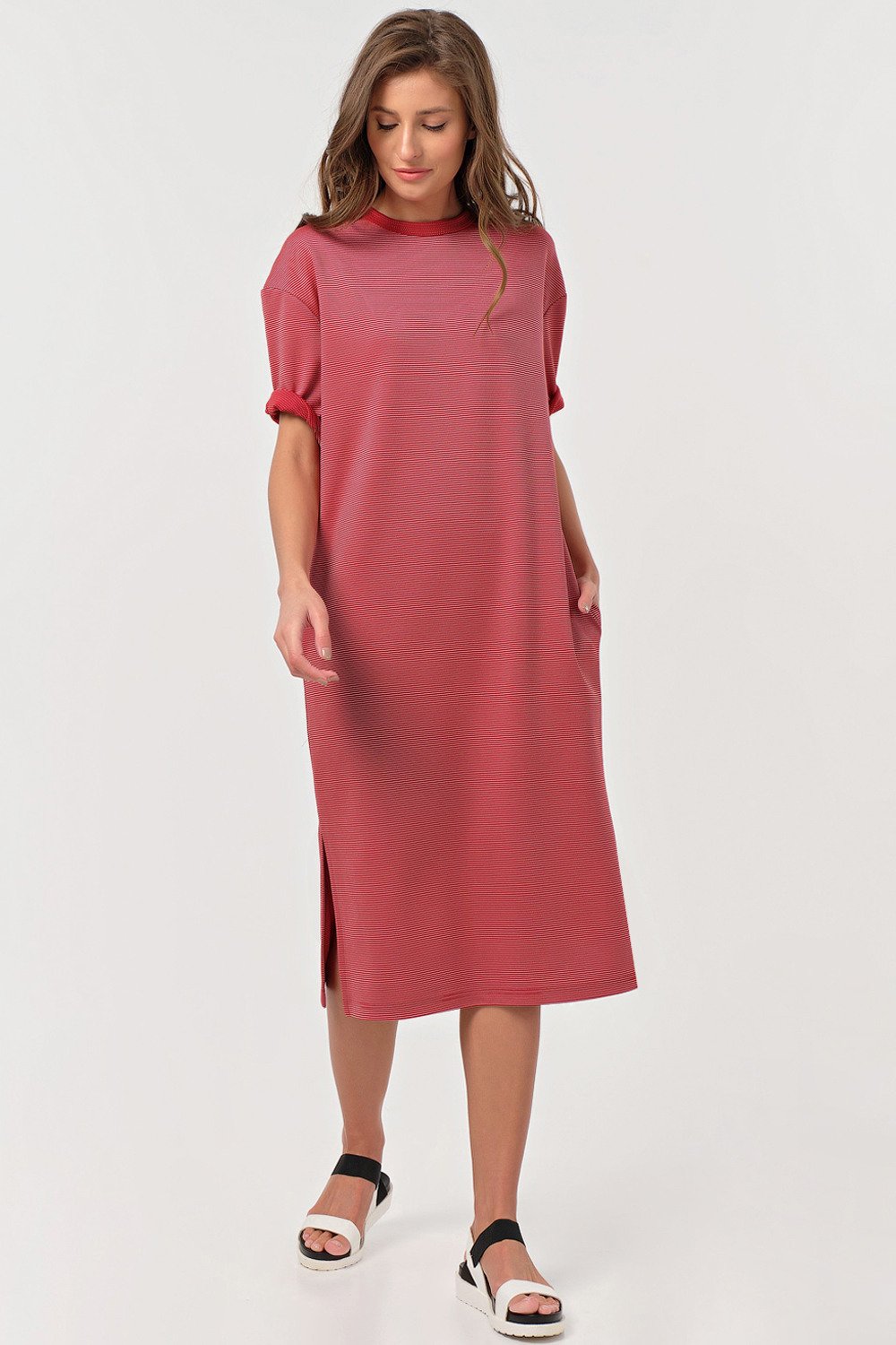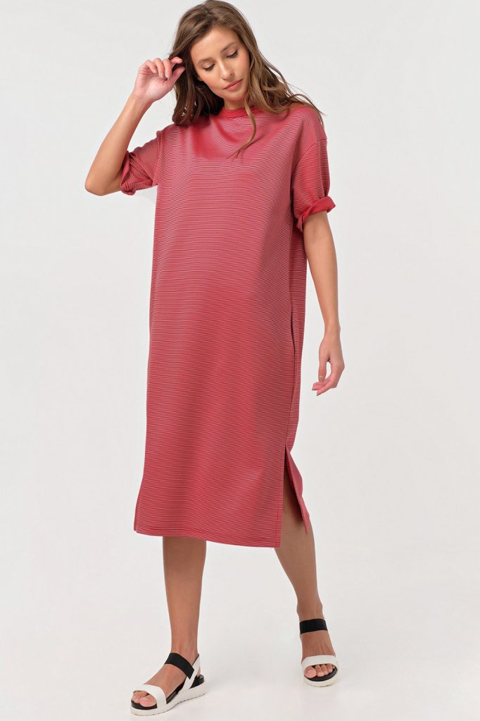 • Карманы: в боковых швах Особенности: Платье прямого силуэта из плотного трикотажа посадка свободная без прилегания. Детали: горловина обработана широкой окантовкой карманы в боковых швах разрезы. Без застежки.