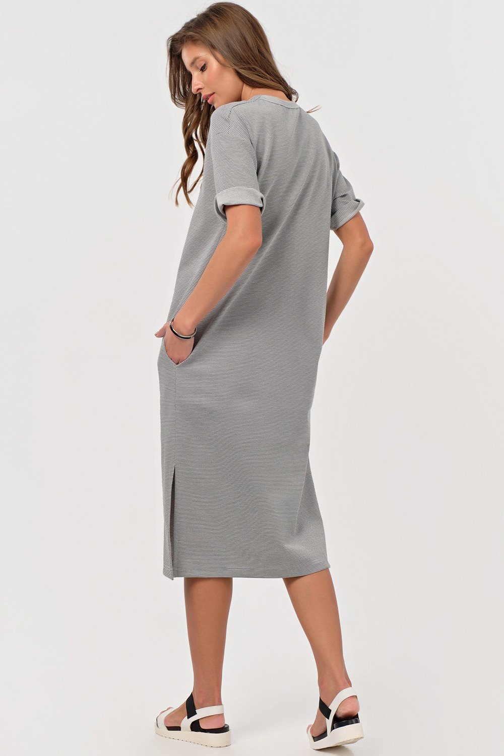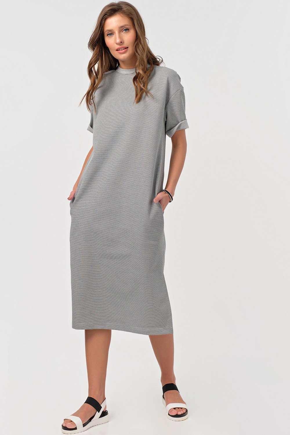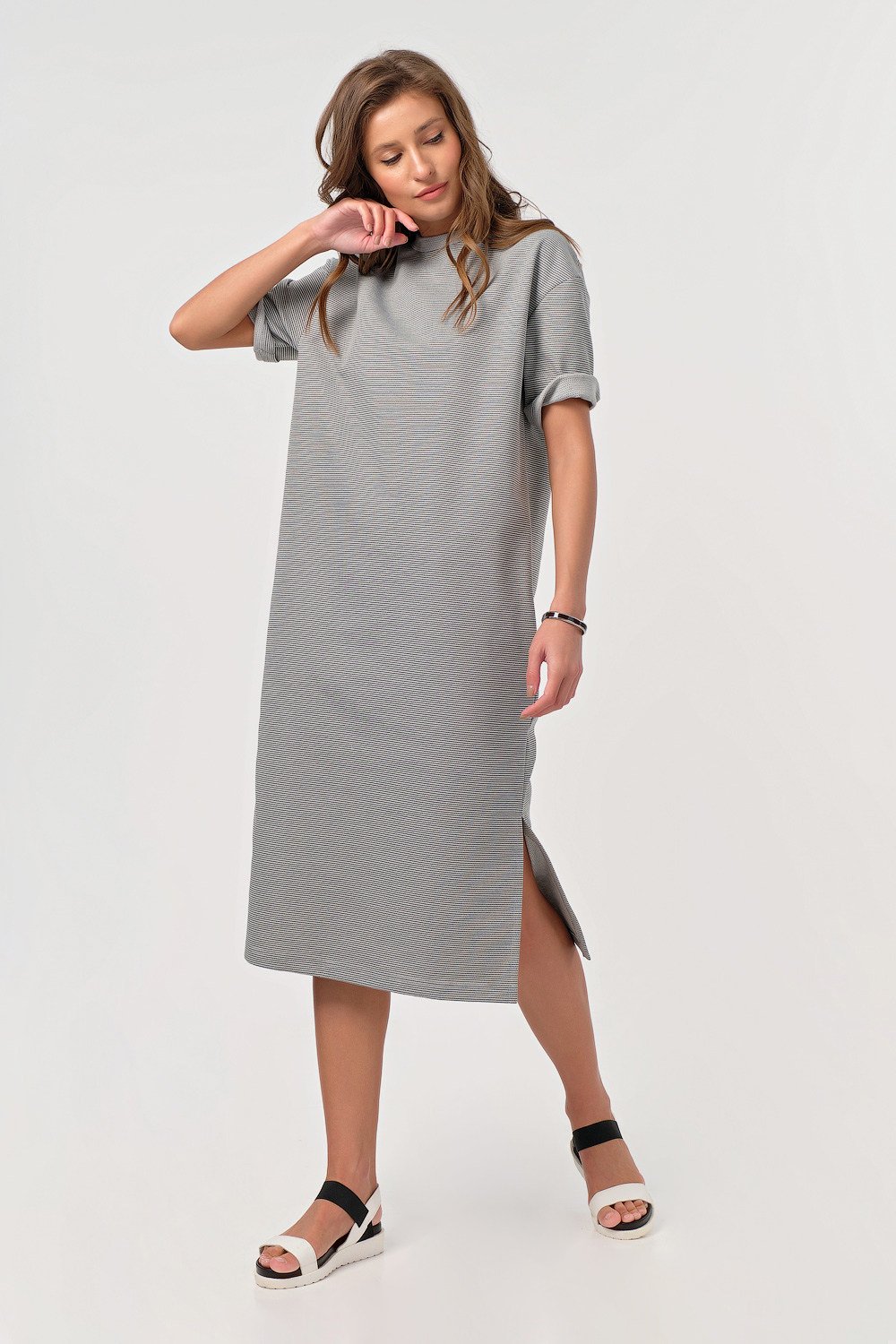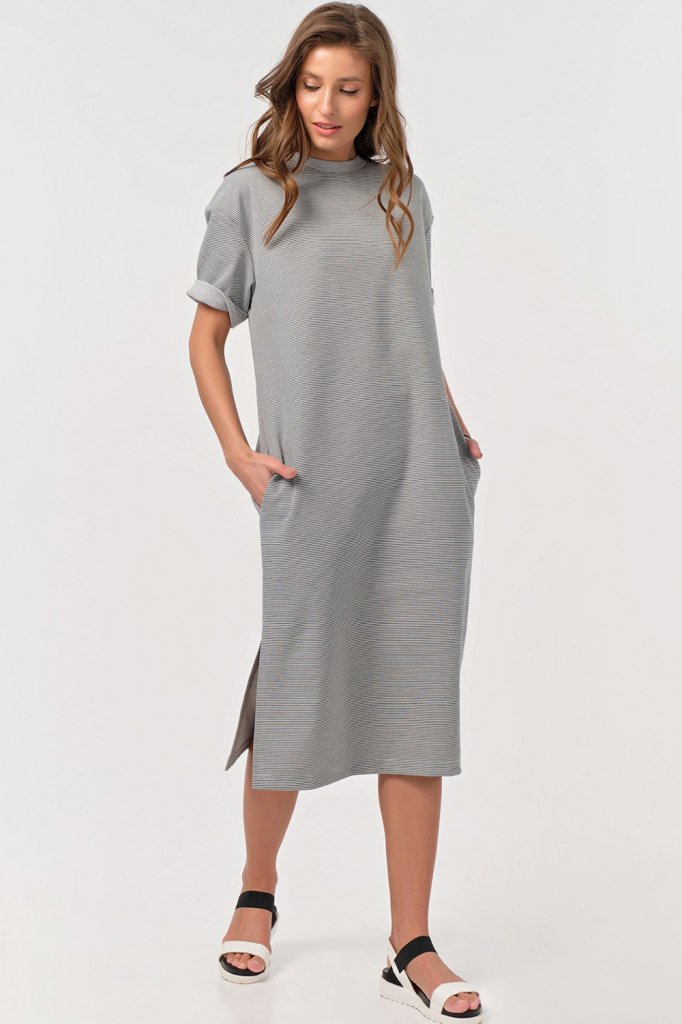 • Карманы: в боковых швах Особенности: Платье прямого силуэта из плотного трикотажа посадка свободная без прилегания. Детали: горловина обработана широкой окантовкой карманы в боковых швах разрезы. Без застежки.
