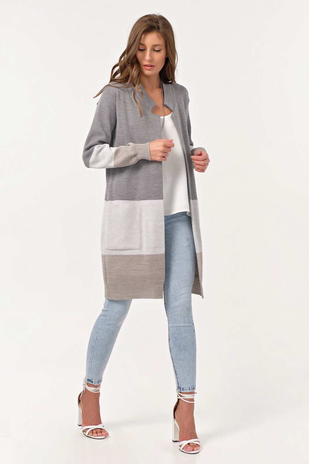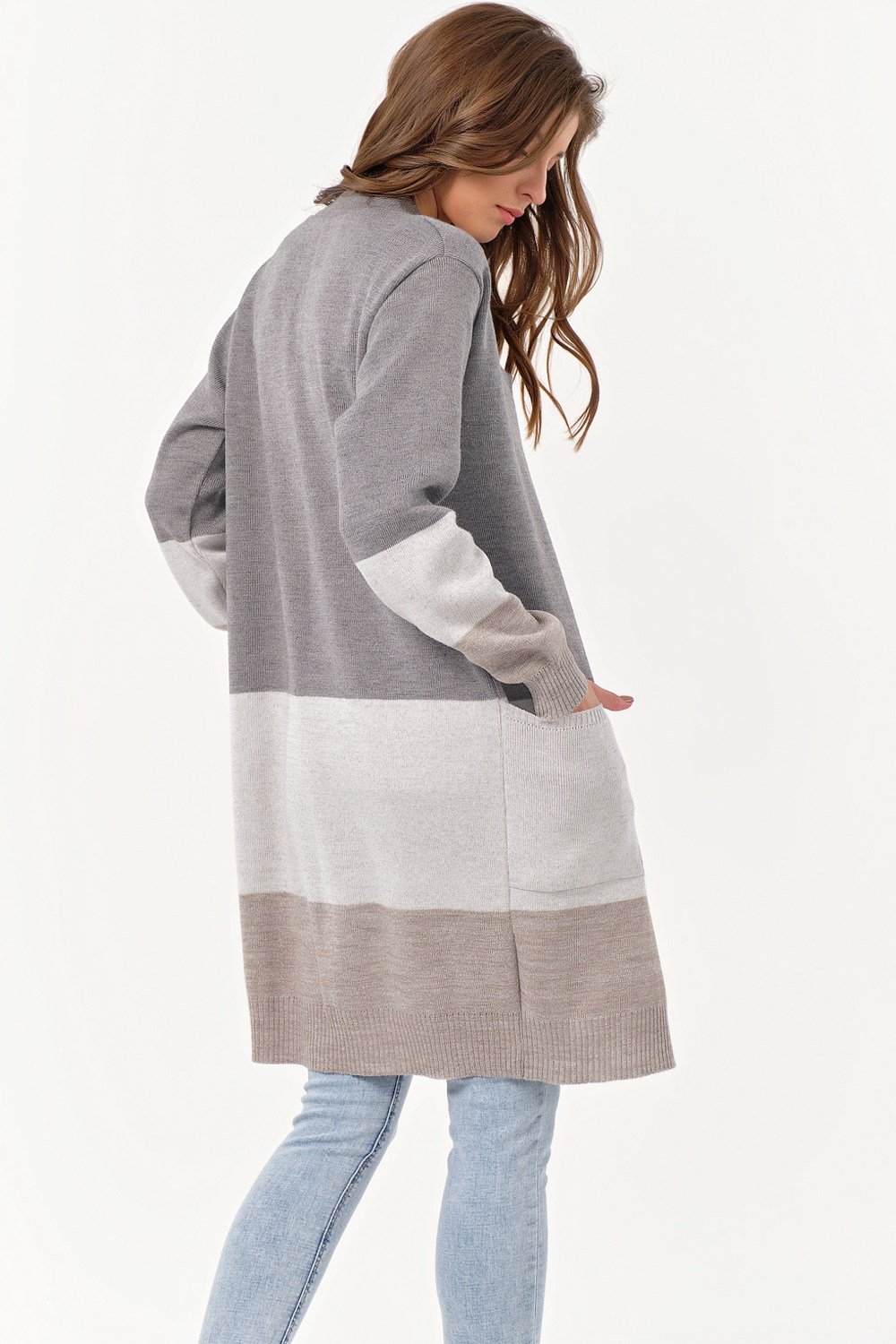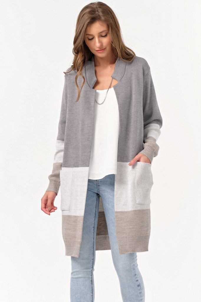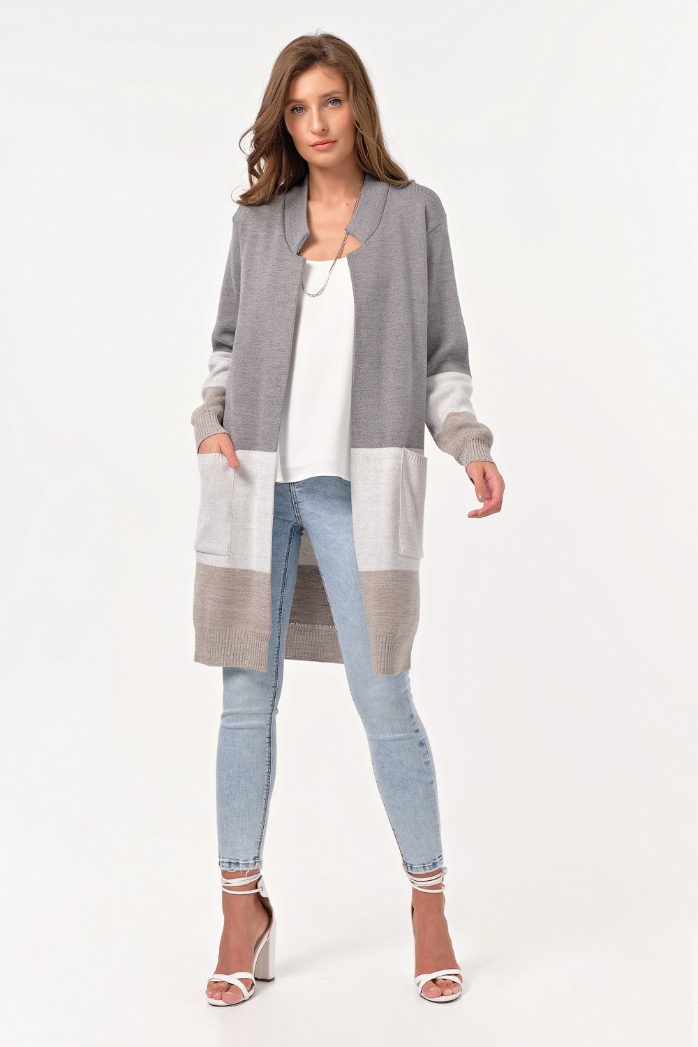 • Длина изделия: 95 см Особенности: Мягкий плотный вязаный кардиган с контрастными широкими меланжевыми полосками из смесовой пряжи из хлопка и шерсти. Карманы рукава низ изделия оформлены резинкой в рубчик.