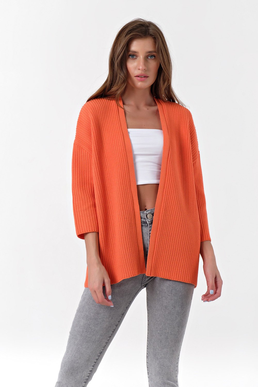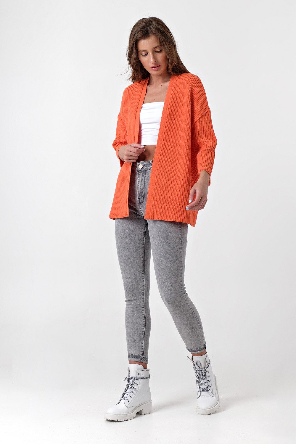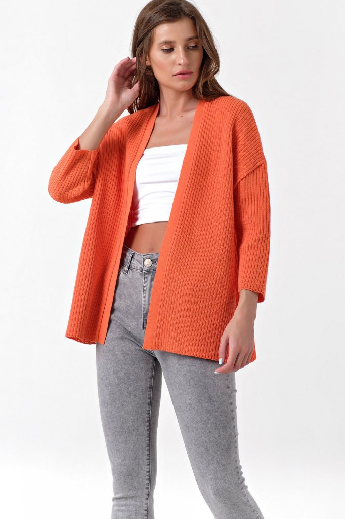 • Карманы: нет Особенности: Свободный вязаный кардиган выполнен фактурным способом из смесовой пряжи с содержанием хлопка. Горловина обработана плотной тонкой обтачкой.