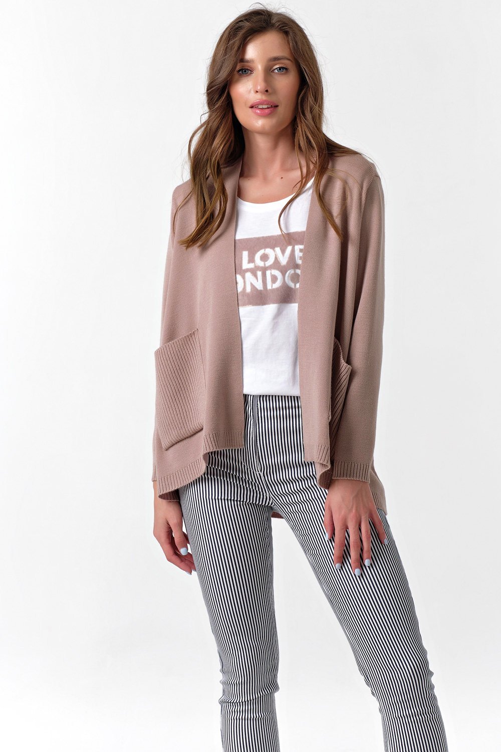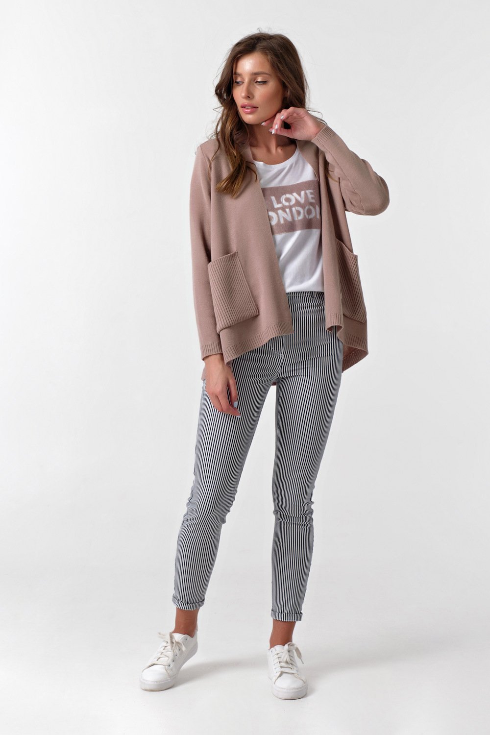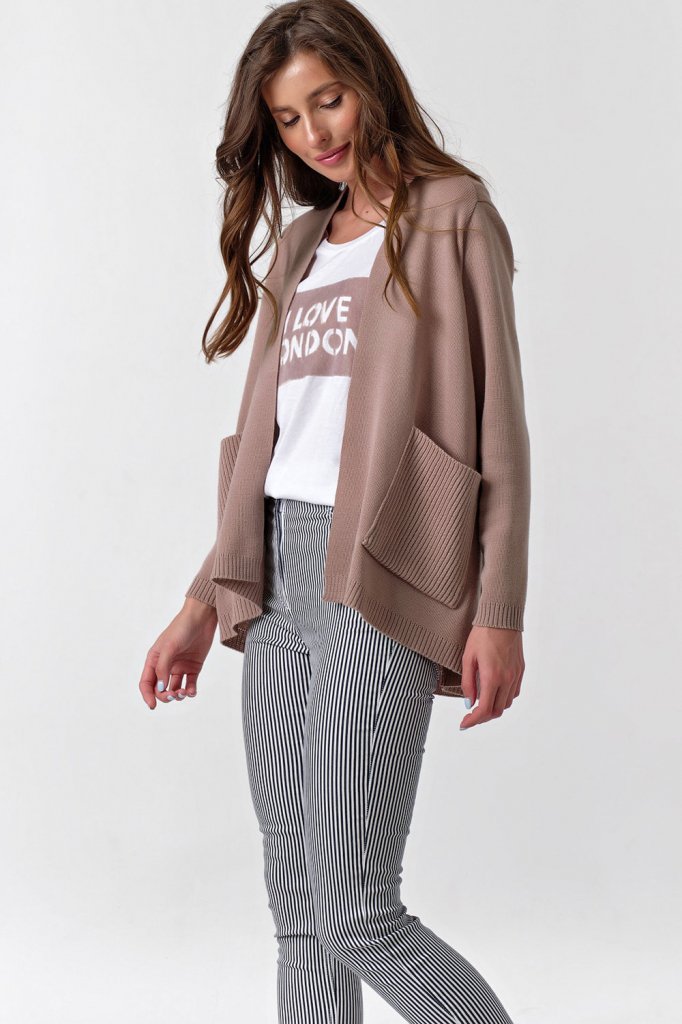 • Длина рукава: 56 см. Особенности: Мягкий кардиган из полушерстяной пряжи. Низ изделия рукава и карманы оформлены фактурной резинкой.