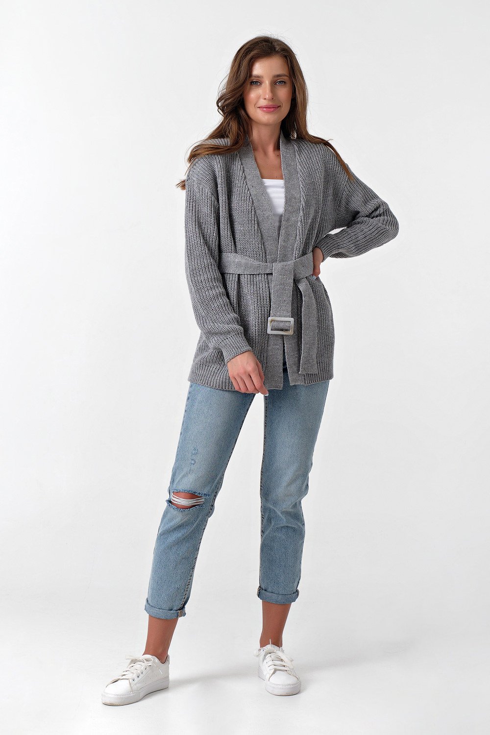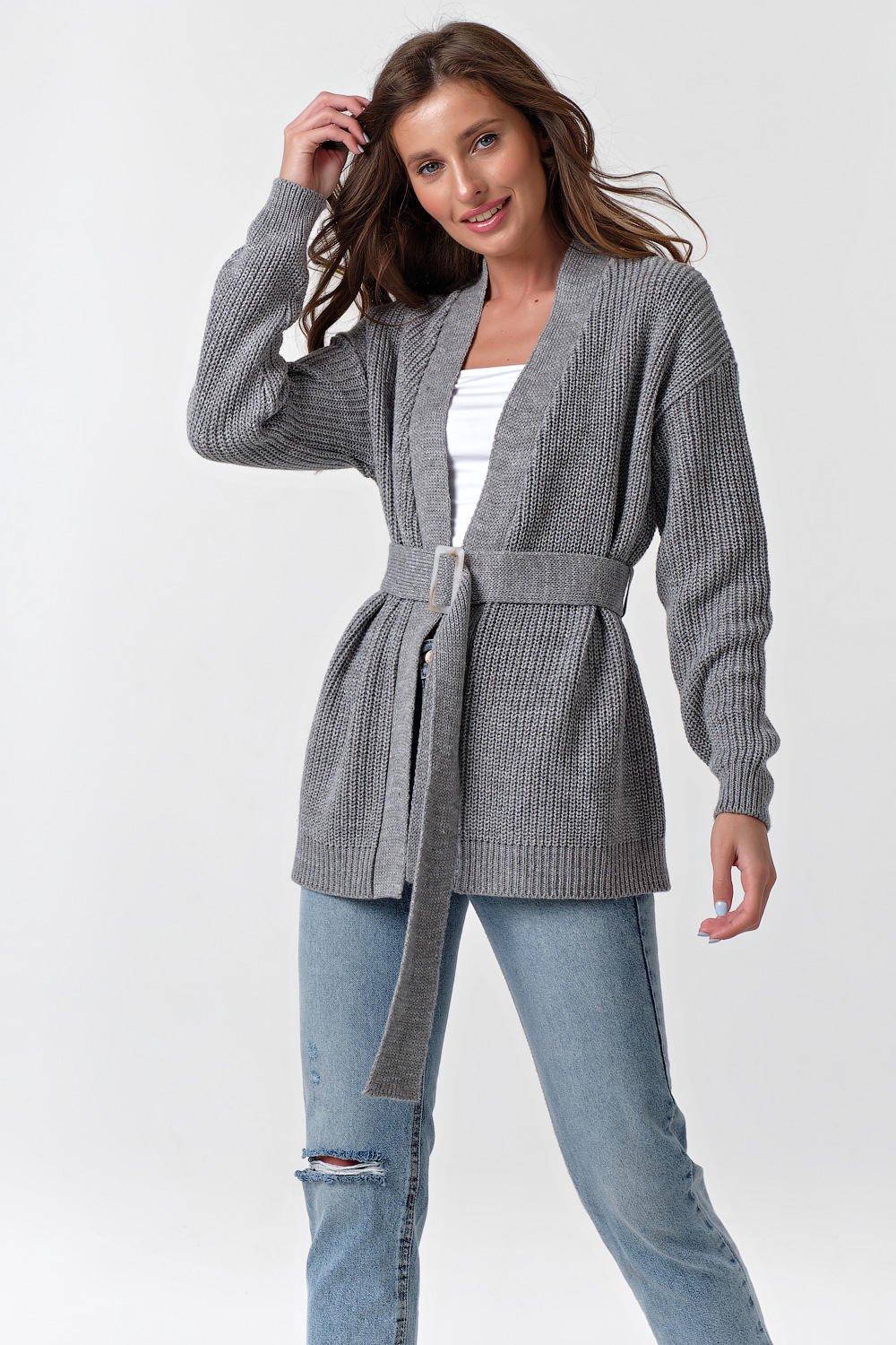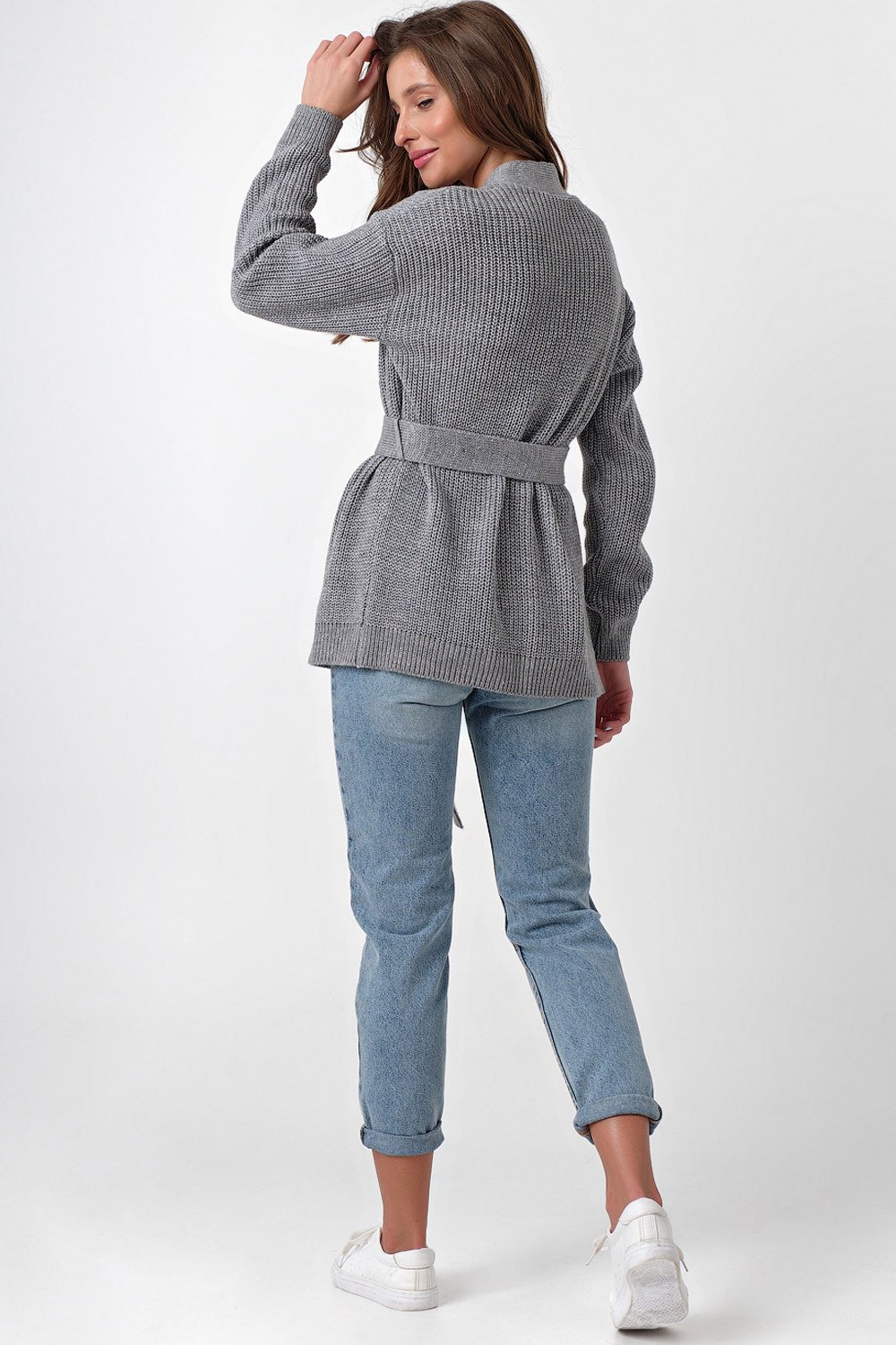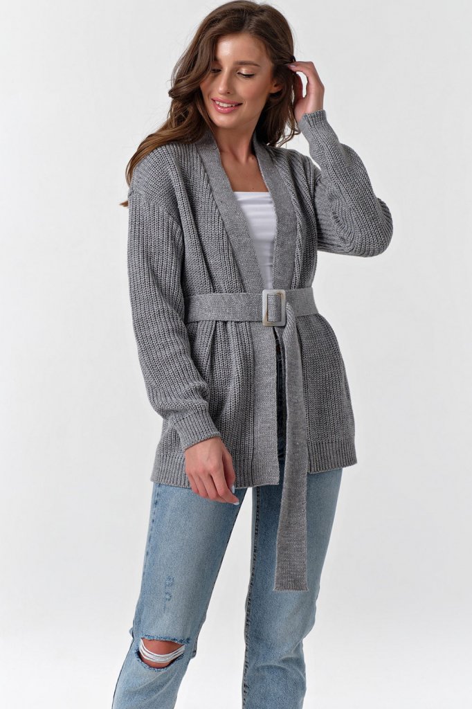 • Карманы: нет Особенности: Вязаный кардиган выполнен фактурным способом из смесовой пряжи с содержанием хлопка дополнен съемным поясом.