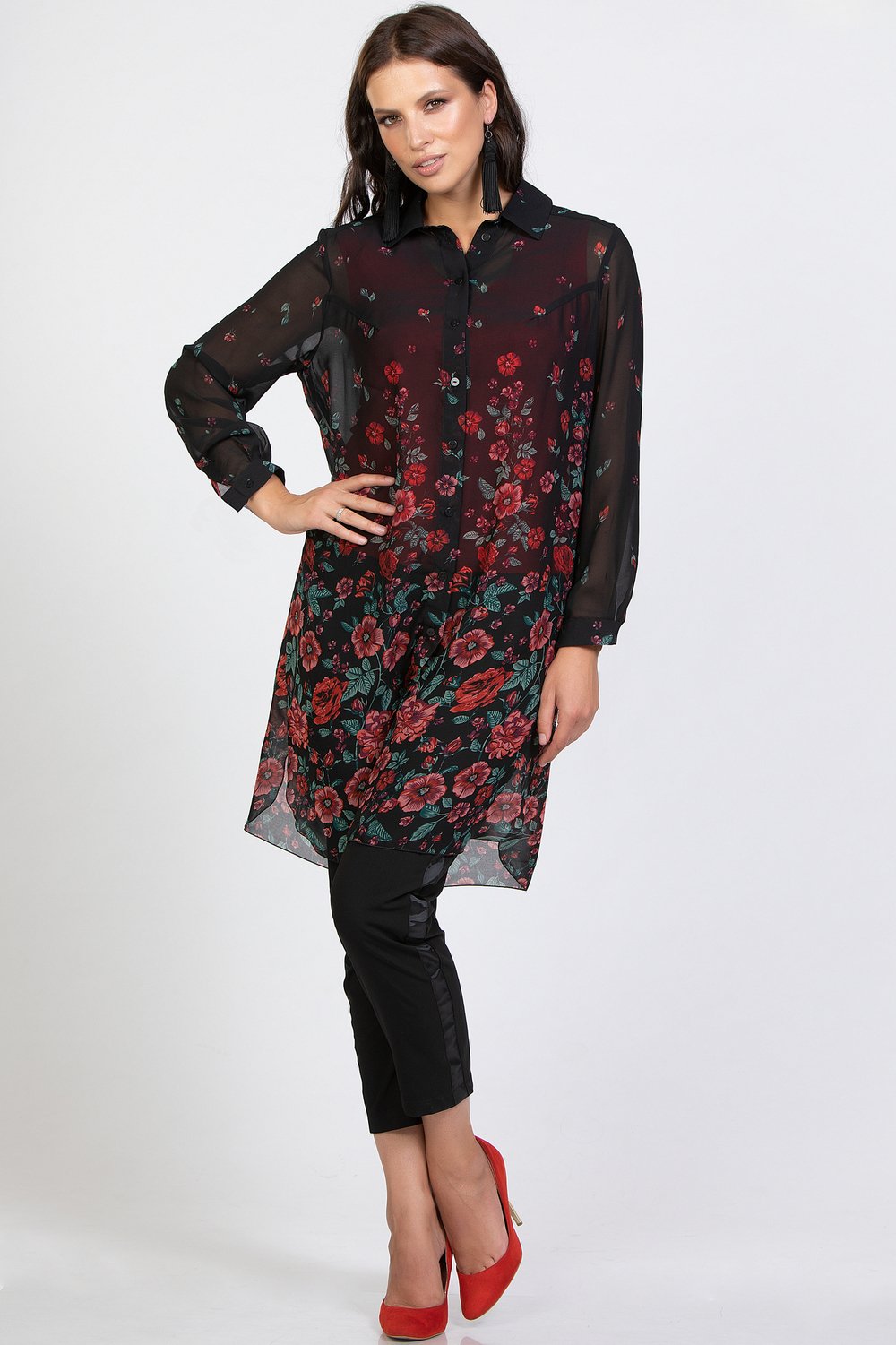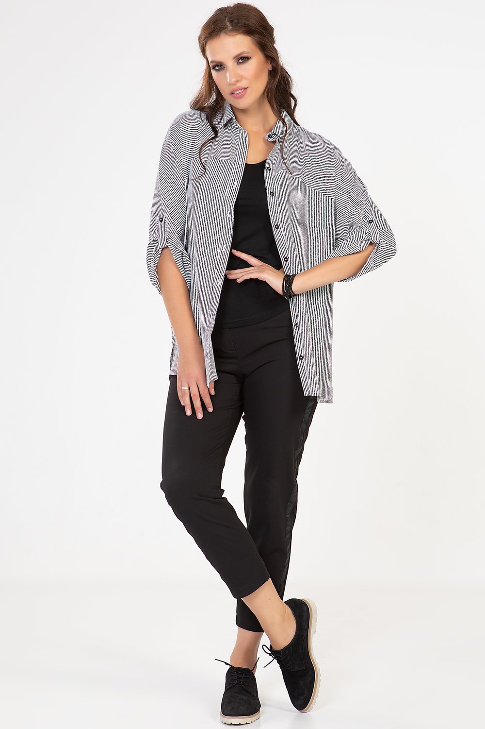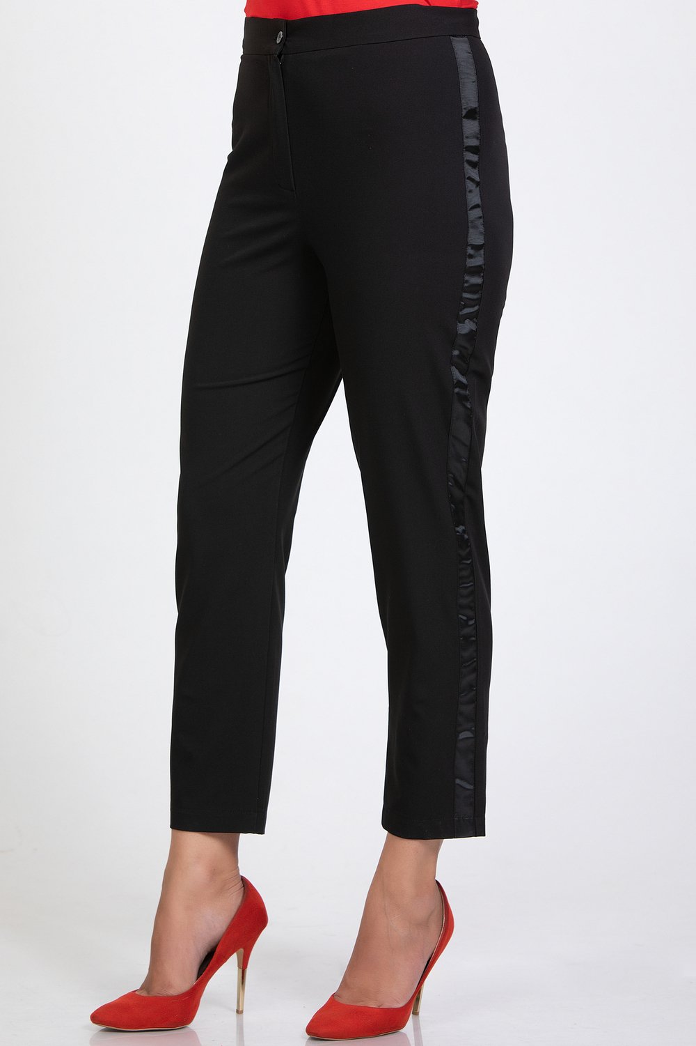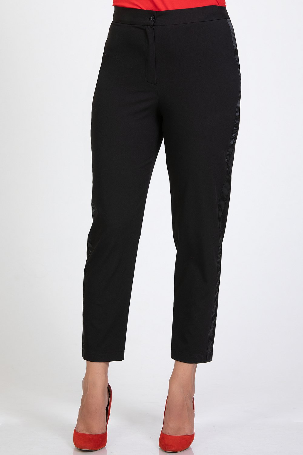 Классические брюки на поясе из костюмной ткани со стрейчем. По боковому шву настрочена репсовая лента черного цвета, шириной 2, 5 см. С 58 размера в пояс вставлена резина. Застёжка на молнию и пуговицу. Отличное самостоятельное изделие в сочетании с блузами, свитерами, жакетами. Длина 7/8. Цвет черный, ткань костюмная со стрейчем. Аксессуары в комплект не входятХарактеристики: