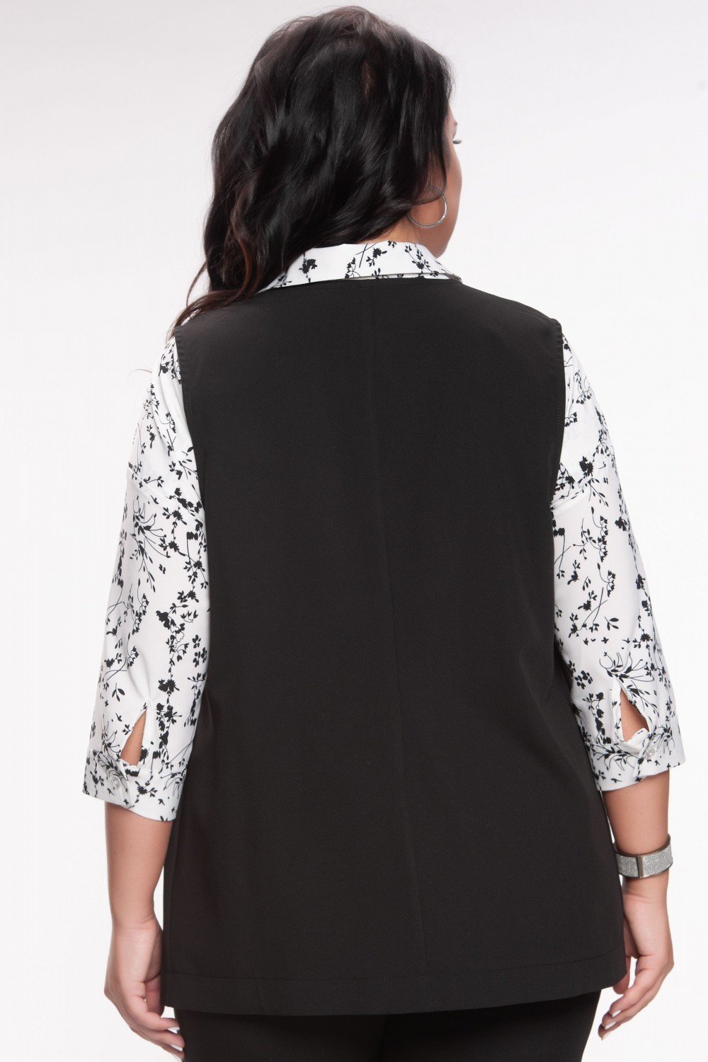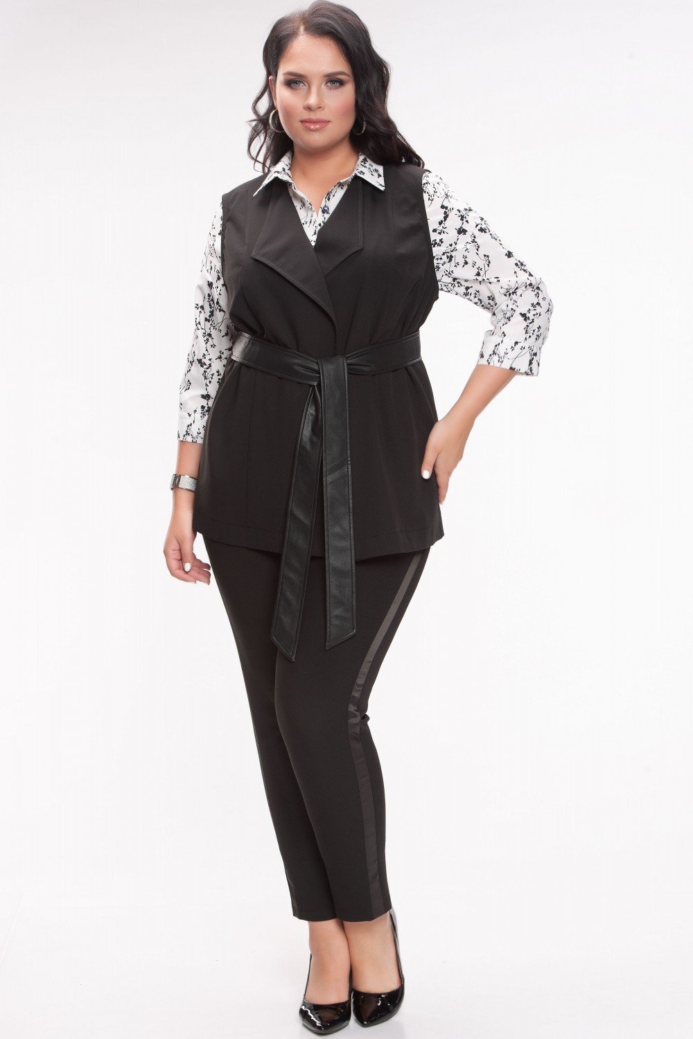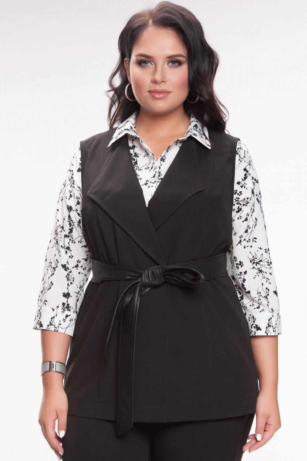Жилет прямого силуэта, с рельефами от плеча по переду и спинке, без застежки. Воротник отложной, цельновыкроенный с передом. К жилету прилагается пояс из трикотажного полотна под кожу. Цвет ткани черный.Характеристики: