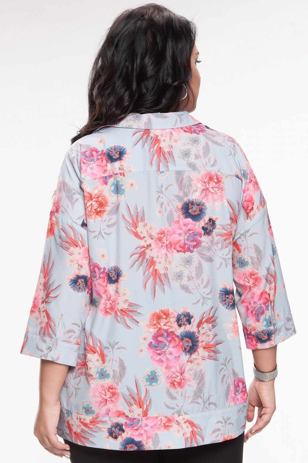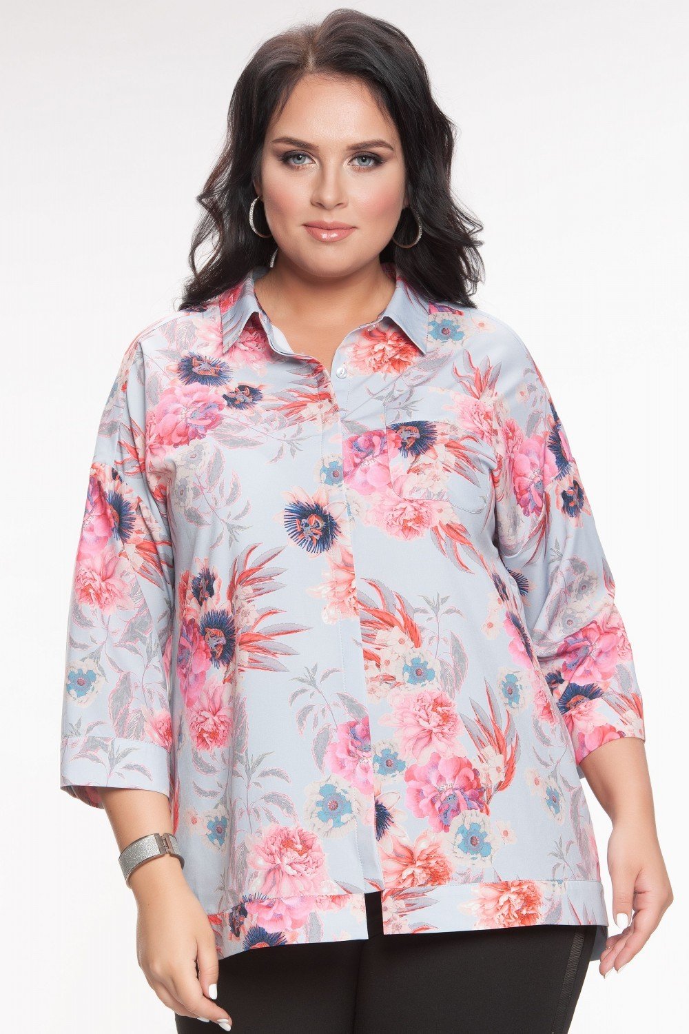 Элегантная блуза нежной цветочной расцветки на белом фоне из блузочной ткани-незаменимая вещь в гардеробе! Носится навыпуск, т. к. низ блузы выполнен разноуровневым. Свободный силуэт, рукав с манжетой длиной 3/4. Классический воротничок. Пуговицы скрыты планкой. Аксессуары в комплект не входят. Размеры сдвоенные, 44/46, 48/50 и т. д.
