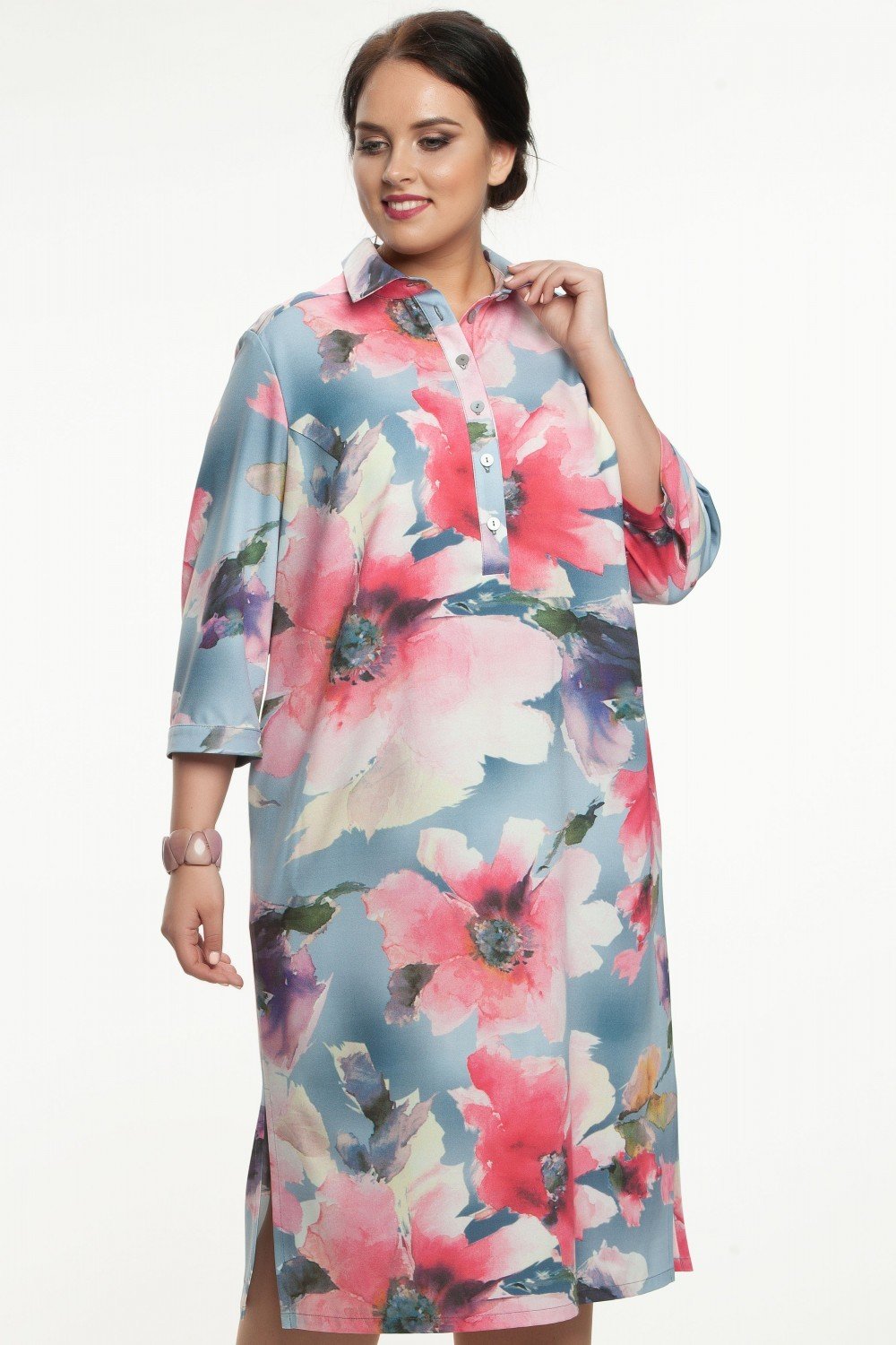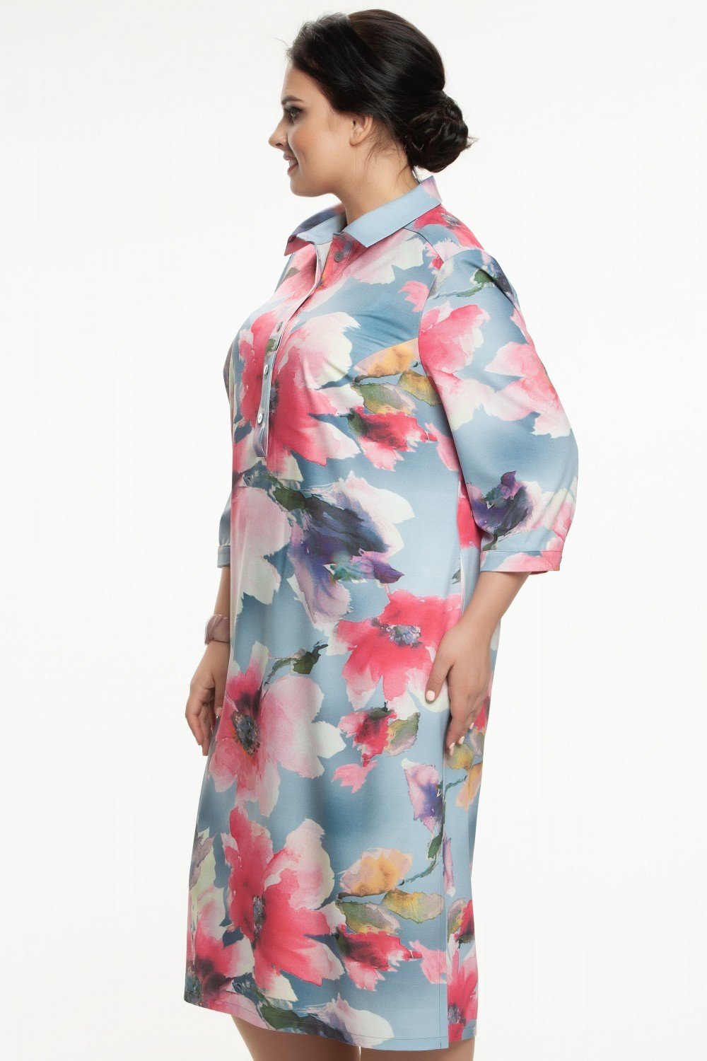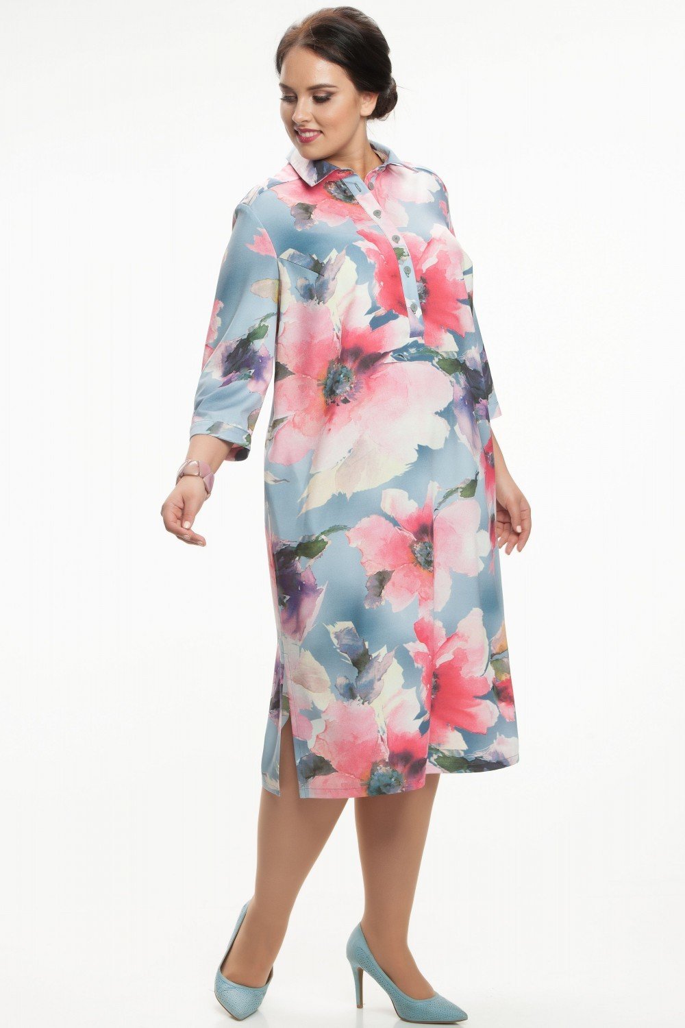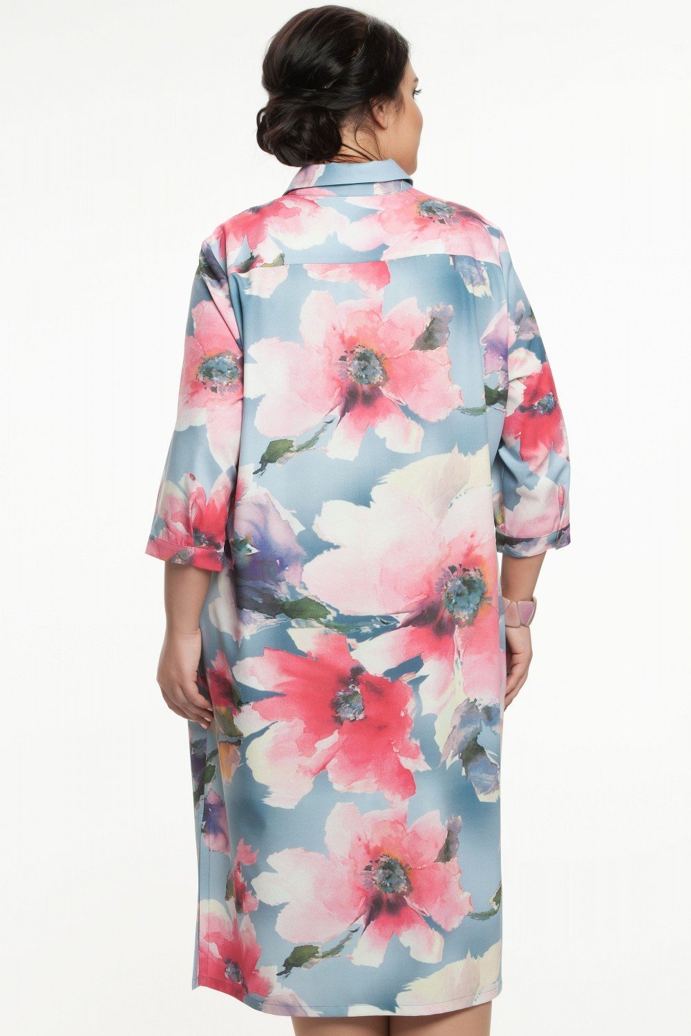 Платье прямого силуэта, с карманами в боковом шве и разрезами. Рукав втачной, 3/4, по низу на притачной манжете, застегивающейся на петлю и пуговицу. Перед с короткой центральной застежкой на планку, застегивающуюся на петли и пуговицы. Воротник отложной на стойке, застегивающейся на петлю и пуговицу.Характеристики: