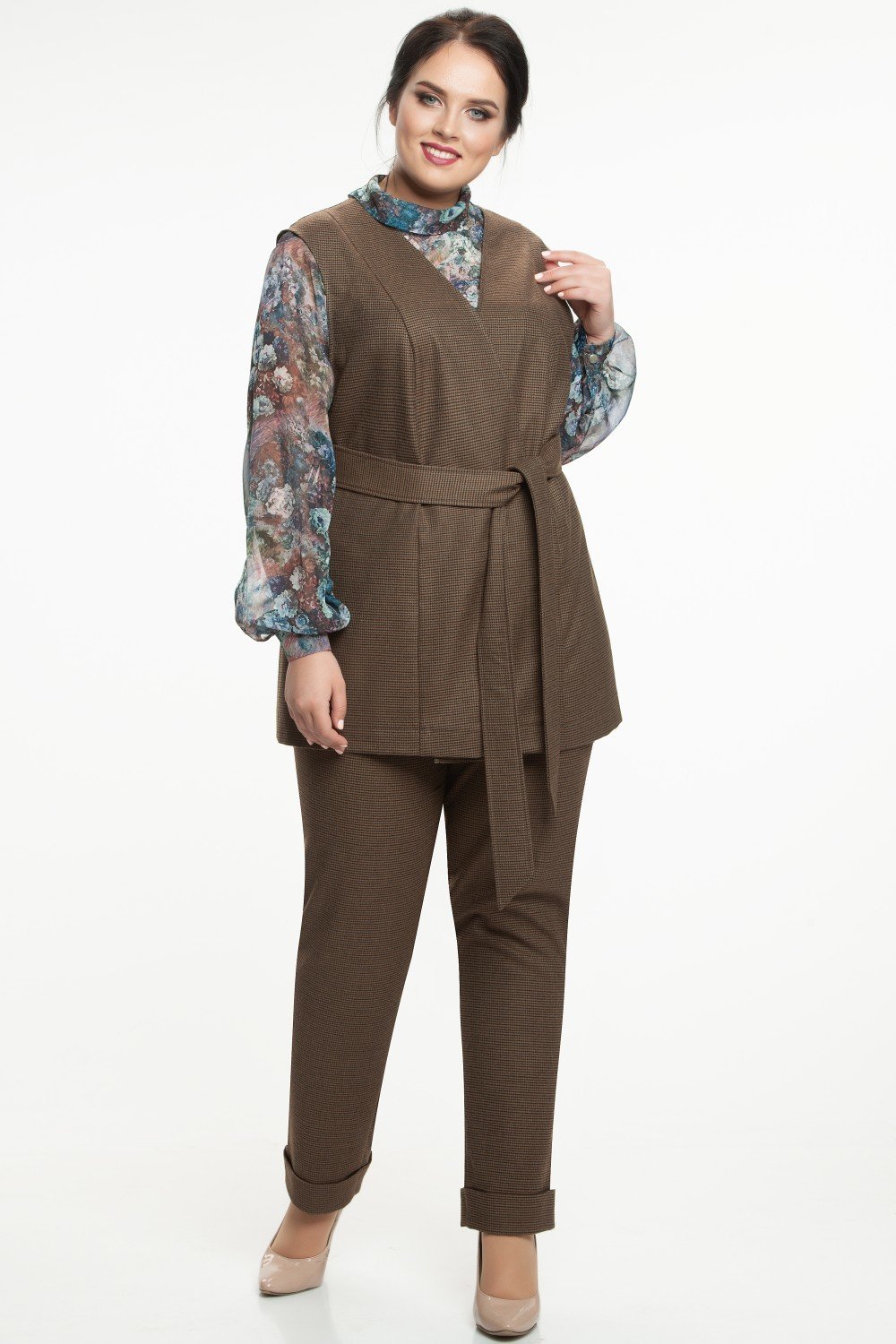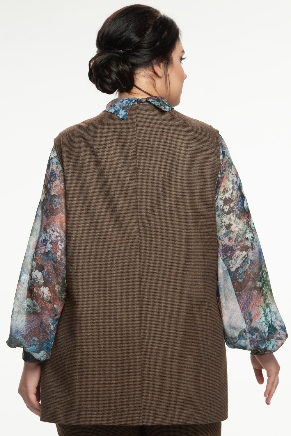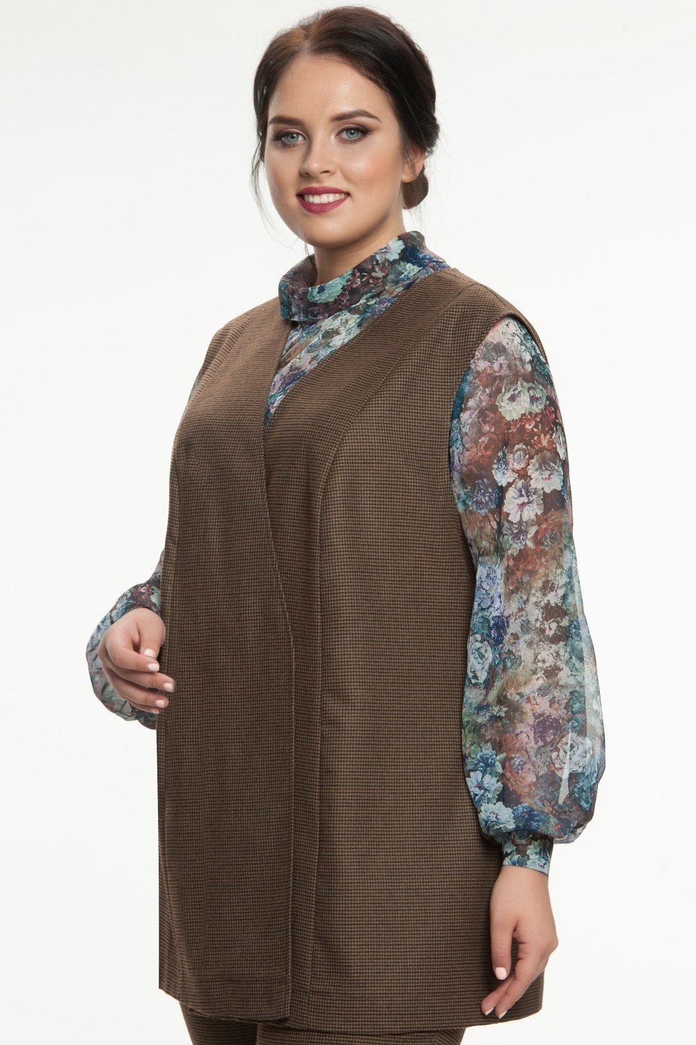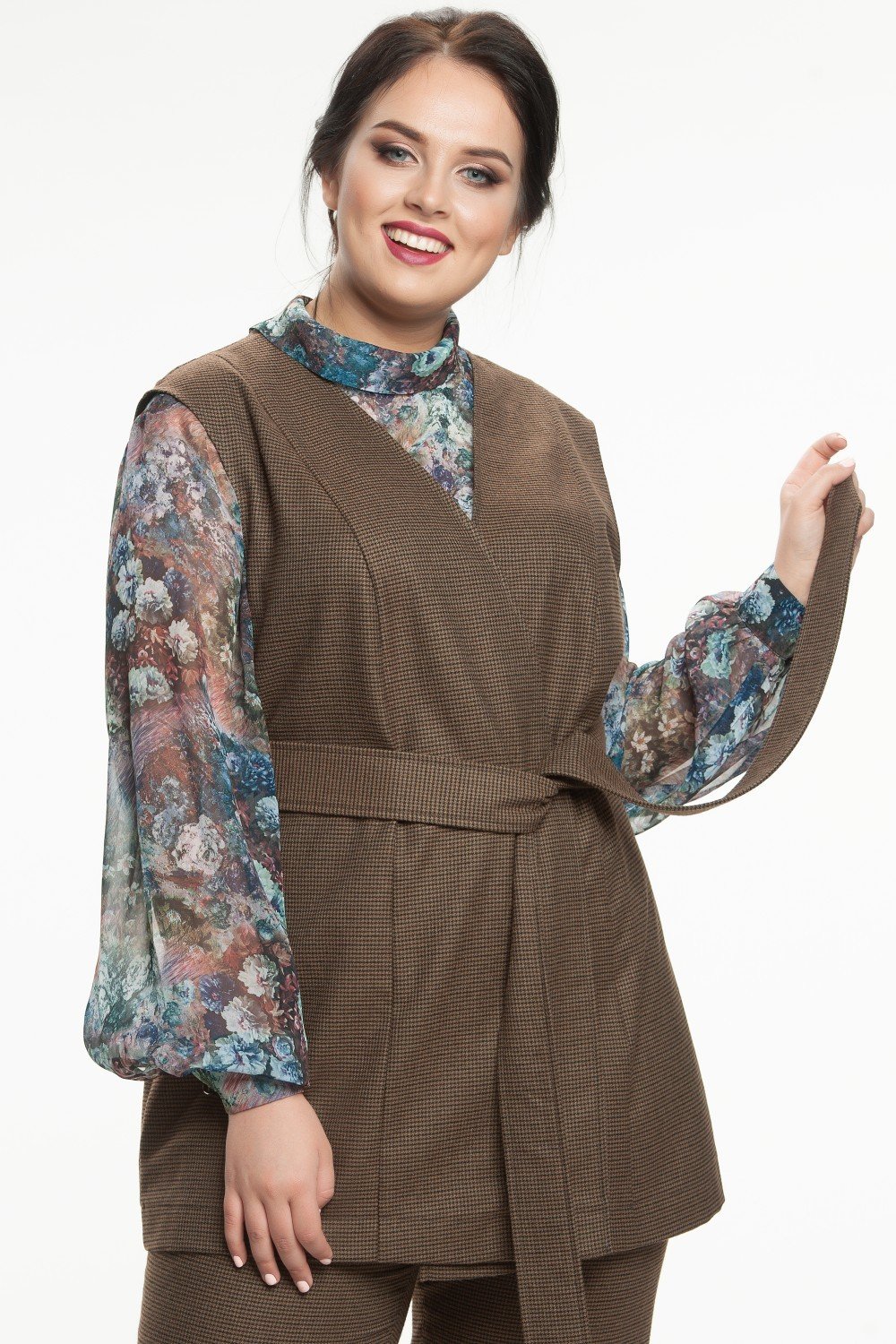 Жилет прямого силуэта, с рельефами от плеча по переду и спинке, без застежки, без воротника. К жилету прилагается пояс из основной тканиХарактеристики: