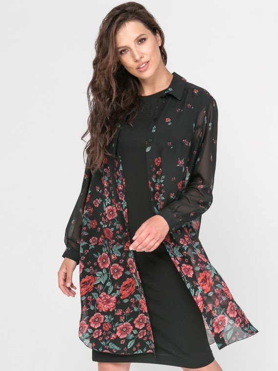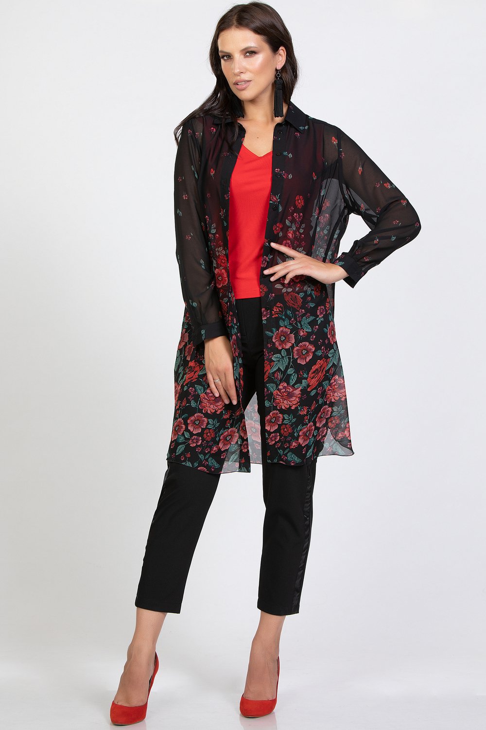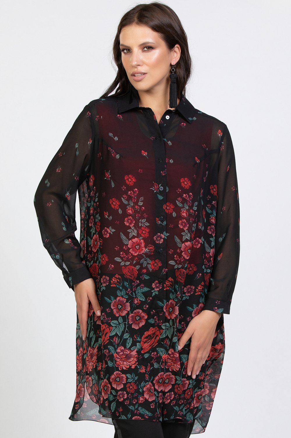 Блуза прямого силуэта с закругленным низом по переду и спинке . Перед по центру с застежкой на петли и пуговицы. Спинка с двойной кокеткой. Рукав втачной, длинный, по низу на притачной манжете, застегивающейся на петлю и пуговицу. Воротник с острыми концами на притачной стойке, застегивающейся на петлю и пуговицу. Размеры у блузы сдвоенные.Характеристики: