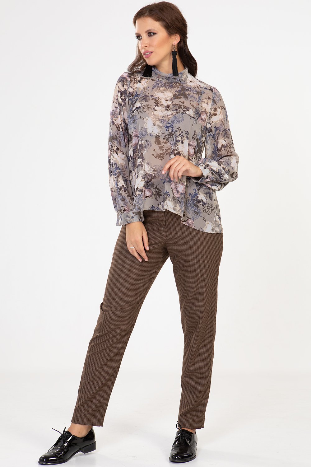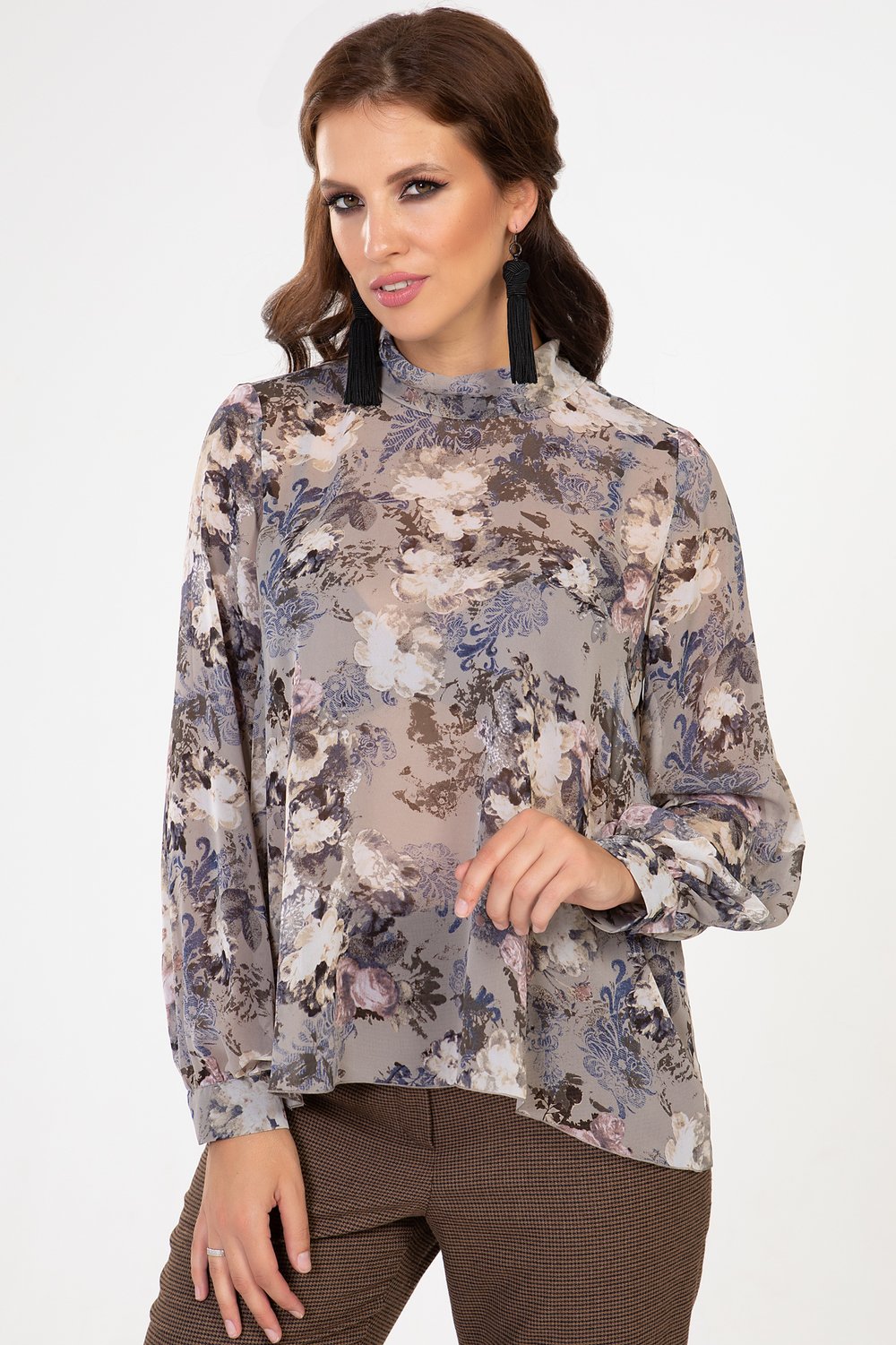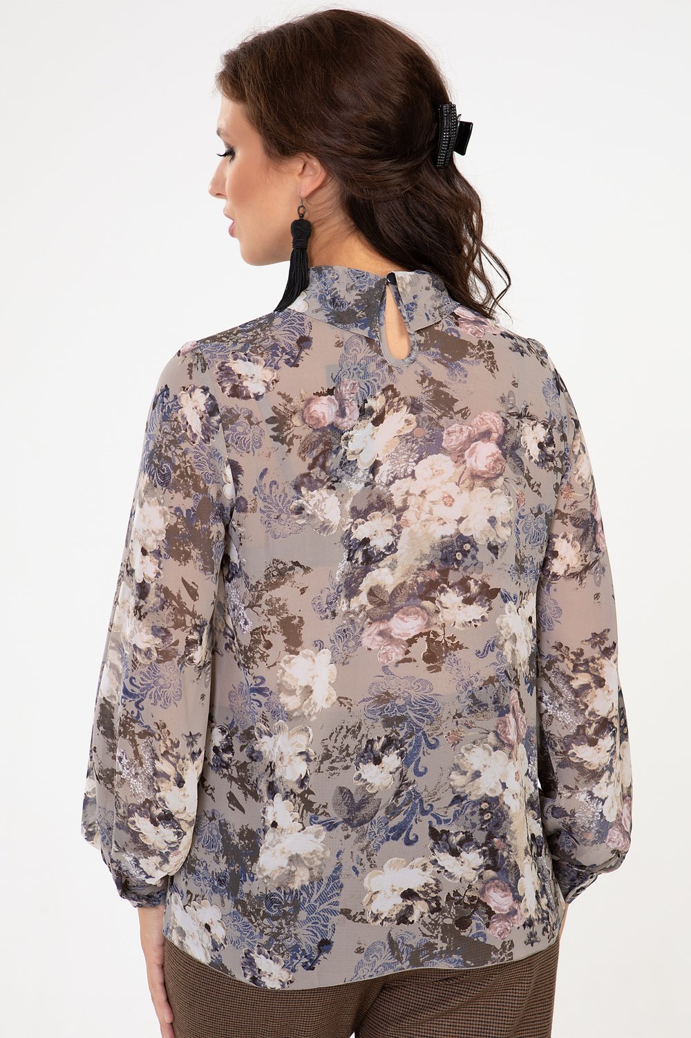 Блуза трапециевидного силуэта, разноуровневая. Рукав длинный, на манжете, застегивающейся на петлю и пуговицу. Воротник-хомутик. Спинка с капелькой, застегивающейся на навесную петлю и пуговицу.Характеристики: