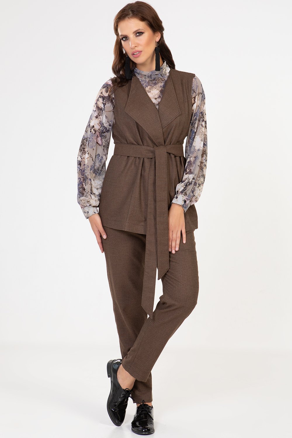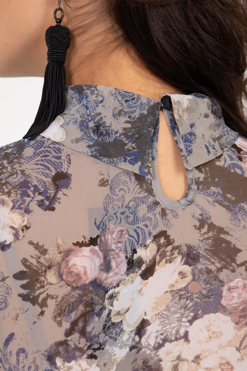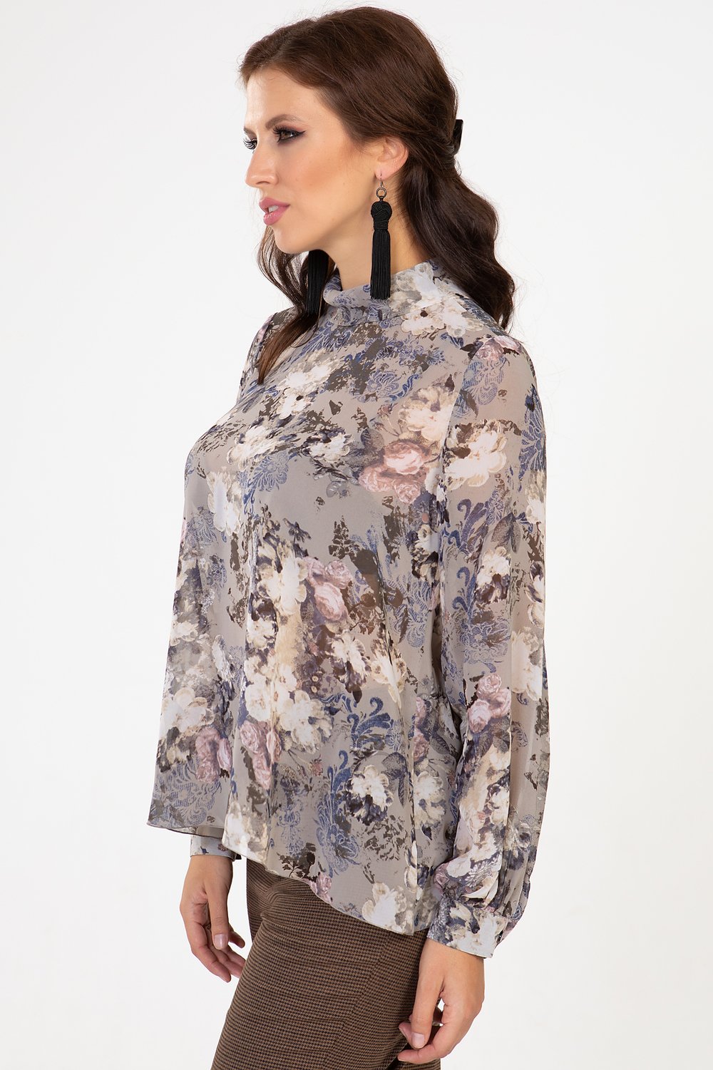 Блуза трапециевидного силуэта, разноуровневая. Рукав длинный, на манжете, застегивающейся на петлю и пуговицу. Воротник-хомутик. Спинка с капелькой, застегивающейся на навесную петлю и пуговицу.Характеристики: