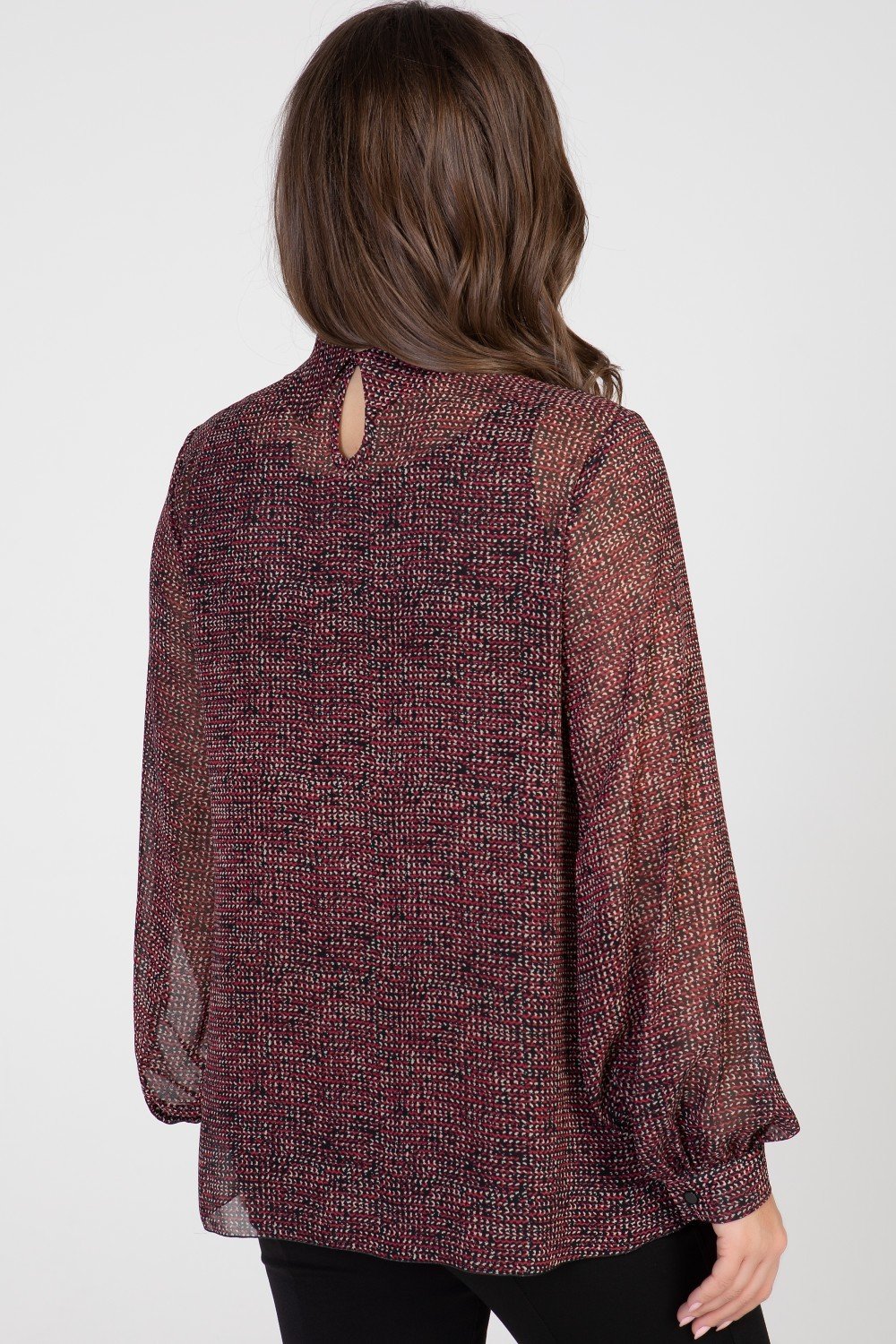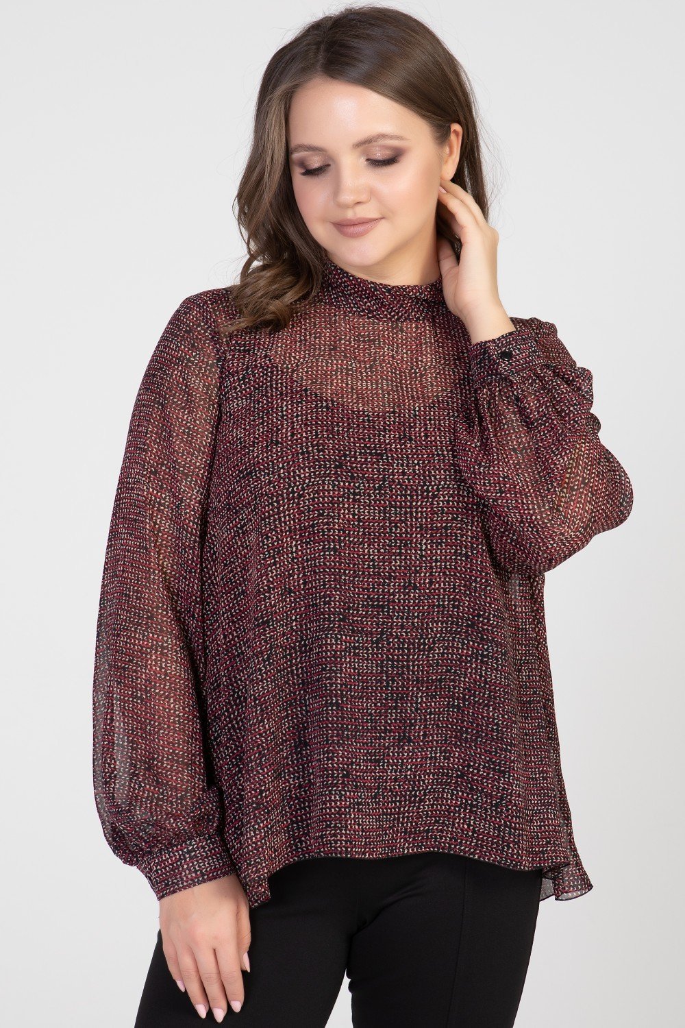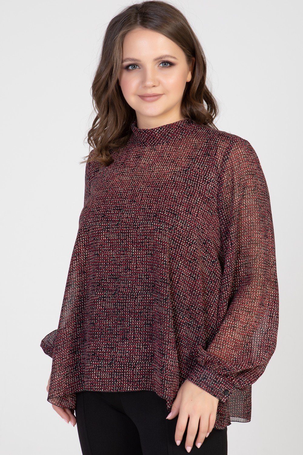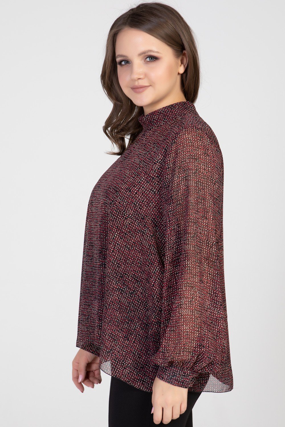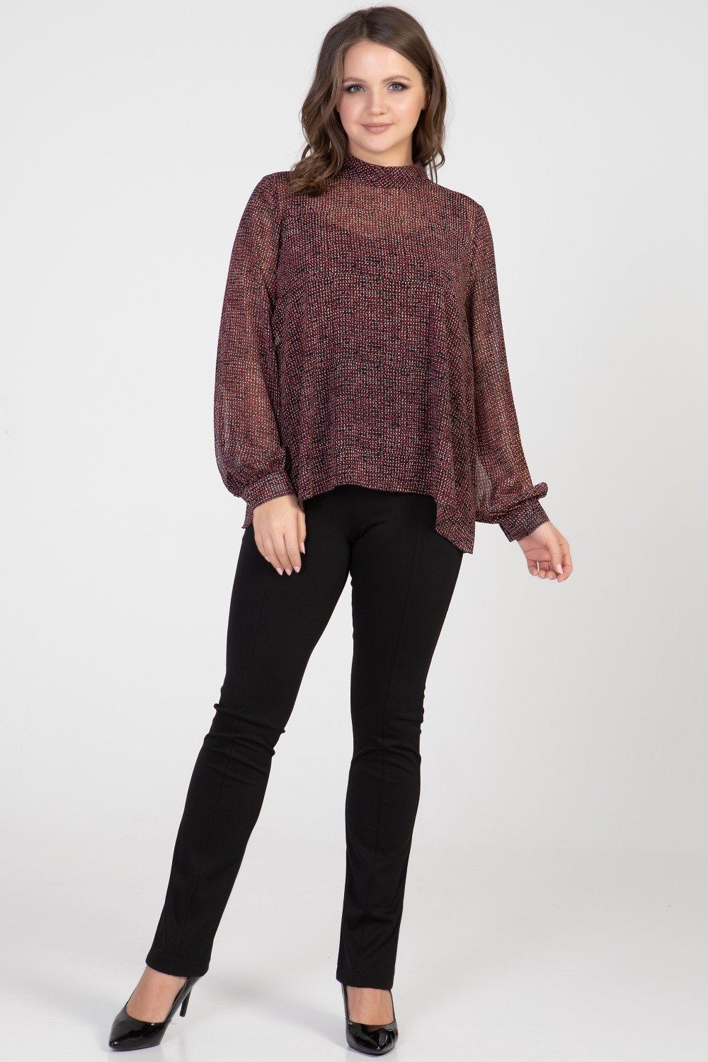 Блуза трапециевидного силуэта, разноуровневая. Рукав длинный, на манжете, застегивающейся на петлю и пуговицу. Воротник-хомутик. Спинка с капелькой, застегивающейся на навесную петлю и пуговицу.