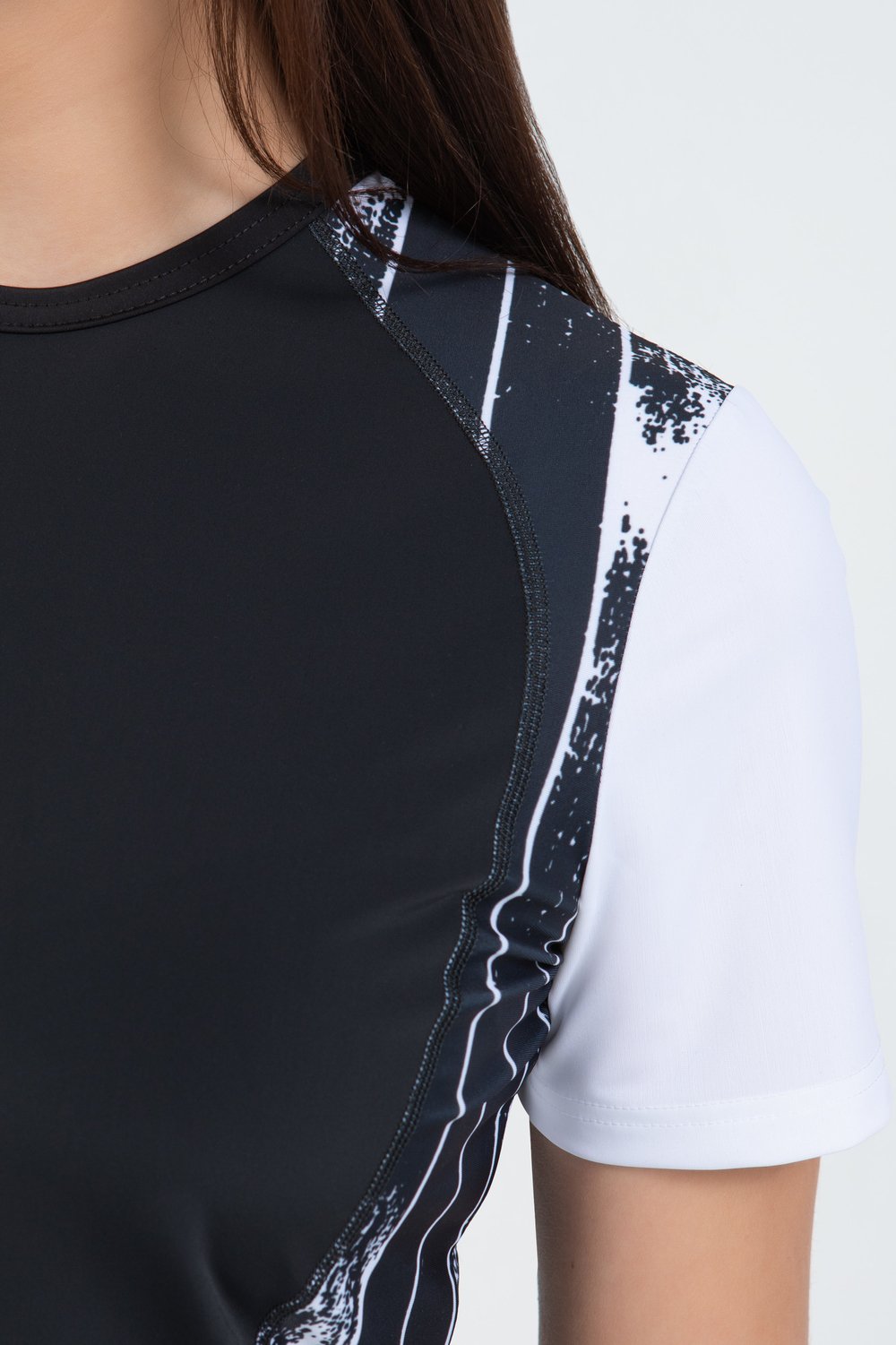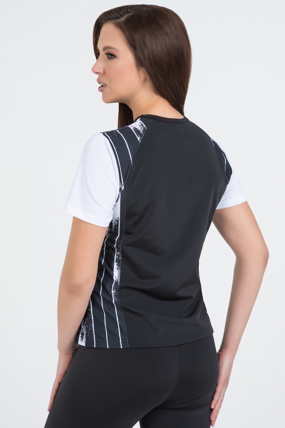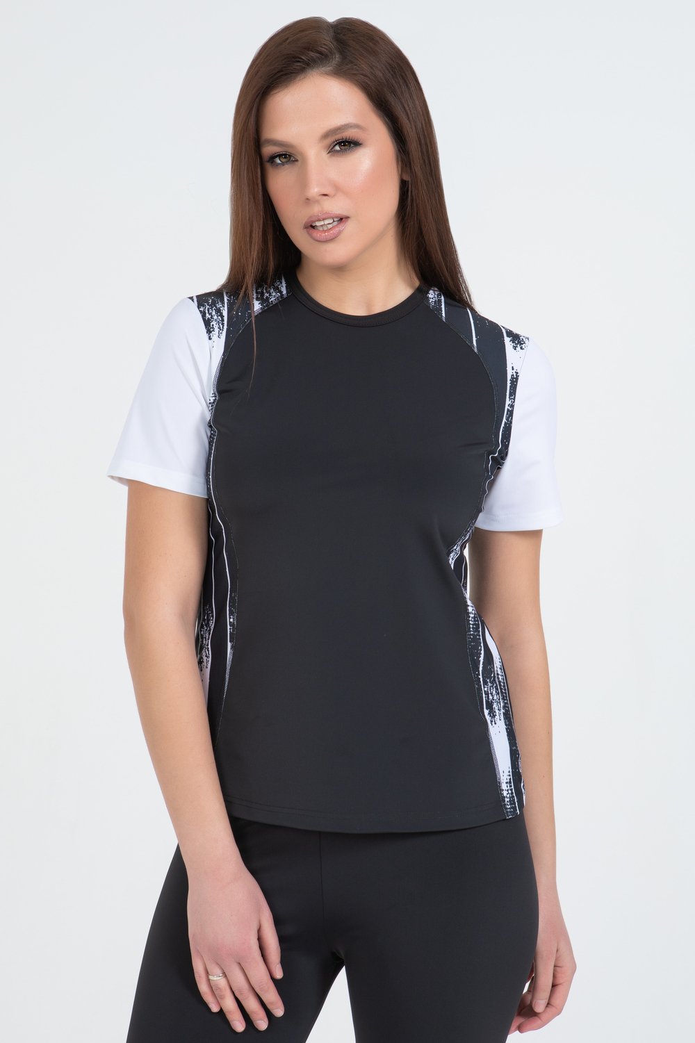 Блуза полуприлегающего силуэта. По передней и задней половинке рельефные швы-выполненные на машине флэтлок плоский шов. Рукав втачной, короткий.Характеристики: