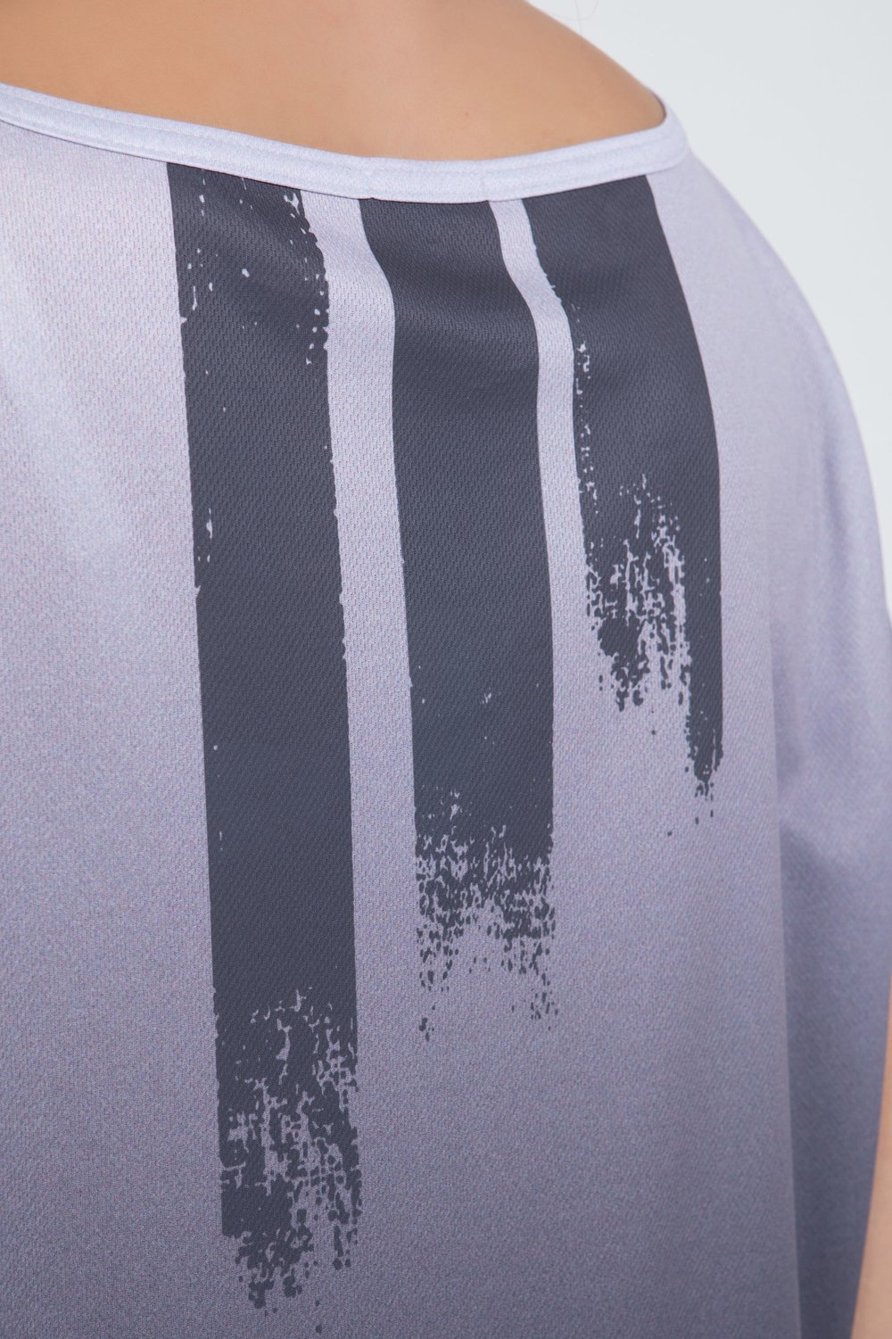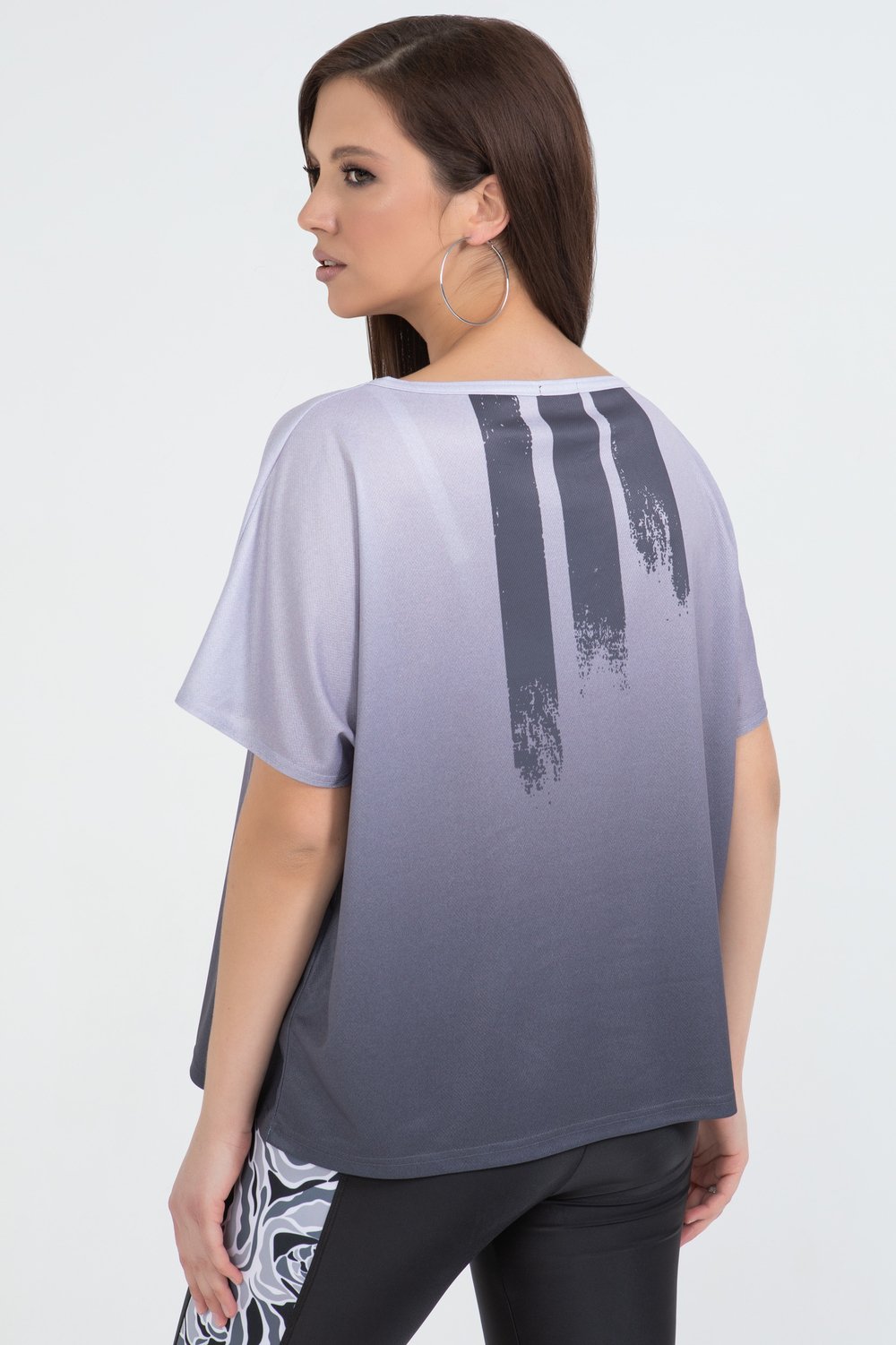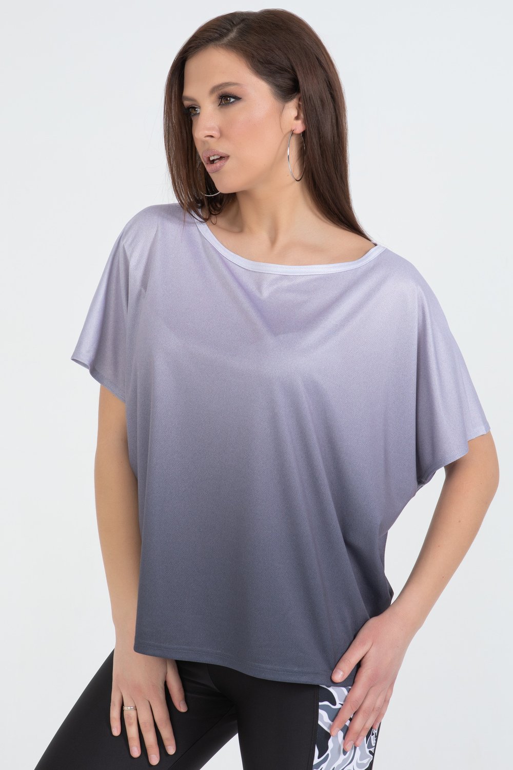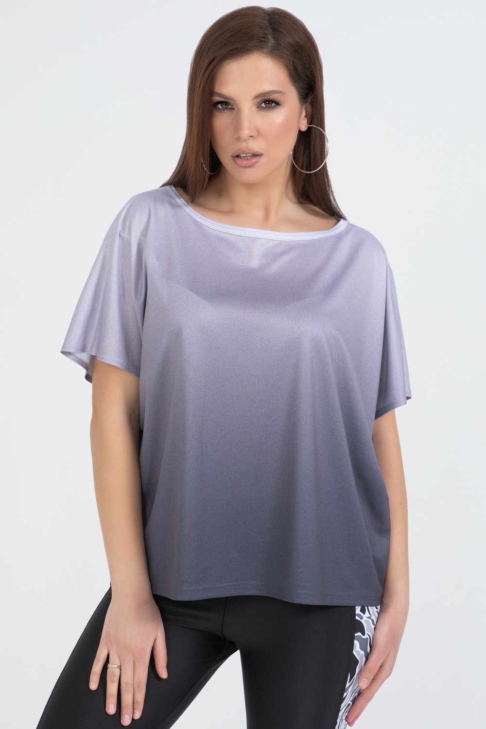 Блуза прямого силуэта. Выполнена с нанесением сублимационной печати с эффектом "омбре". Цельнокроенный, короткий рукав, плечо спущено. Вырез горловины лодочкой.Характеристики: