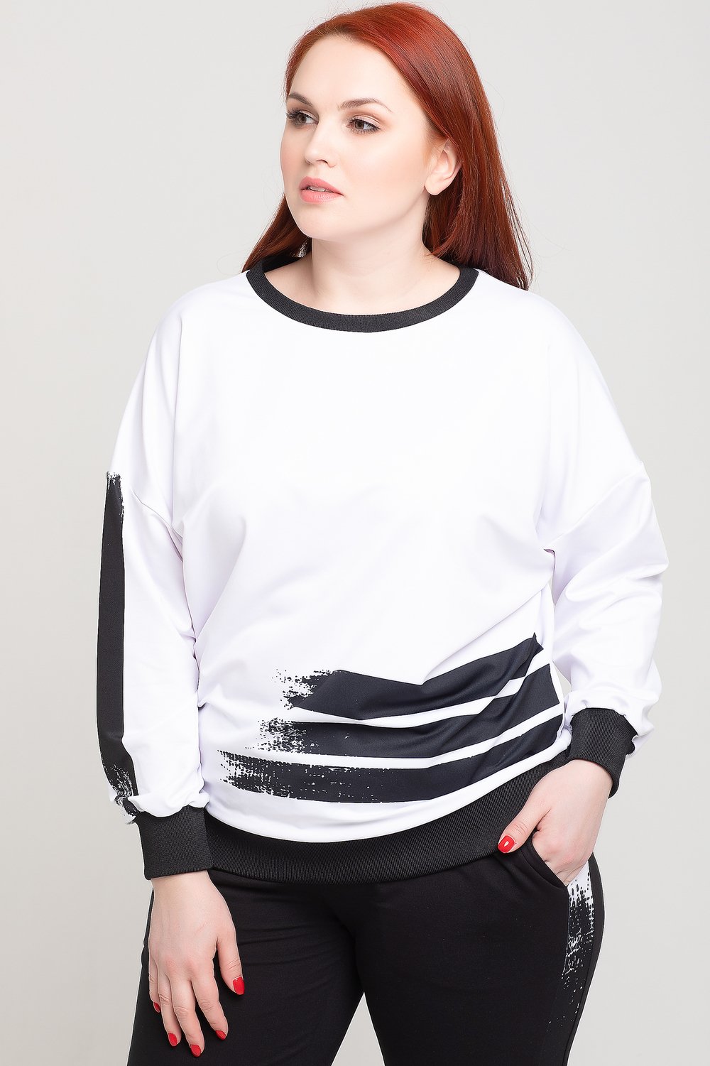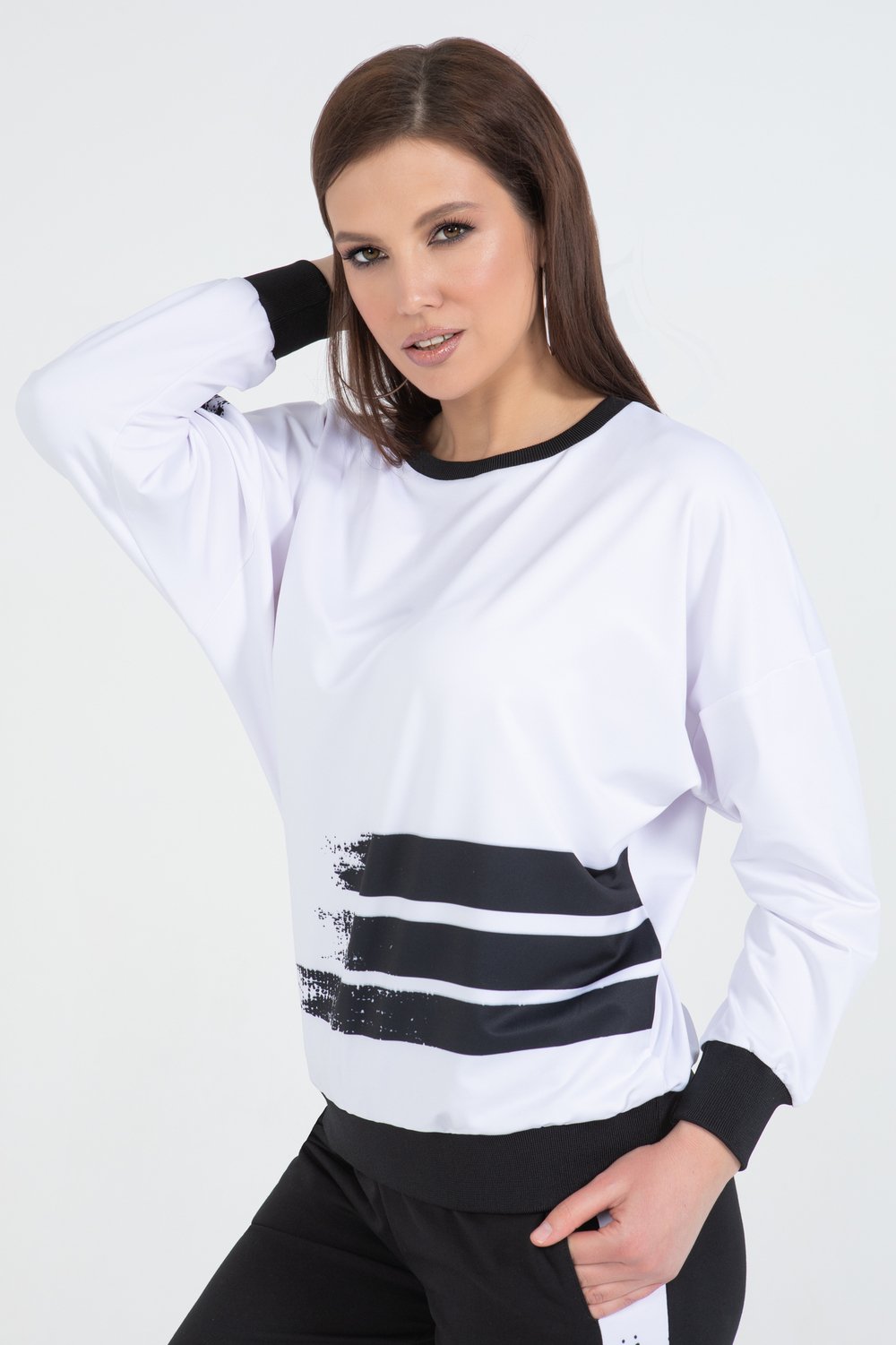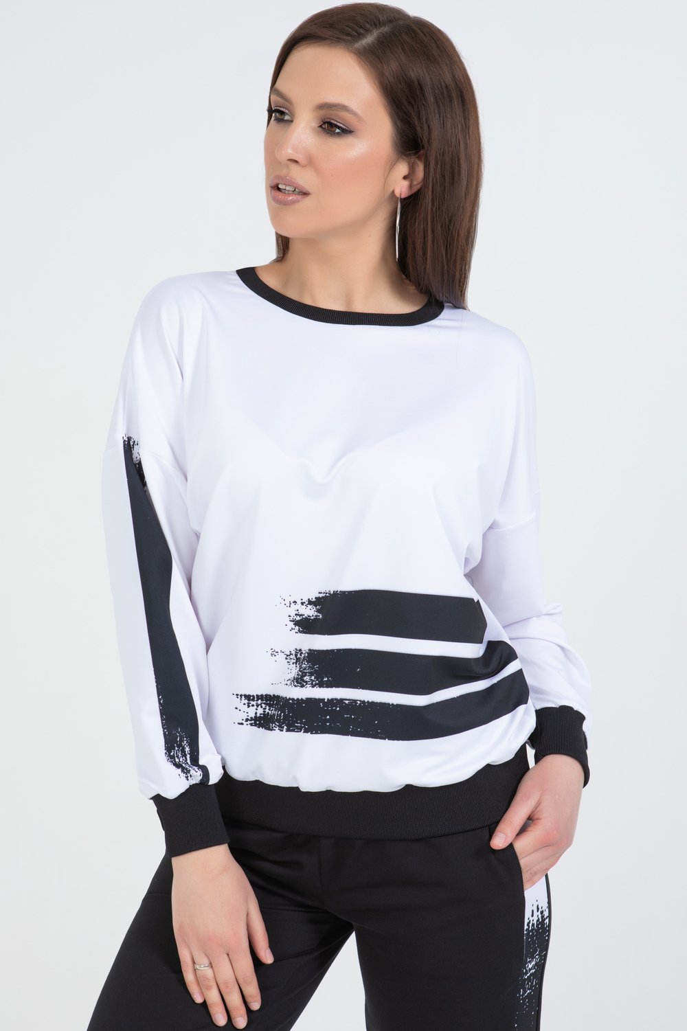 Блуза прямого силуэта. Передняя половинка с нанесением сублимационной печати. Рукав втачной, с манжетами по низу, на правом рукаве нанесение печати. Плечо спущено.Характеристики: